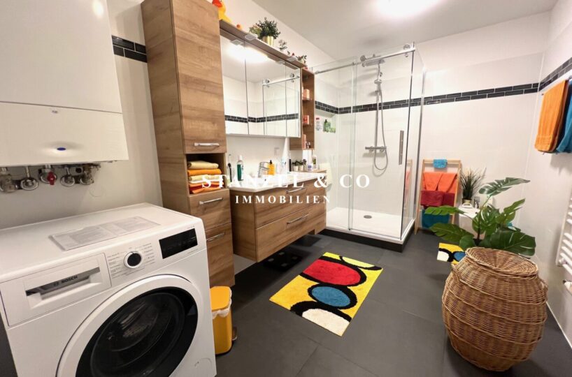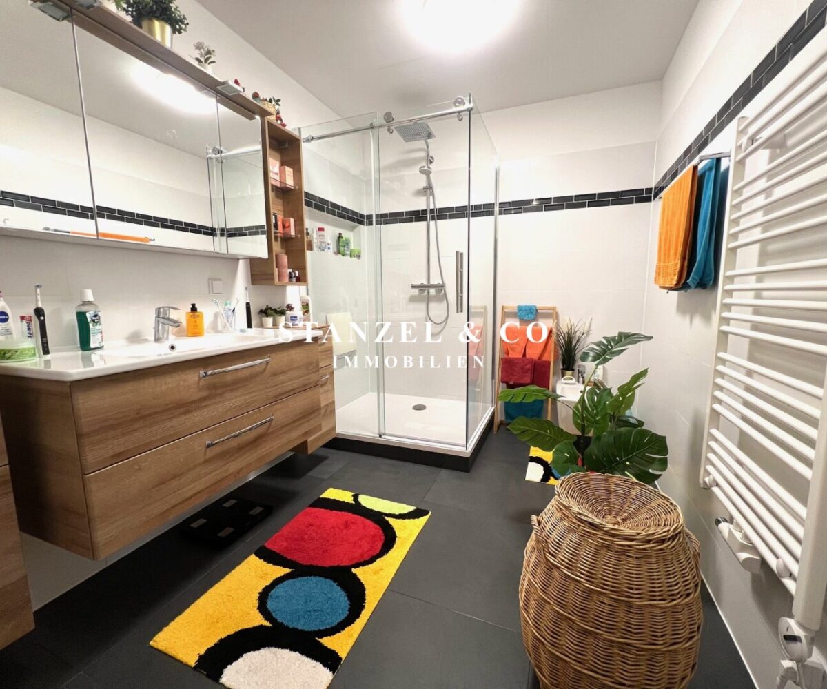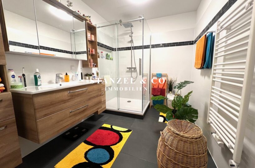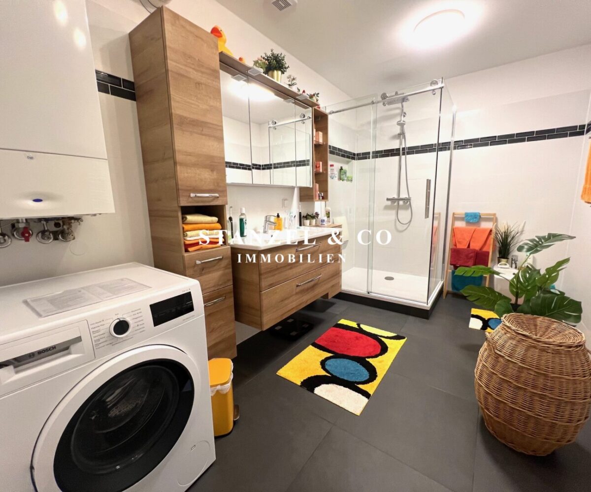 Vom 17,68m² großen Vorzimmer gelangt man in die beiden westseitigen Schlafzimmer – diese sind 16,21m² und 18,09m² groß. Das moderne 8,31m² große Bad verfügt über eine große Glasdusche mit Regenduschkopf, Handtuchtrockner, Waschbecken mit Unterschrank, Hängeschränke, Waschmaschinenanschluss, Spiegelschrank mit Beleuchtung und eine elektrische Entlüftung. Das WC mit elektrischer Entlüftung und Handwaschbecken ist separat. Es gibt einen 1,30m² großen Abstellraum sowie einen praktischen Stauraum unter der Treppe.