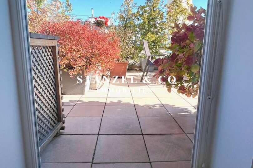 Vom großen Wohnzimmer, gelangt man auf die traumhafte 49,04m² große sonnige südostseitige Terrasse.