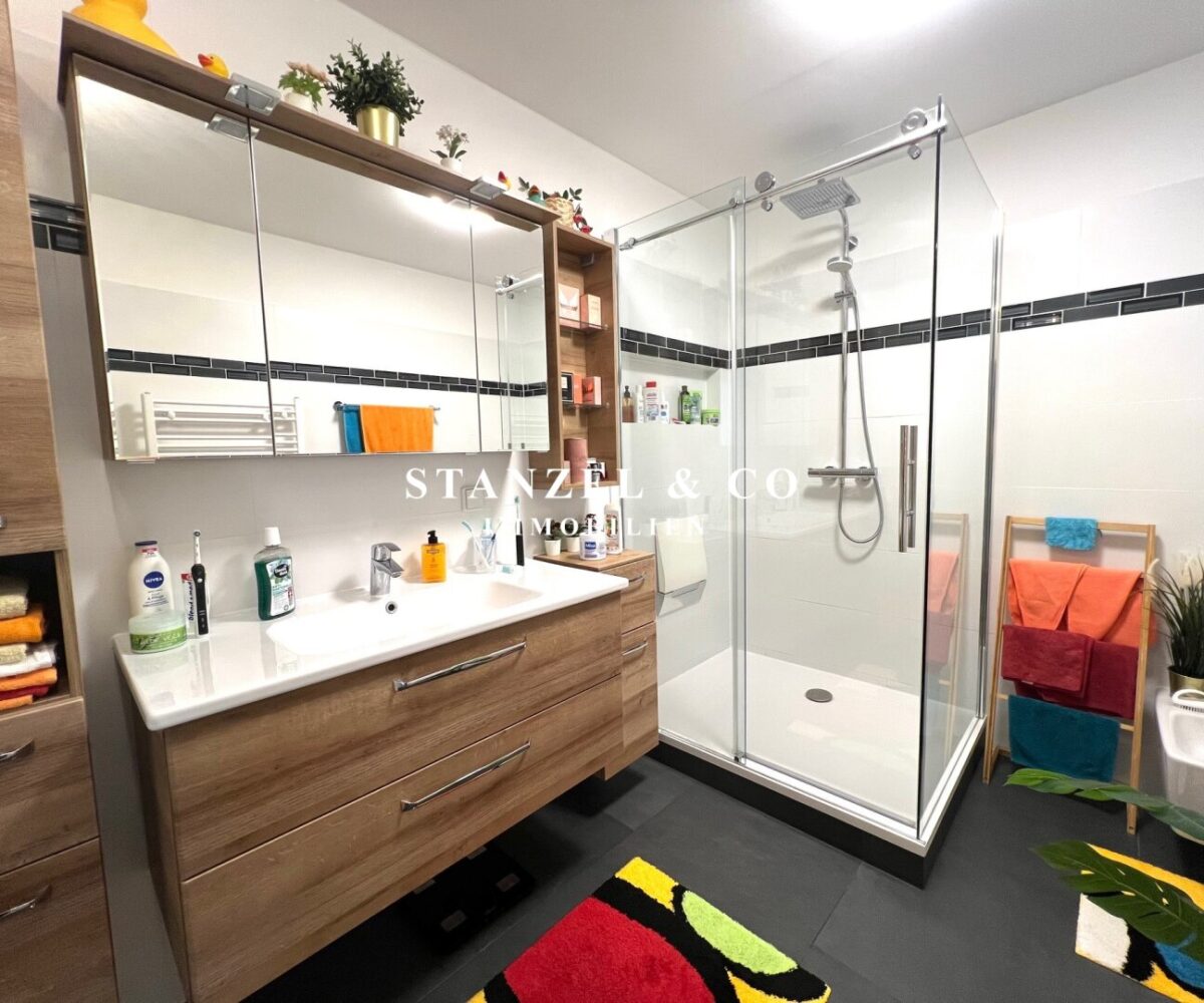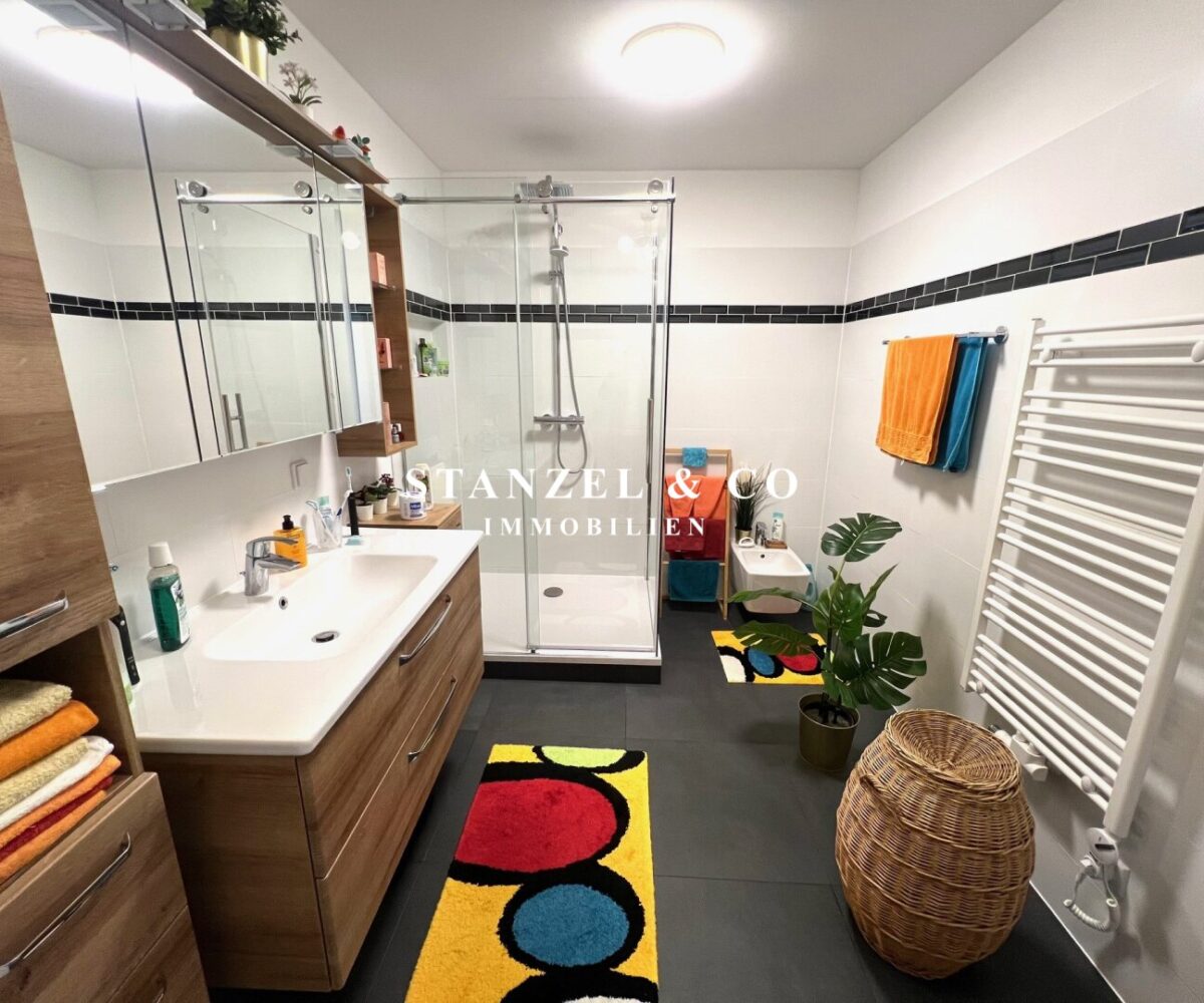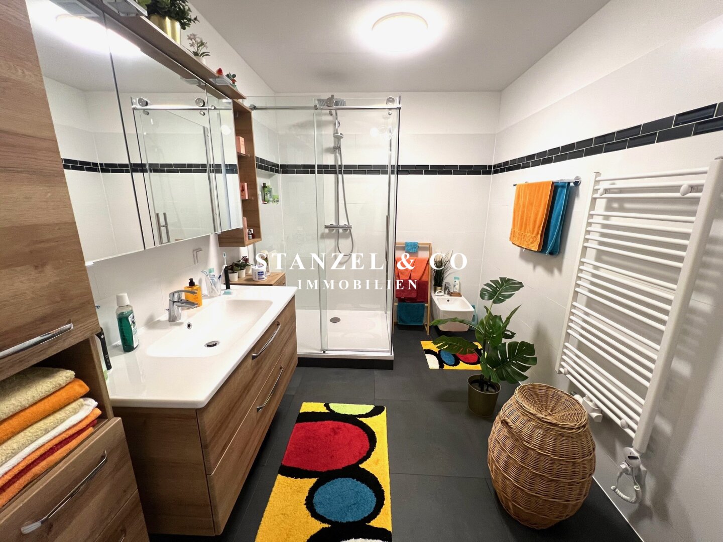 Vom 17,68m² großen Vorzimmer gelangt man in die beiden westseitigen Schlafzimmer – diese sind 16,21m² und 18,09m² groß. Das moderne 8,31m² große Bad verfügt über eine große Glasdusche mit Regenduschkopf, Handtuchtrockner, Doppelwaschbecken mit Unterschrank, Hängeschränke, Waschmaschinenanschluss, Spiegelschrank mit Beleuchtung und eine elektrische Entlüftung. Das WC mit elektrischer Entlüftung und Handwaschbecken ist separat. Es gibt einen 1,30m² großen Abstellraum sowie einen praktischen Stauraum unter der Treppe.