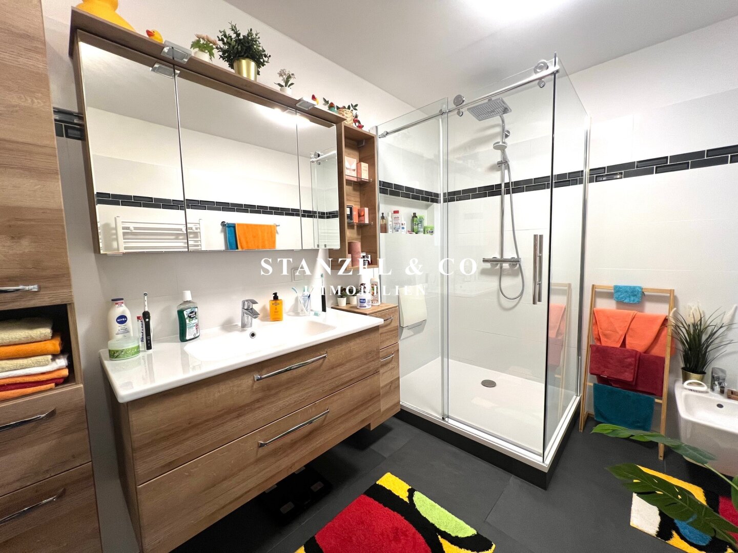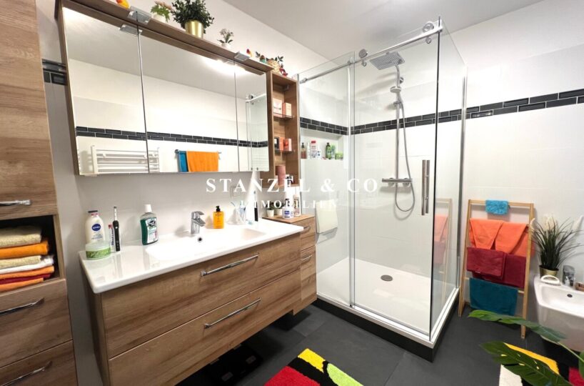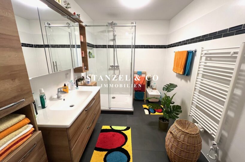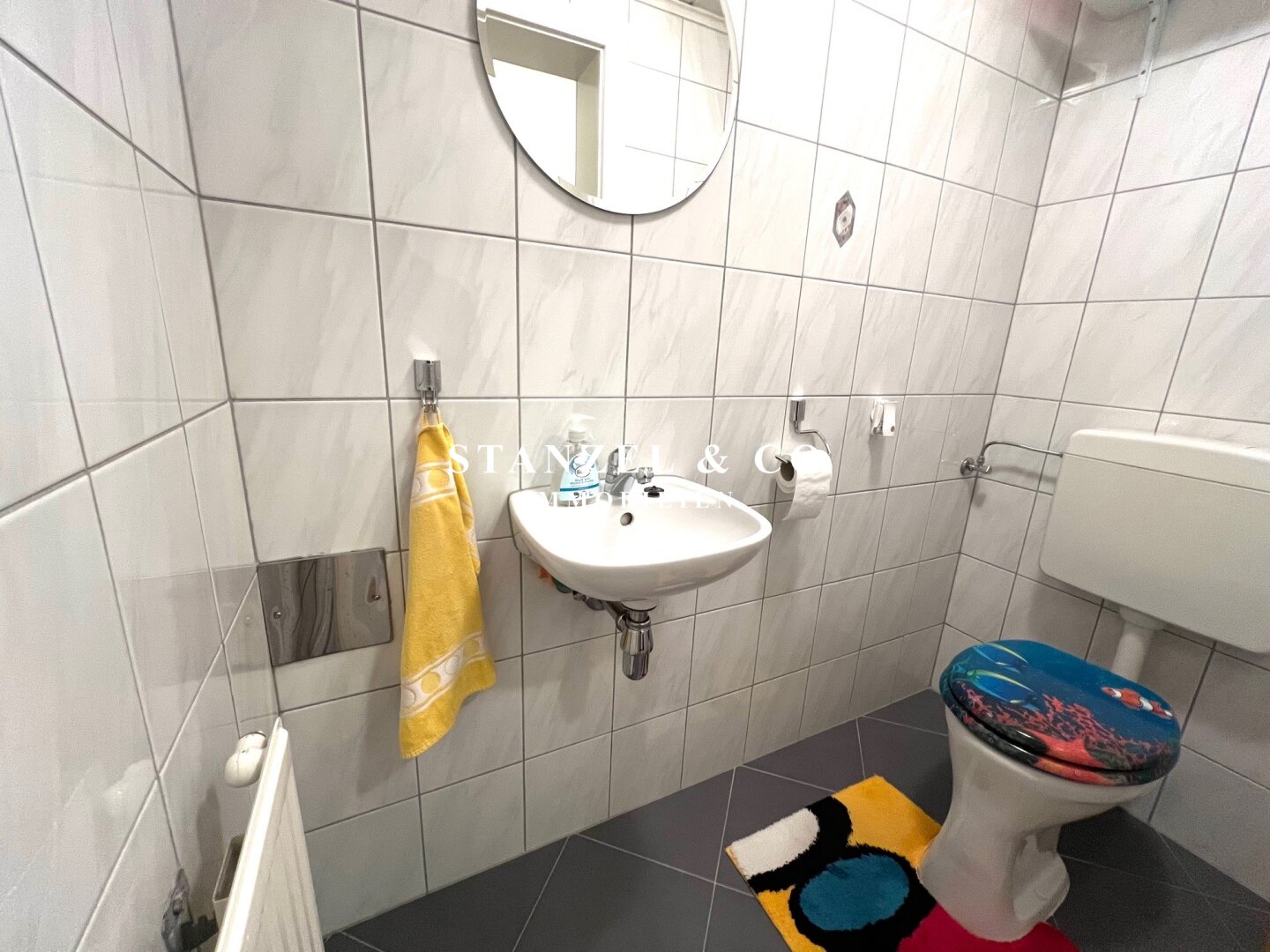 Vom 17,68m² großen Vorzimmer gelangt man in die beiden westseitigen Schlafzimmer – diese sind 16,21m² und 18,09m² groß. Das moderne 8,31m² große Bad verfügt über eine große Glasdusche mit Regenduschkopf, Handtuchtrockner, Doppelwaschbecken mit Unterschrank, Hängeschränke, Waschmaschinenanschluss, Spiegelschrank mit Beleuchtung und eine elektrische Entlüftung. Das WC mit elektrischer Entlüftung und Handwaschbecken ist separat. Es gibt einen 1,30m² großen Abstellraum sowie einen praktischen Stauraum unter der Treppe.