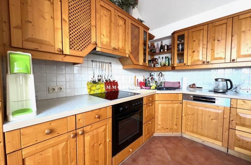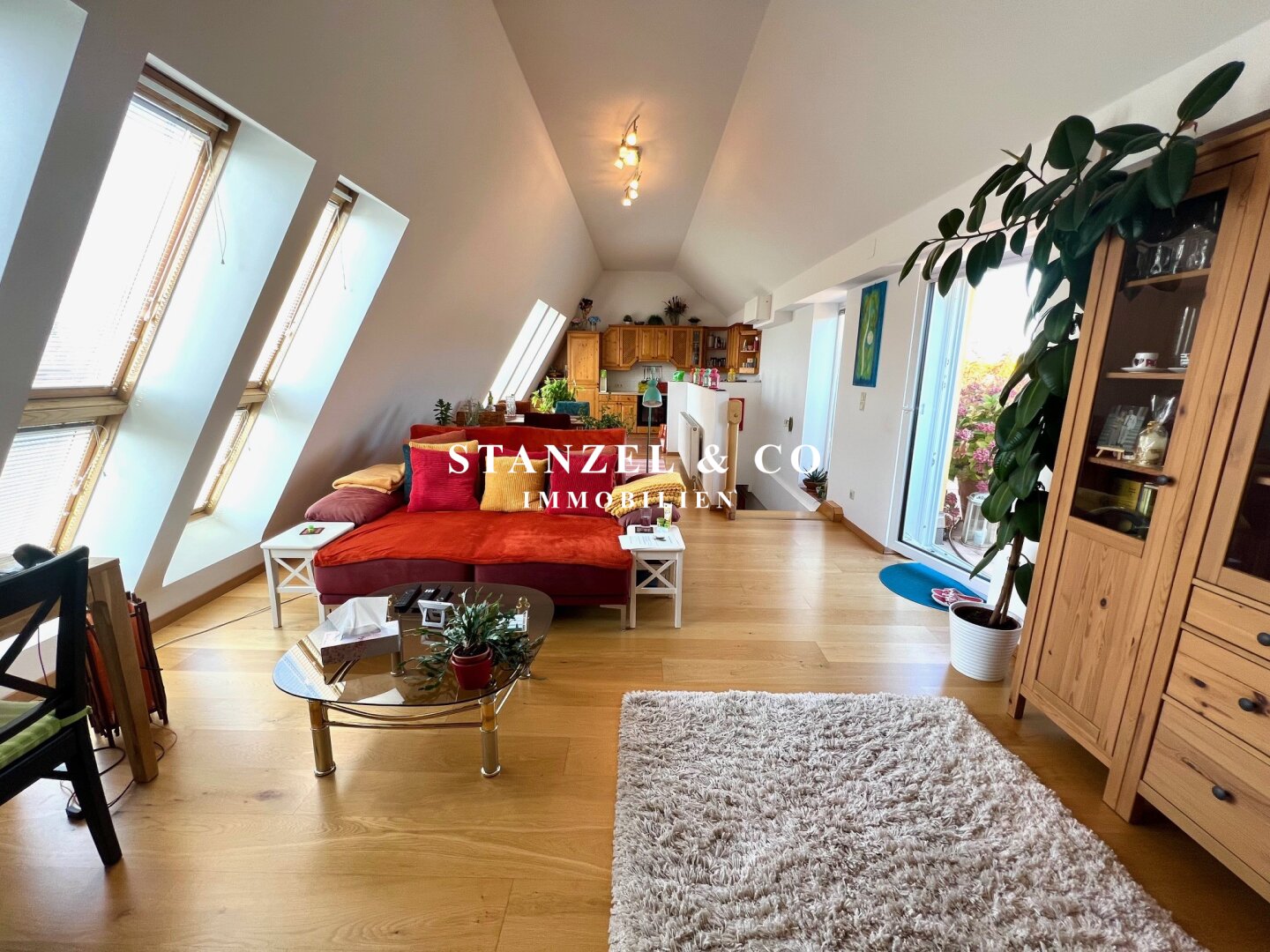 Das sonnige, loftartige 45m² große, ost- und westseitig orientierte Wohnesszimmer, ist mit einer offenen ( älteren ) Holzküche versehen.
