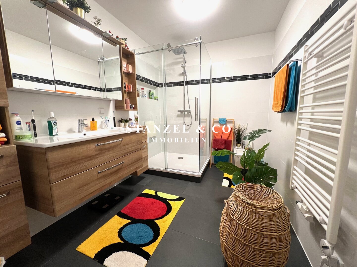 Vom 17,68m² großen Vorzimmer gelangt man in die beiden westseitigen Schlafzimmer – diese sind 16,21m² und 18,09m² groß. Das moderne 8,31m² große Bad verfügt über eine große Glasdusche mit Regenduschkopf, Handtuchtrockner, Waschbecken mit Unterschrank, Hängeschränke, Waschmaschinenanschluss, Spiegelschrank mit Beleuchtung und eine elektrische Entlüftung. Das WC mit elektrischer Entlüftung und Handwaschbecken ist separat. Es gibt einen 1,30m² großen Abstellraum sowie einen praktischen Stauraum unter der Treppe.