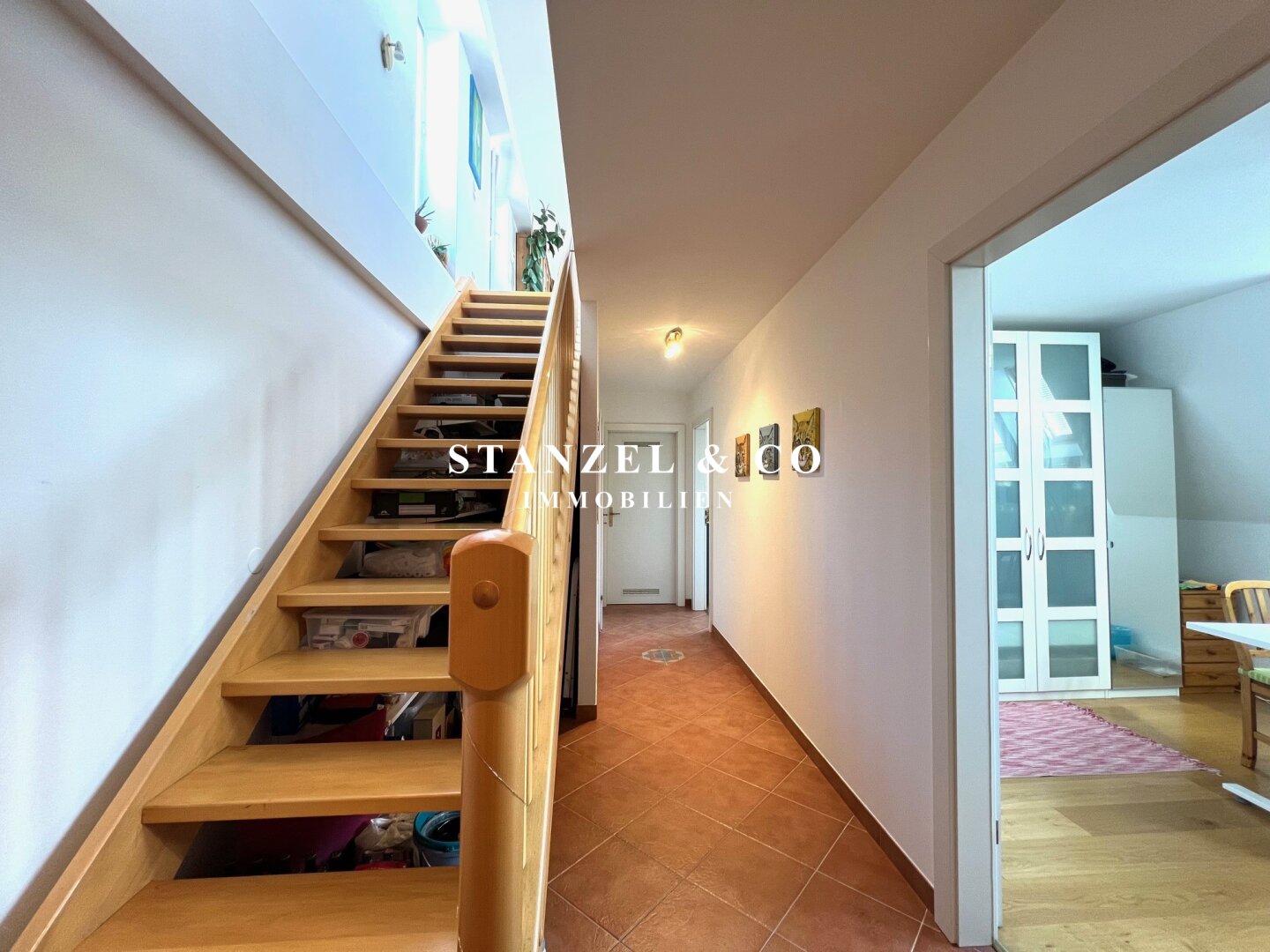Eine Holztreppe verbindet das UG mit dem OG.