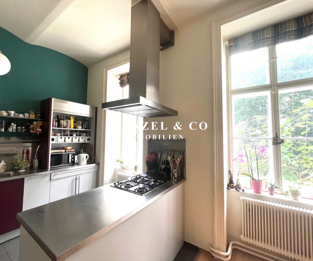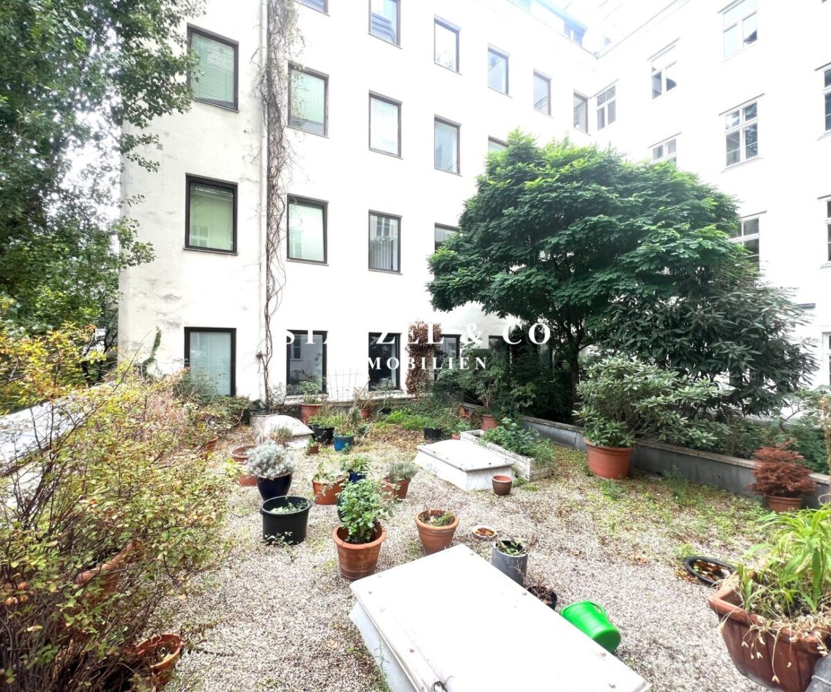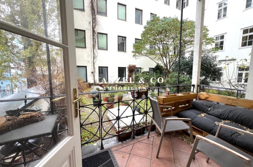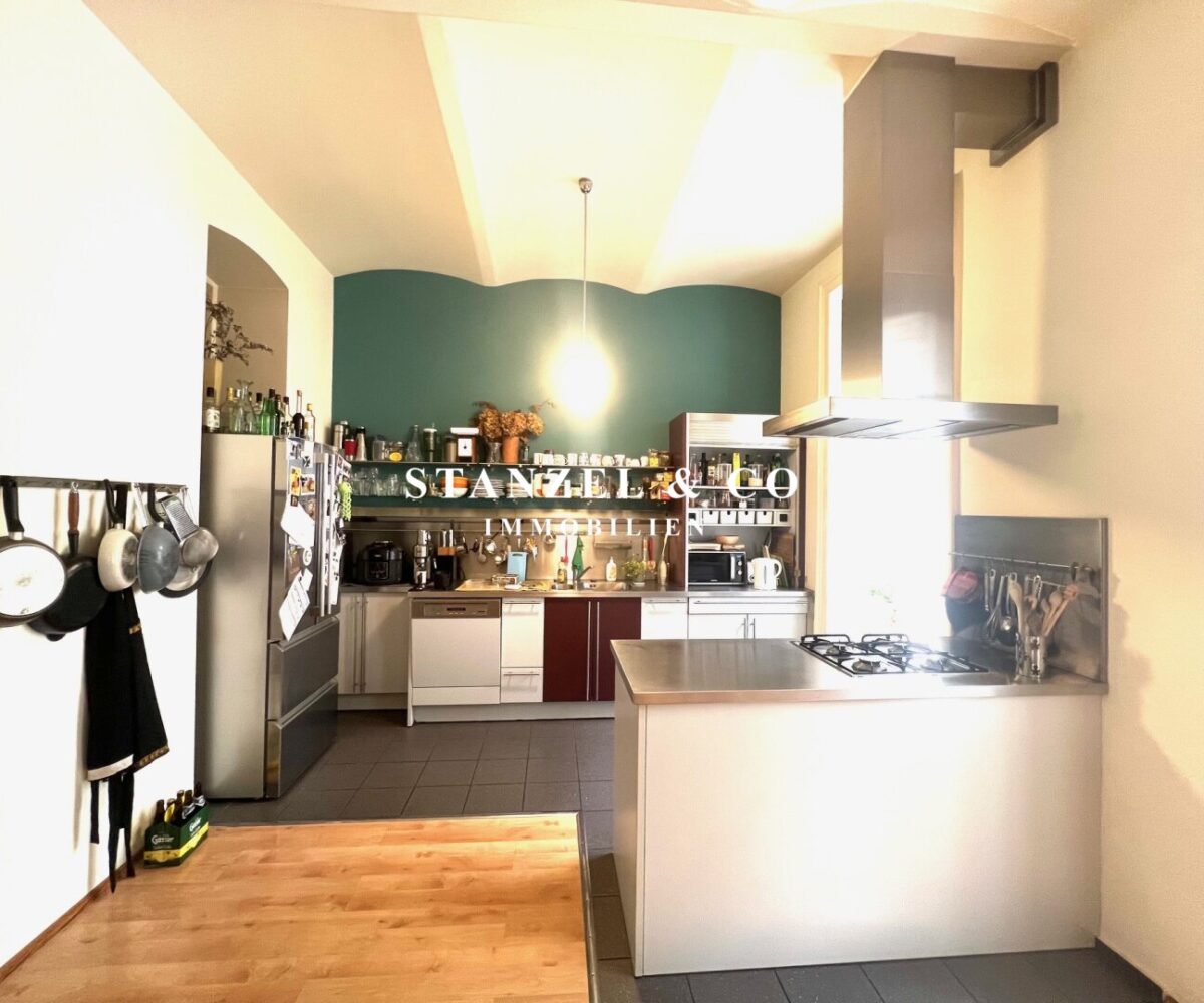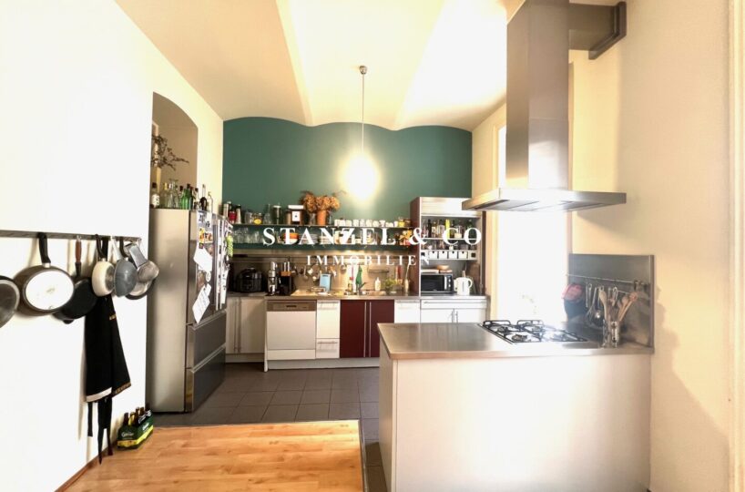 Von der 16m² großzügigen Diele gelangt man in das 29m² große, südwestseitige Wohnzimmer, das mit einem 21m² großen Zimmer verbunden ist. Die 20m² große, gartenseitige Wohnküche ist mit einer Bulthaup-Küche ( Miele-Geräte) und mit einem Tonnengewölbe ausgestattet. Das 25m² große Schlafzimmer orientiert sich nach Südwesten – das zweite 25m² große, innenhofseitige Schlafzimmer verfügt über einen anschließenden ca. 5m² großen gartenseitigen Balkon und hat einen direkten Zugang in den begrünten Innenhof. Das Badezimmer mit Fenster ist 5m² groß und mit einer Dusche, einem Doppelwaschtisch und einem großzügigen Spiegel versehen.