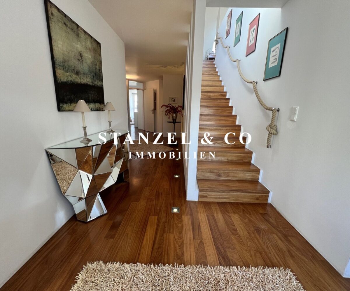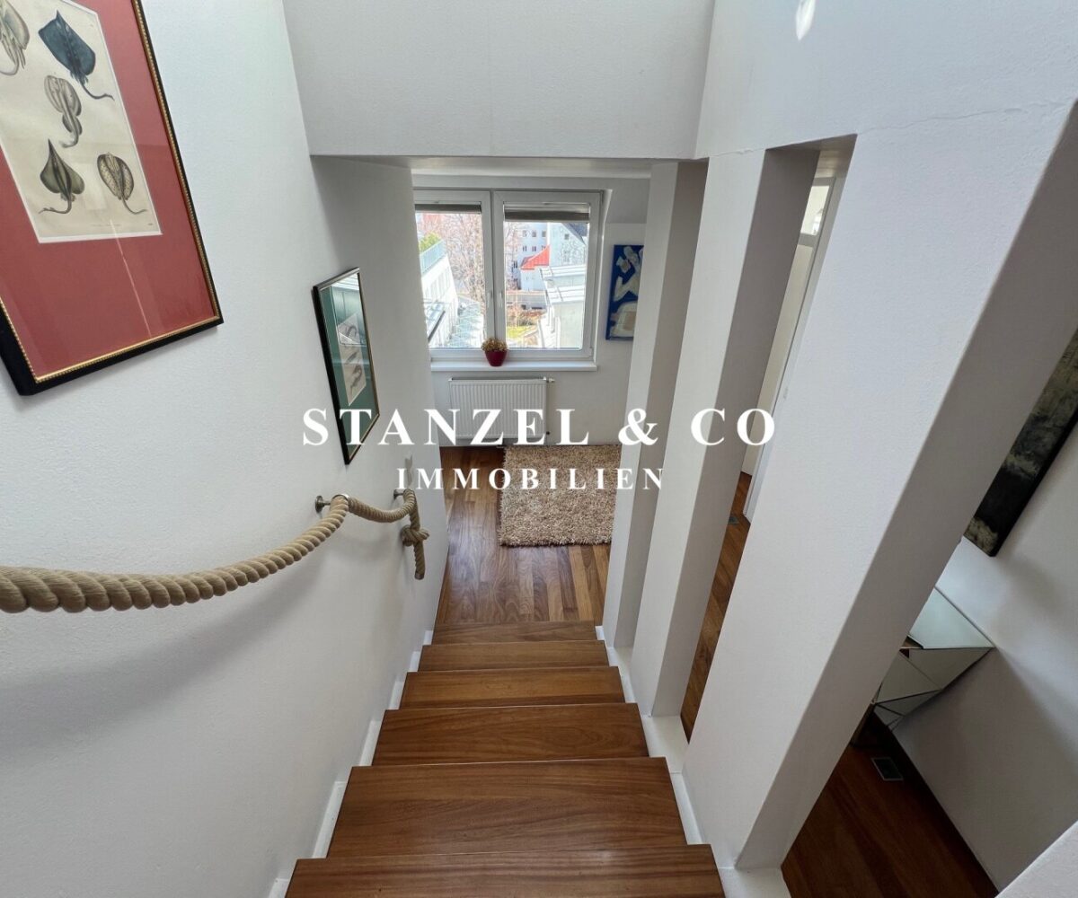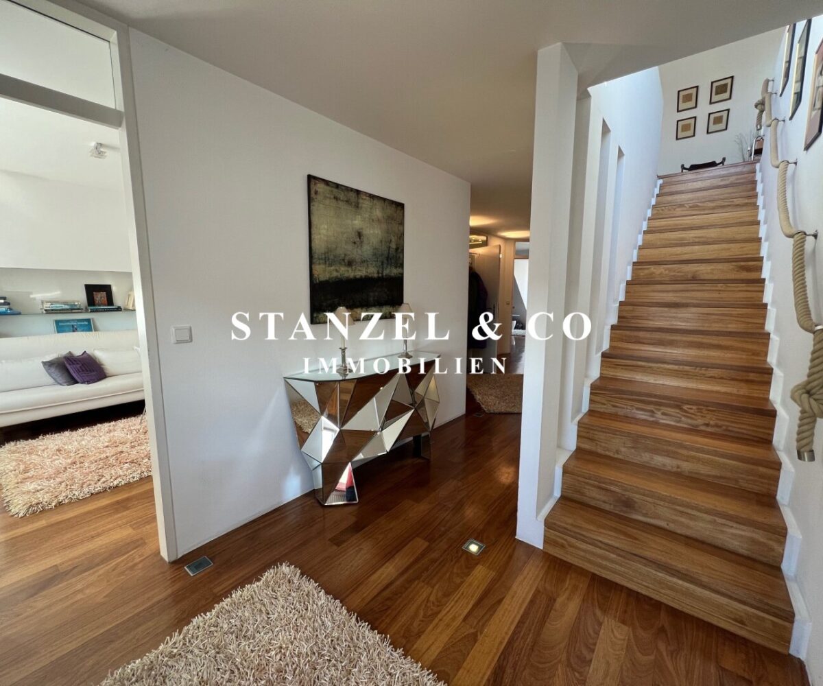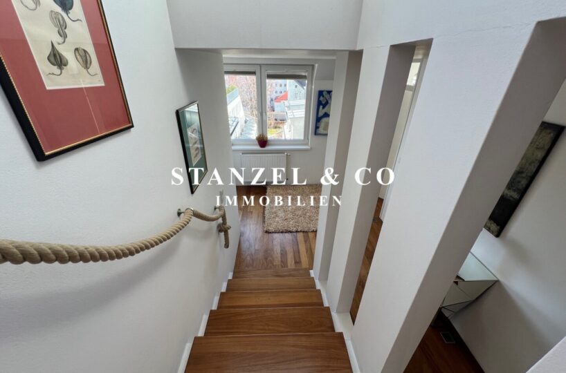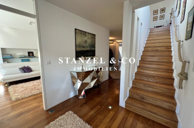 Eine geschmackvolle Treppe verbindet die Schlafebene mit der Wohnebene.
