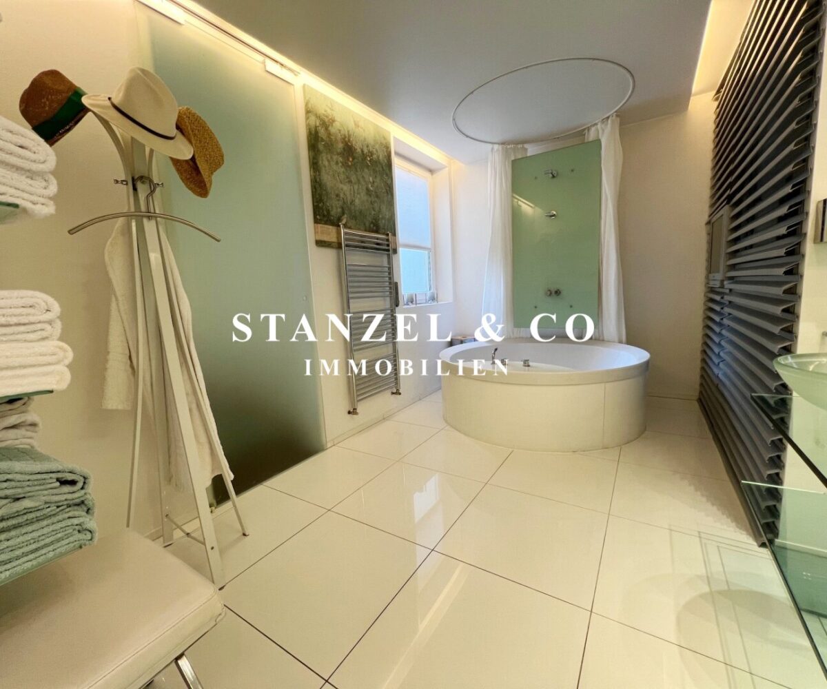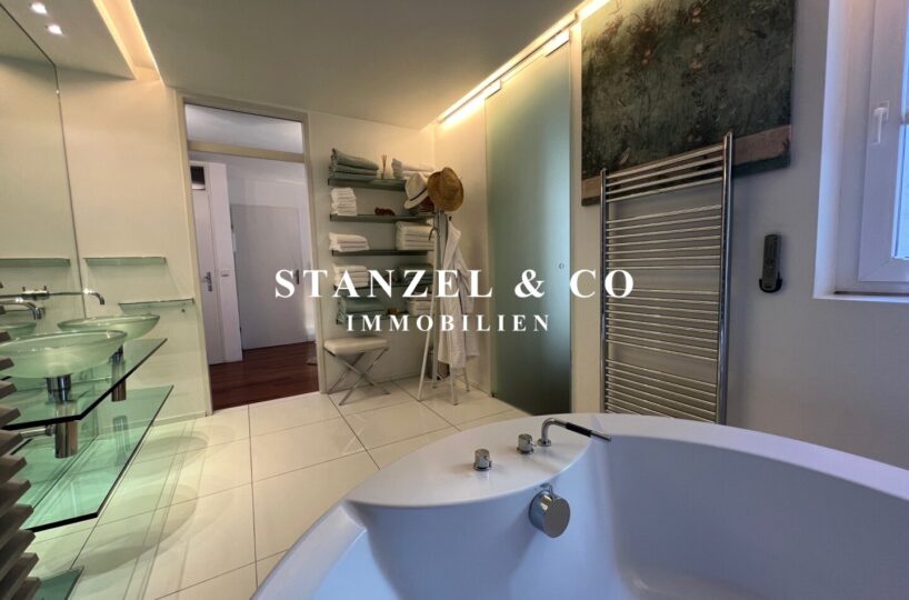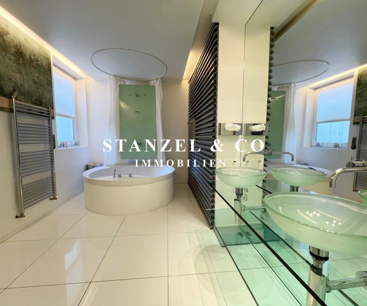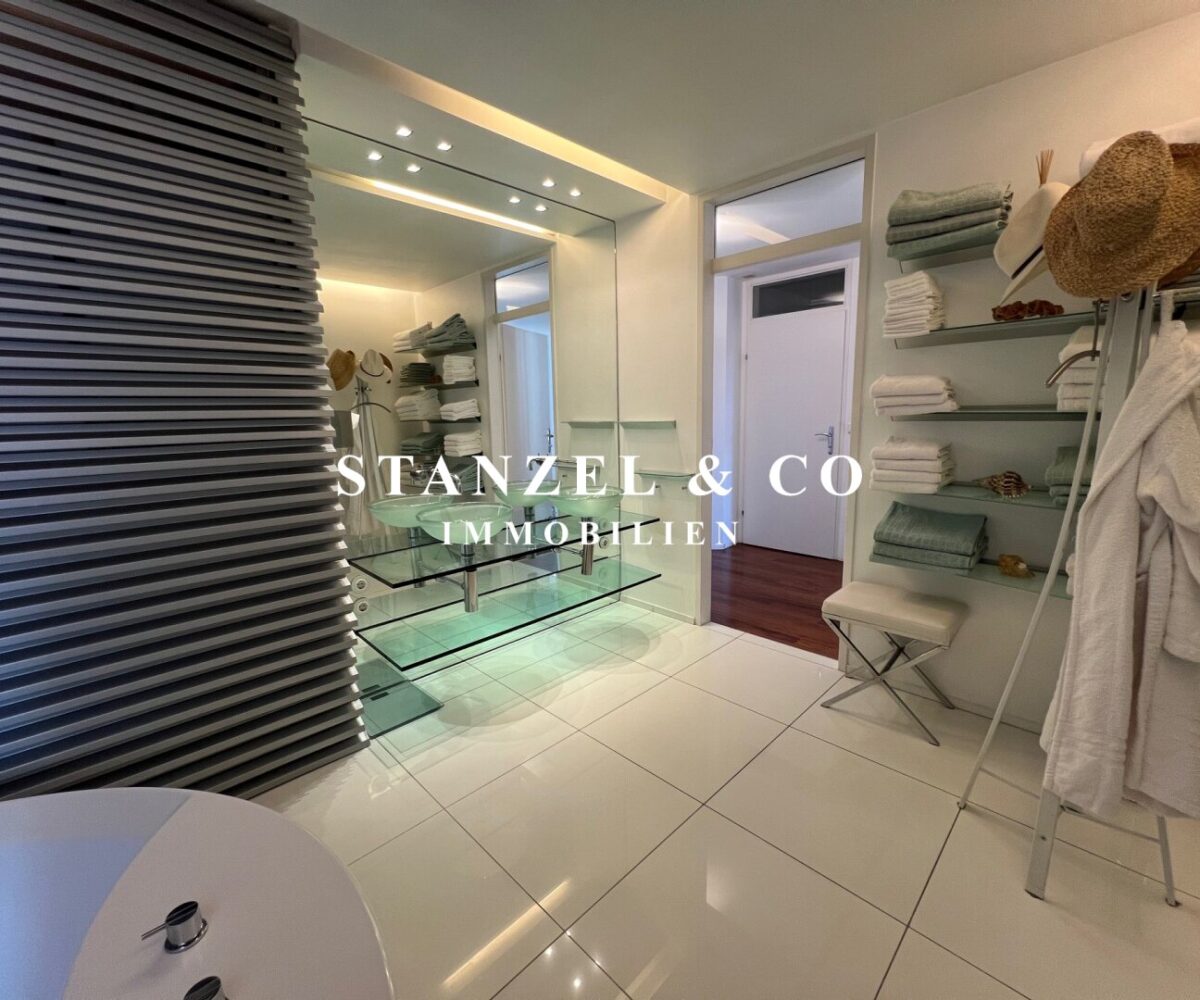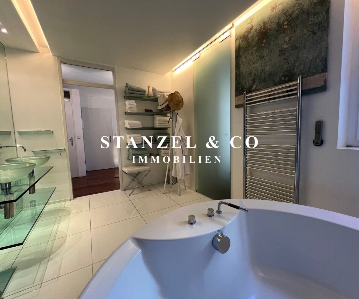 Vom Vorzimmer gelangt man in die beiden Schlafzimmer. Das südwestseitige 18m² Schlafzimmer verfügt über eine anschließende begehbare Garderobe. En-Suite gelangt man in das anschließende große Badezimmer mit Fenster. Es ist mit einer großen runden Designer – Badewanne mit Dusche, einem Fenster, einem Glas-Doppelwaschtisch, großzügigem Spiegel und Handtuchtrockner ausgestattet. Zusätzlich befindet sich im Badezimmer die Haustechnik – die Gas-Etagenheizung sowie ein zusätzlicher Warmwasserspeicher – es gäbe auch die Option ein zusätzliches WC unterzubringen und es gibt eine separat zuschaltbare Fußbodenheizung.