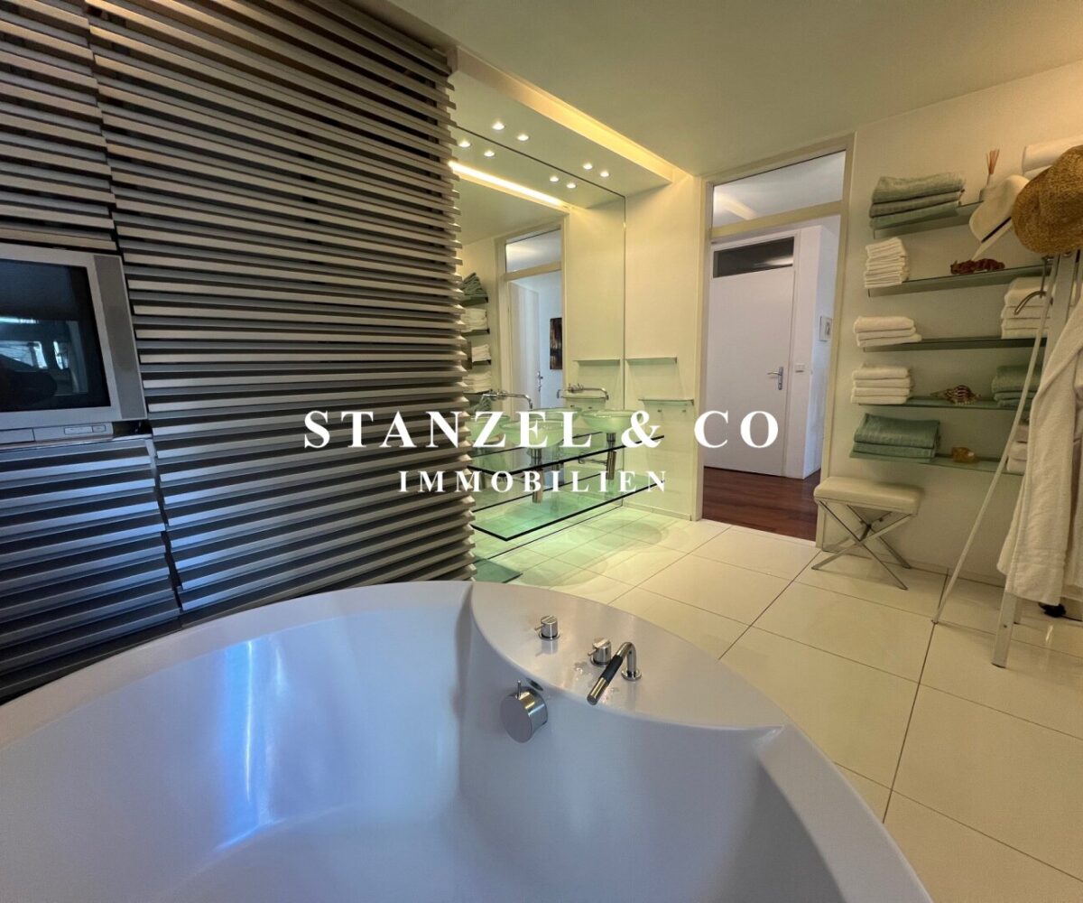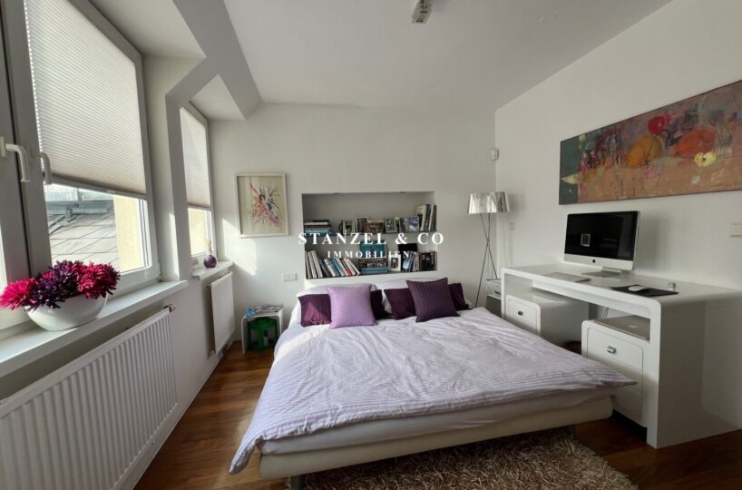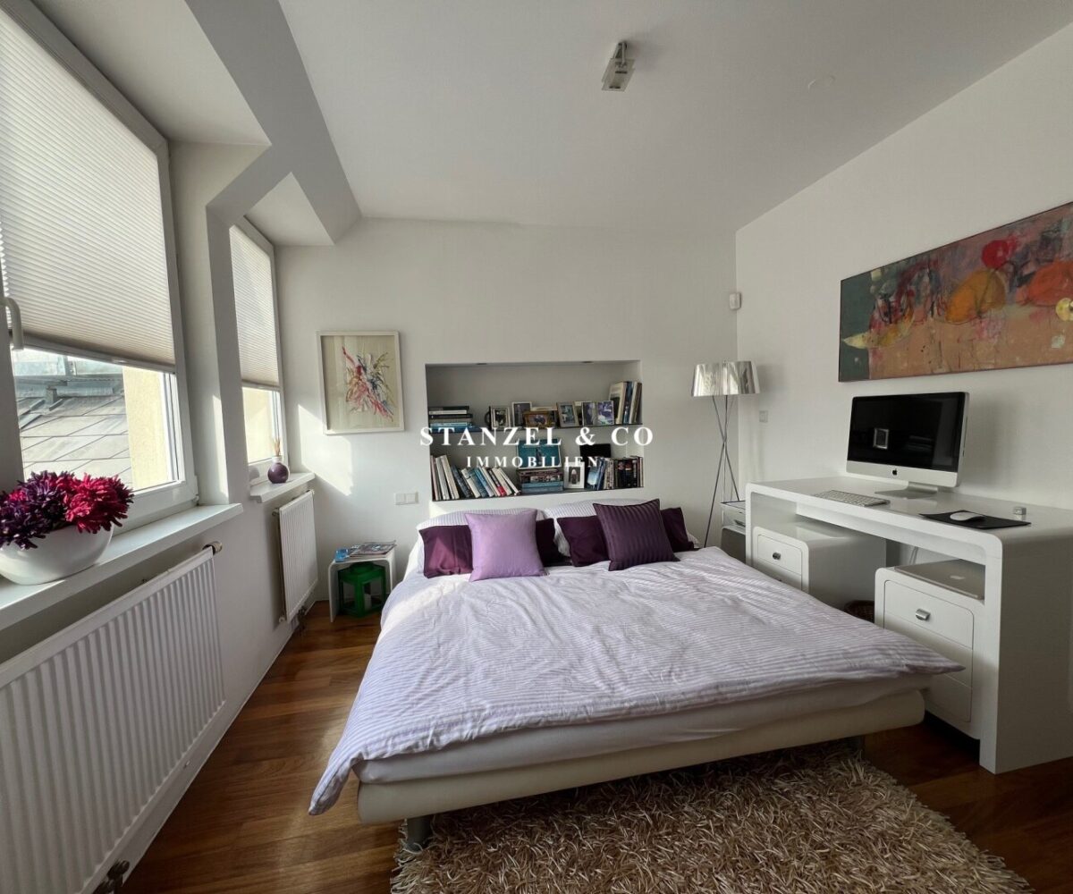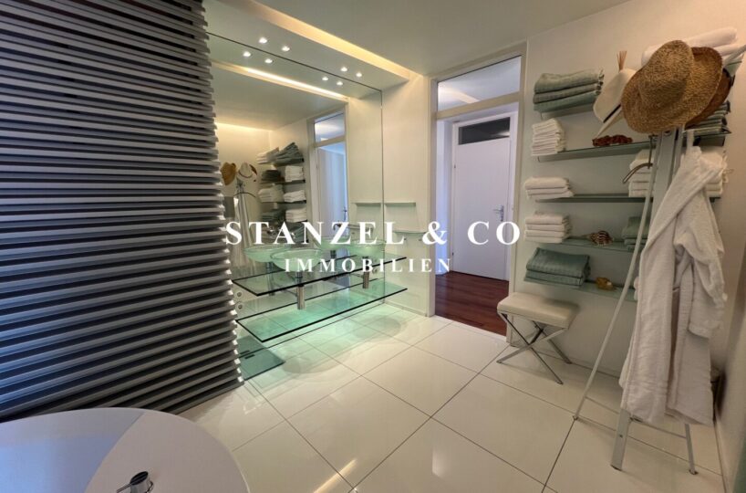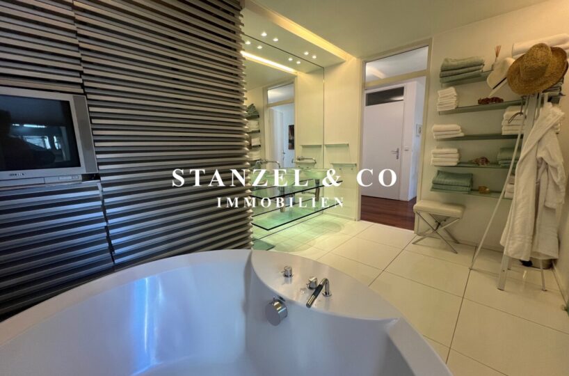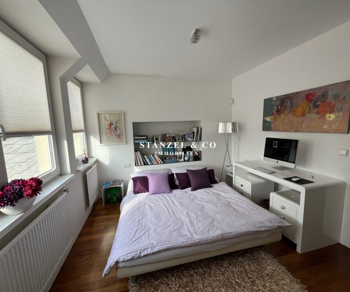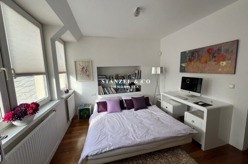 Vom Vorzimmer gelangt man in die beiden Schlafzimmer. Das südwestseitige 18m² Schlafzimmer verfügt über eine anschließende begehbare Garderobe. En-Suite gelangt man in das anschließende große Badezimmer mit Fenster. Es ist mit einer großen runden Designer – Badewanne mit Dusche, einem Fenster, einem Glas-Doppelwaschtisch, großzügigem Spiegel und Handtuchtrockner ausgestattet. Zusätzlich befindet sich im Badezimmer die Haustechnik – die Gas-Etagenheizung sowie ein zusätzlicher Warmwasserspeicher – es gäbe auch die Option ein zusätzliches WC unterzubringen und es gibt eine separat zuschaltbare Fußbodenheizung.