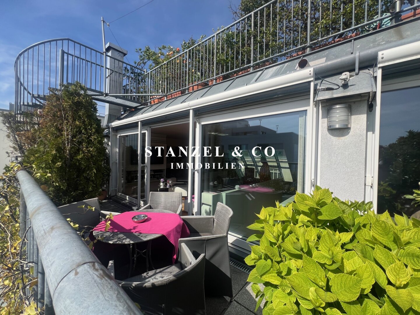 Von der an den Wohnsalon angrenzenden südwestseitigen Terrasse gelangt man über eine Wendeltreppe auf die 49m² große Dachterrasse mit herrlichem Panoramablick. Die Sonnenterrasse bietet einen traumhaften Rundum- sowie Fernblick. Ein elektrisches Sonnensegel ( Bespannung muss erneuert werden ) dient als Sonnenschutz. Die 49m² Terrasse verfügt über einen Süd-West und Nord-Ost-seitigen unverbaubaren Blick.