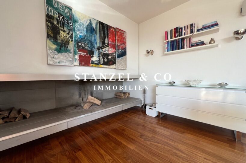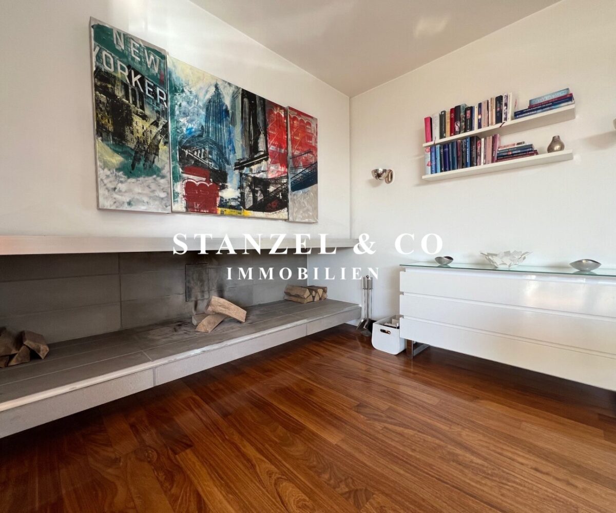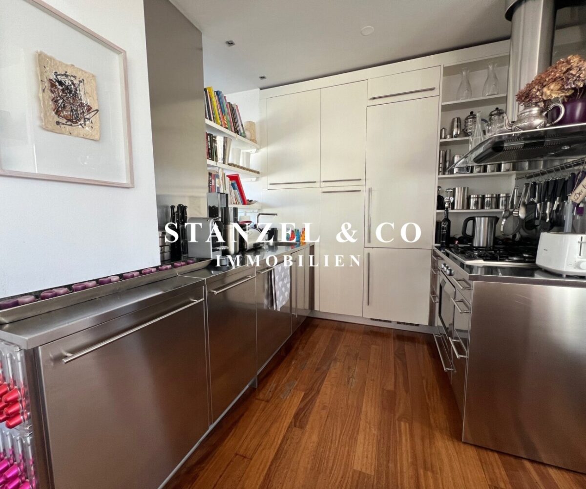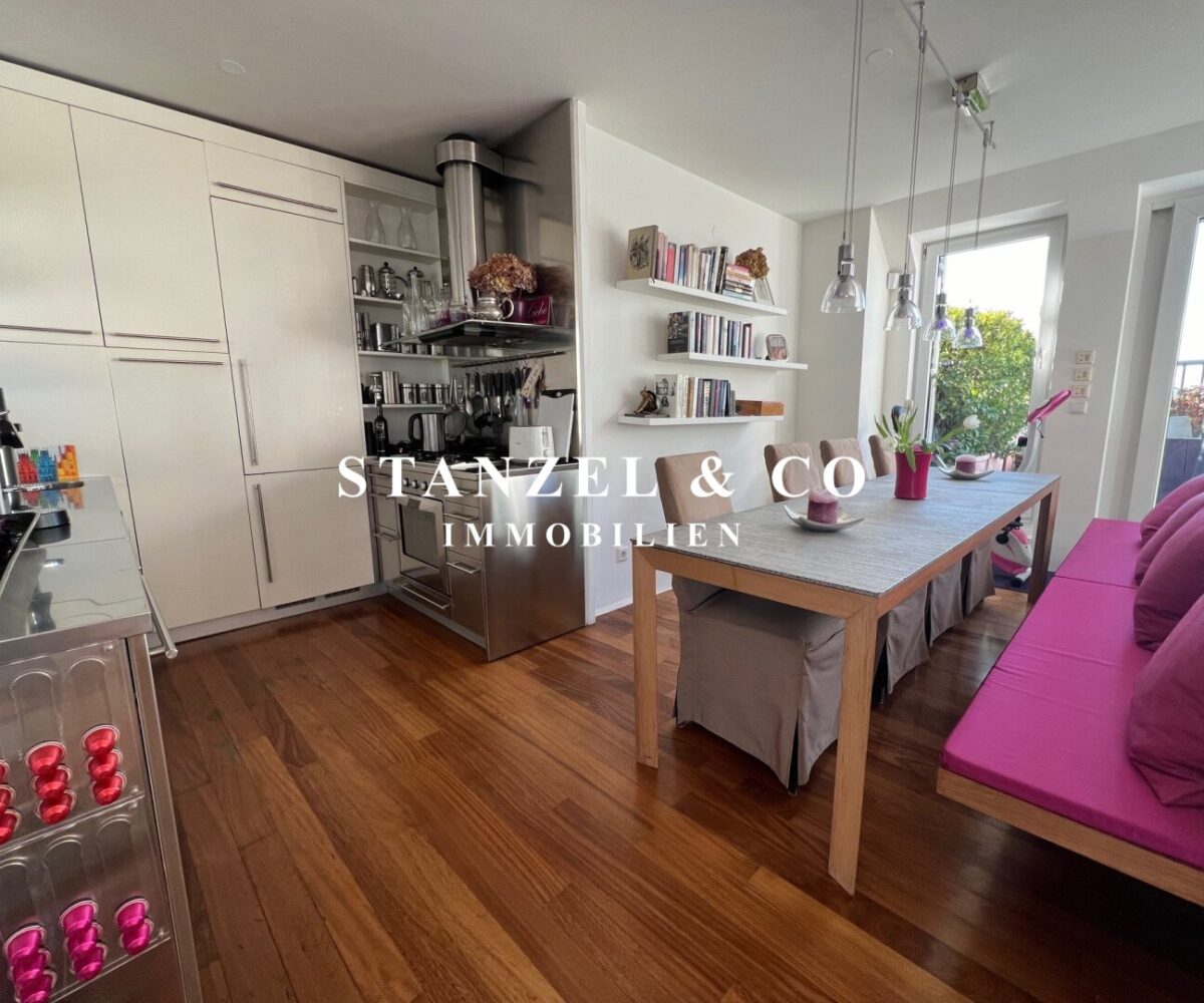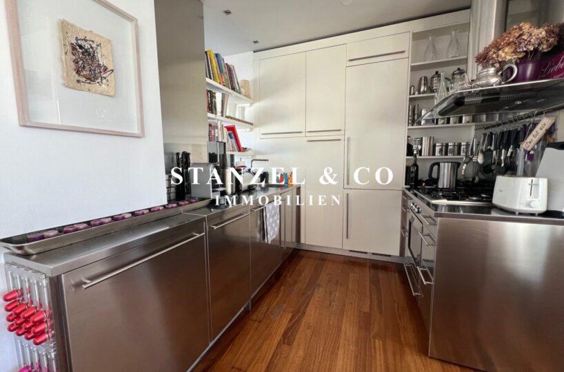 Das 80m² große, sonnige und loftartige Wohnesszimmer ist durch Glasschiebetüren mit der 26m² hofseitigen Süd-West-Terrasse verbunden. Der großzügige Wohnsalon verfügt über einen eleganten, offenen Kamin und eine moderne integrierte Alu-Küche, die mit einem Gas-Herd, Backrohr, großer Kühlgefrierkombination und Geschirrspüler ausgestattet ist.