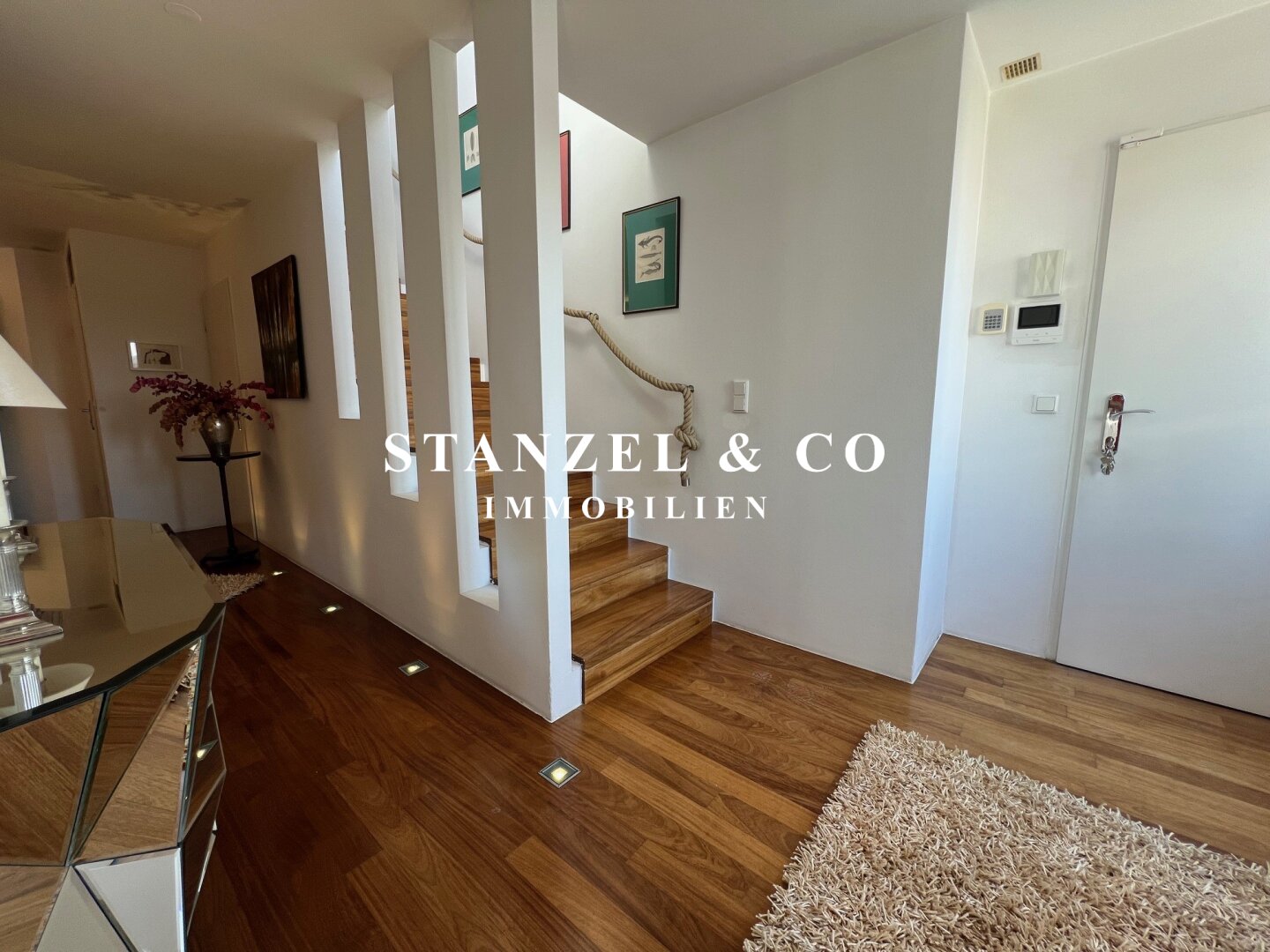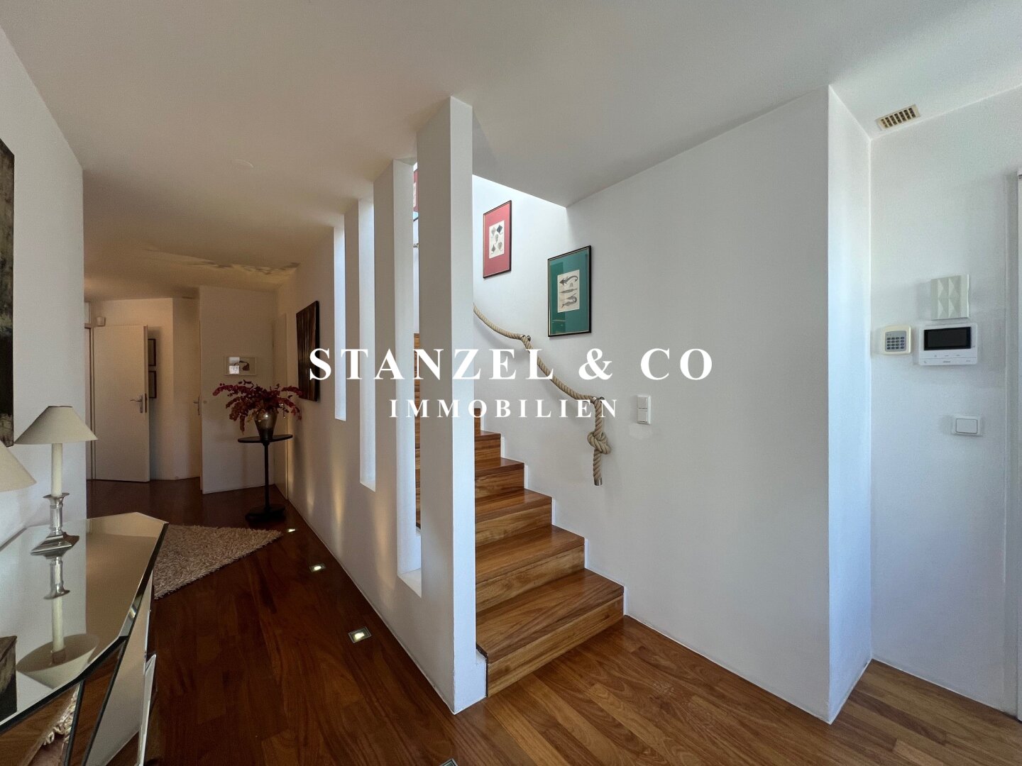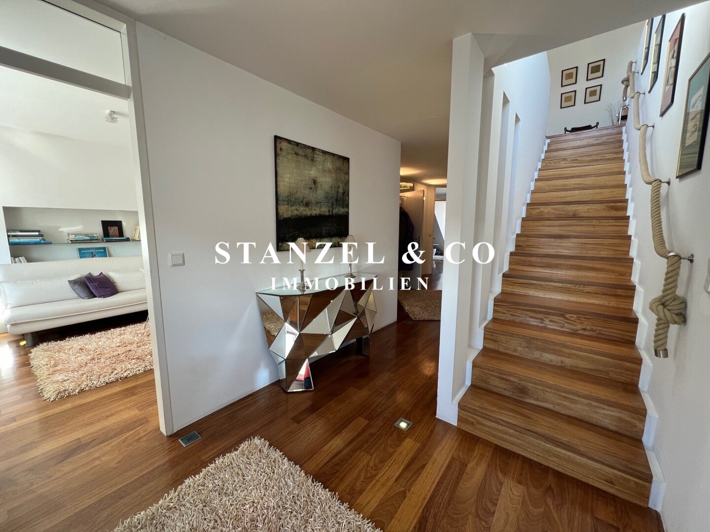 Eine geschmackvolle Treppe verbindet die Schlafebene mit der Wohnebene.
