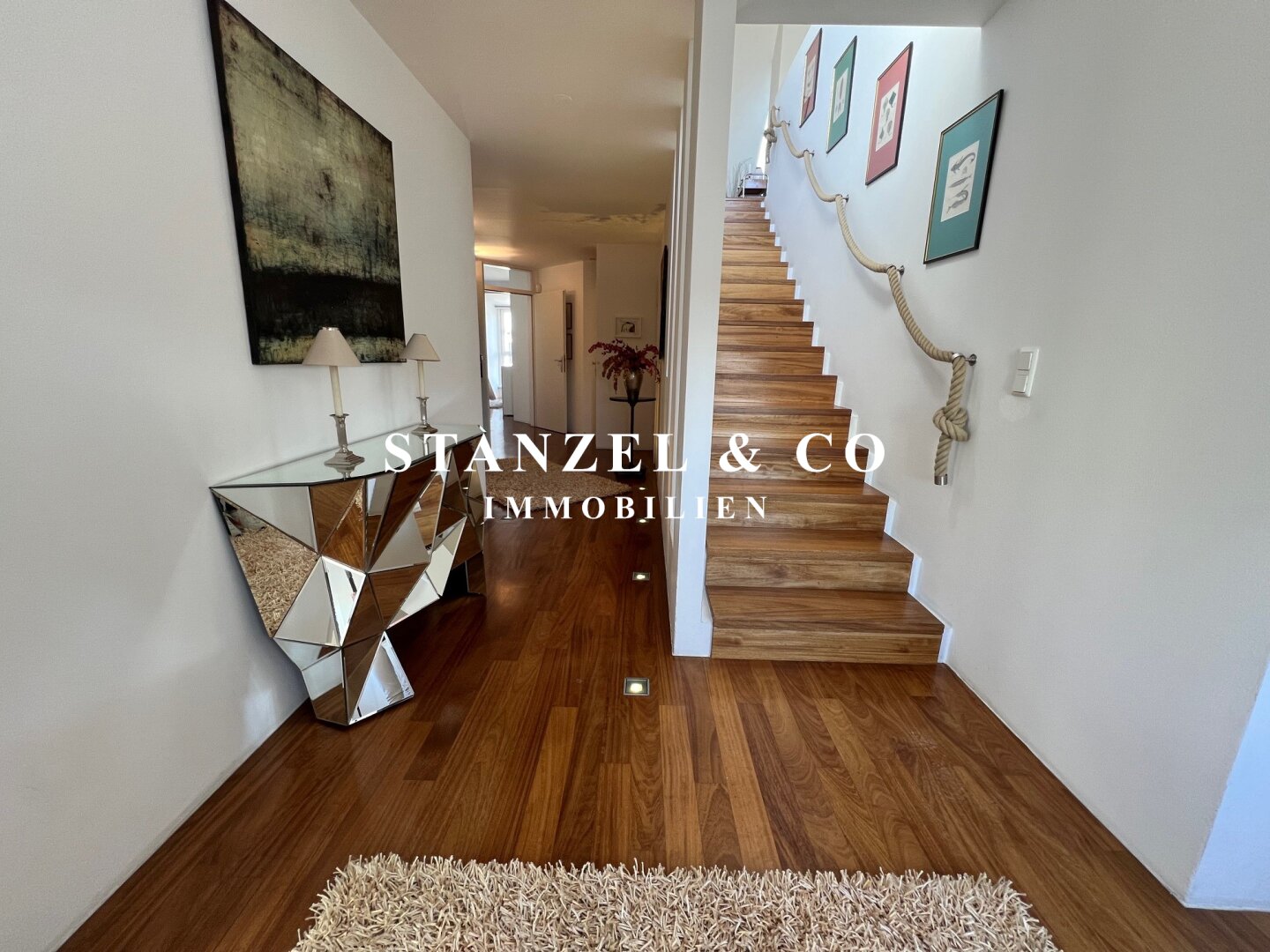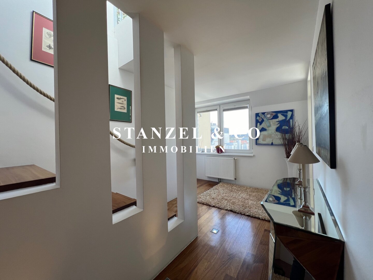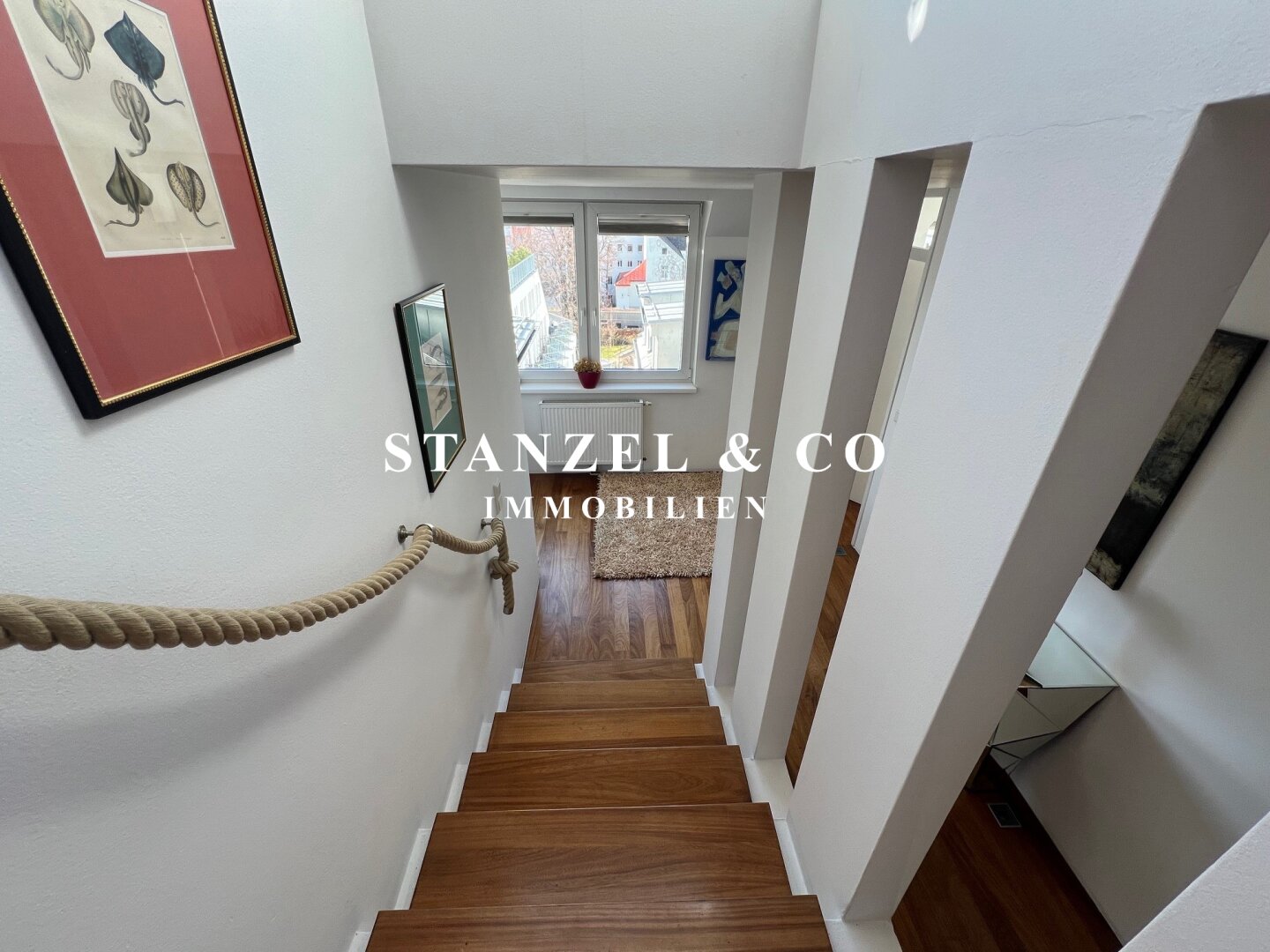Eine geschmackvolle Treppe verbindet die Schlafebene mit der Wohnebene.