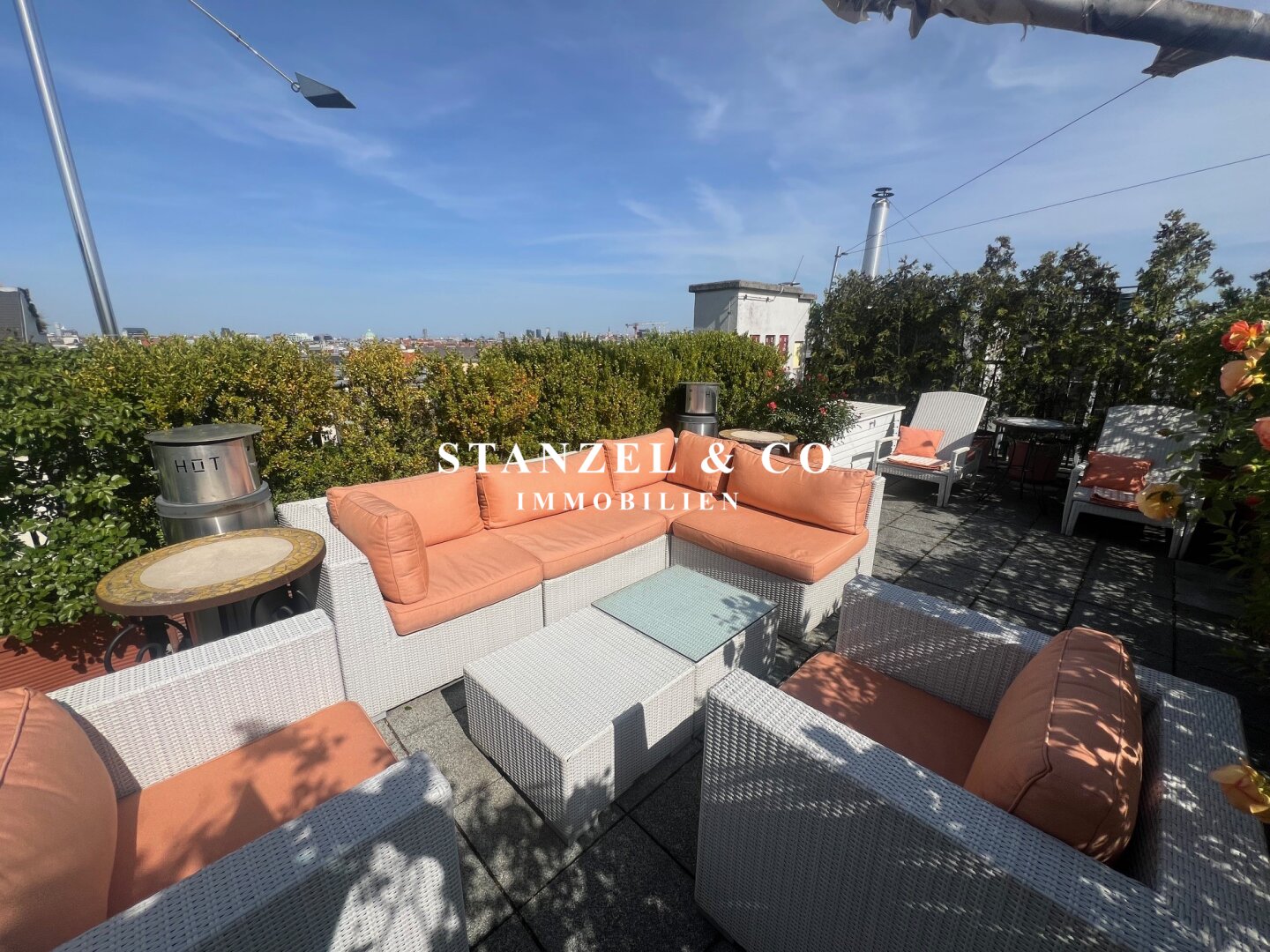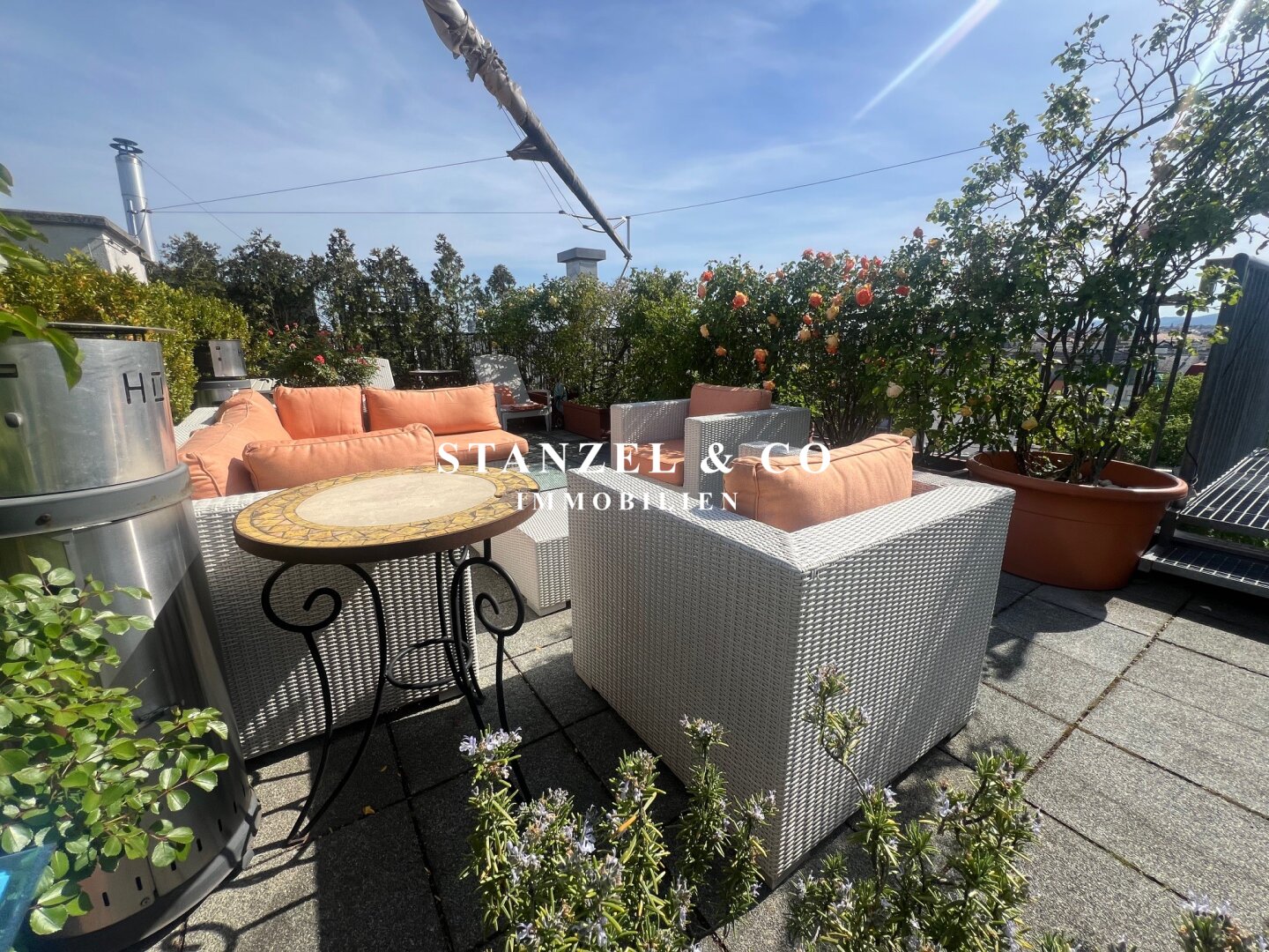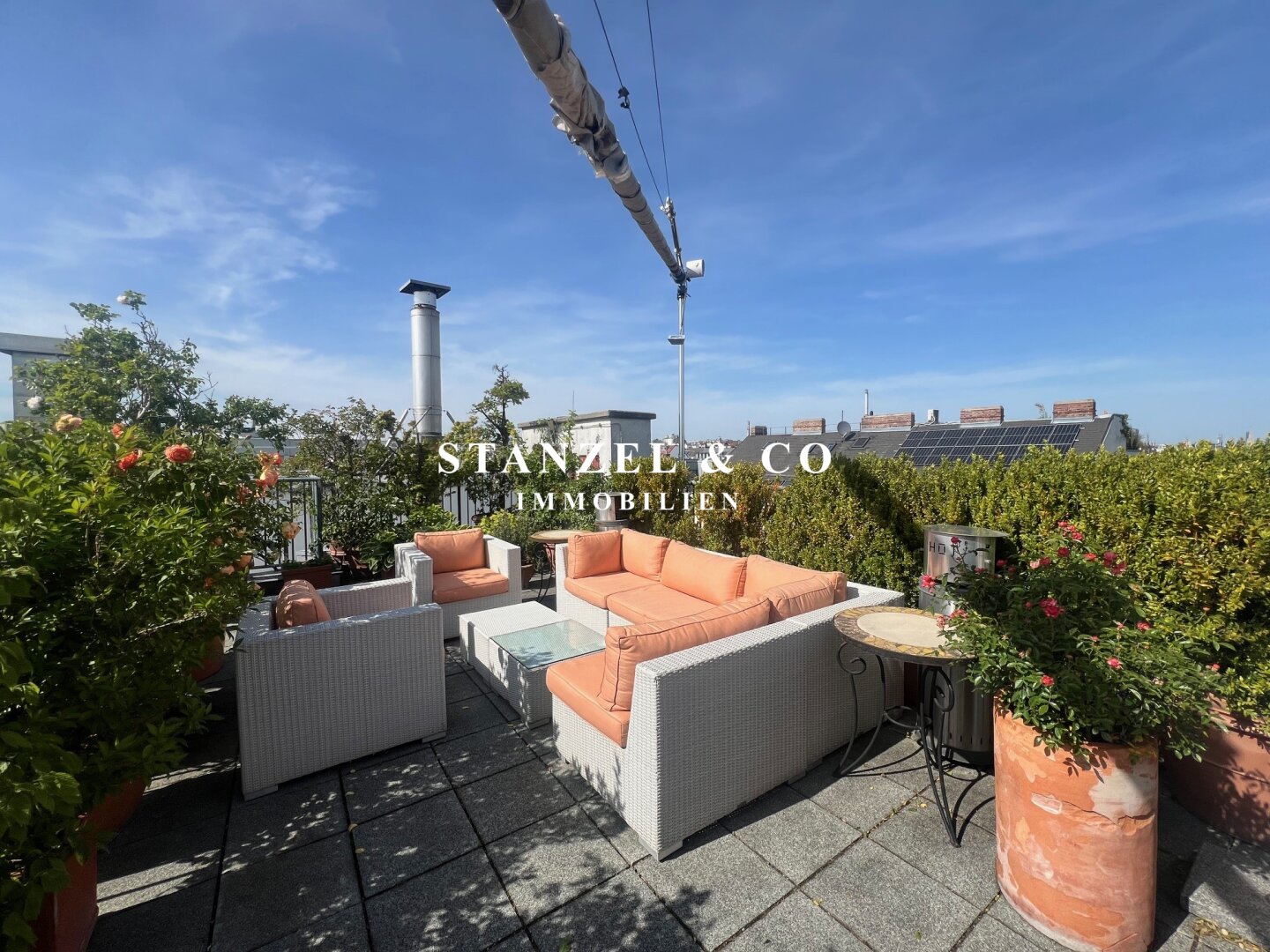 Von der an den Wohnsalon angrenzenden südwestseitigen Terrasse gelangt man über eine Wendeltreppe auf die 49m² große Dachterrasse mit herrlichem Panoramablick. Die Sonnenterrasse bietet einen traumhaften Rundum- sowie Fernblick. Ein elektrisches Sonnensegel ( Bespannung muss erneuert werden ) dient als Sonnenschutz. Die 49m² Terrasse verfügt über einen Süd-West und Nord-Ost-seitigen unverbaubaren Blick.