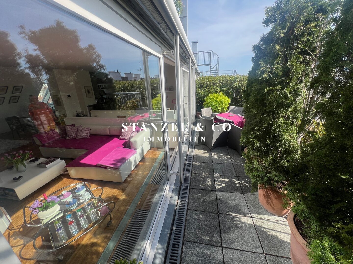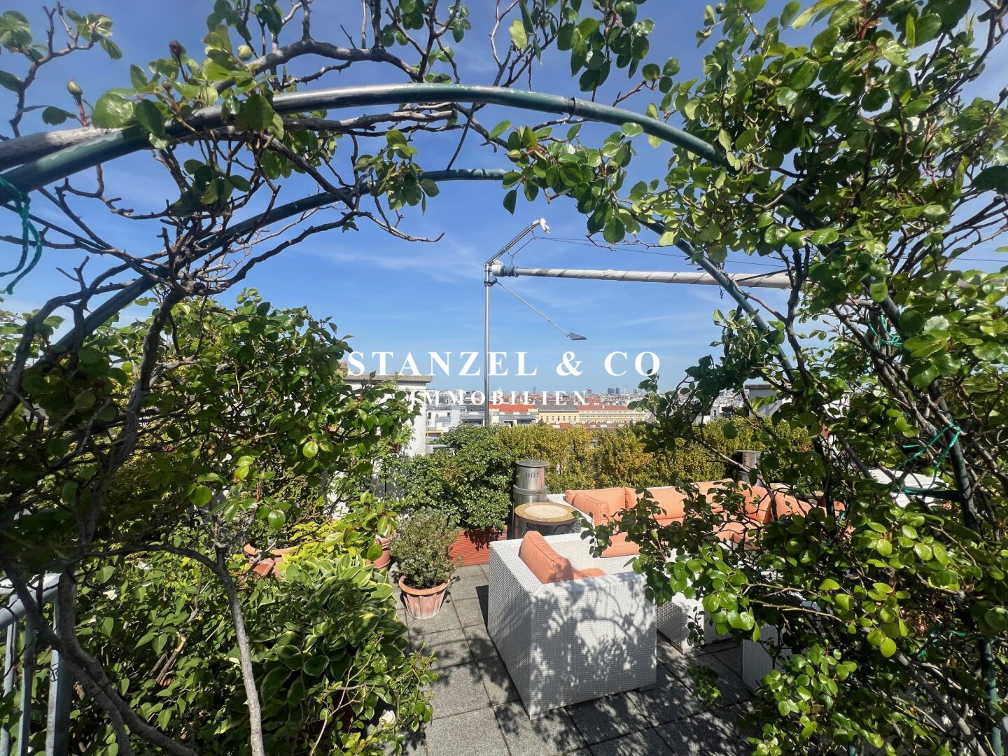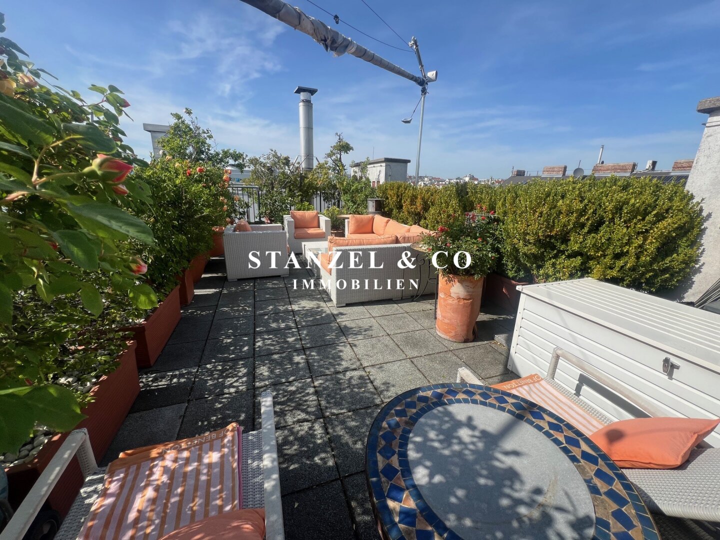 Von der an den Wohnsalon angrenzenden südwestseitigen Terrasse gelangt man über eine Wendeltreppe auf die 49m² große Dachterrasse mit herrlichem Panoramablick. Die Sonnenterrasse bietet einen traumhaften Rundum- sowie Fernblick. Ein elektrisches Sonnensegel ( Bespannung muss erneuert werden ) dient als Sonnenschutz. Die 49m² Terrasse verfügt über einen Süd-West und Nord-Ost-seitigen unverbaubaren Blick.