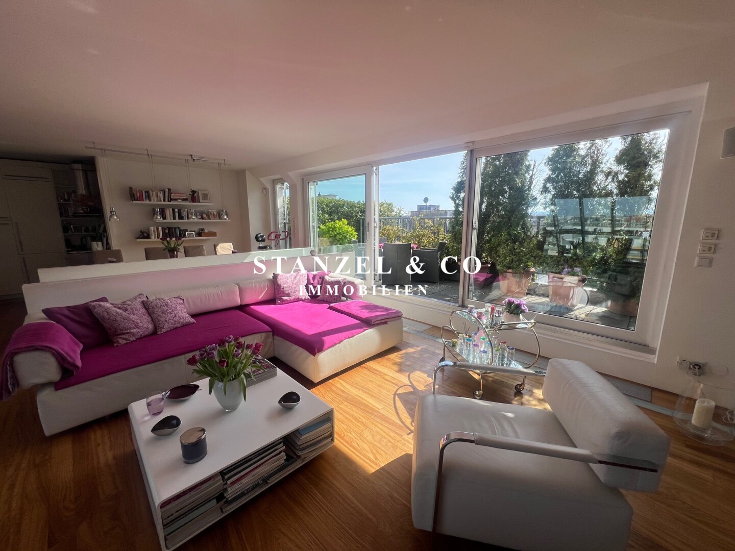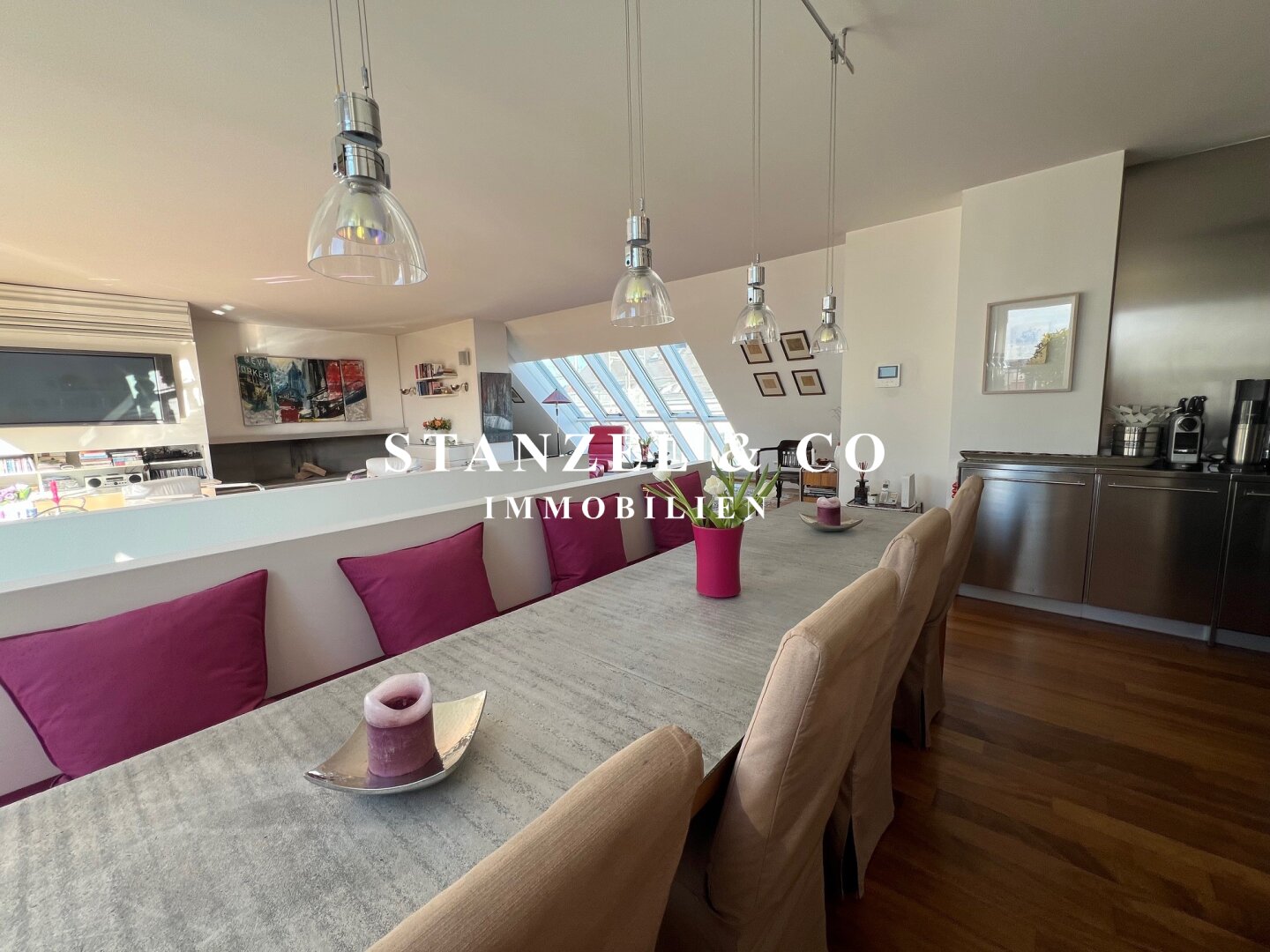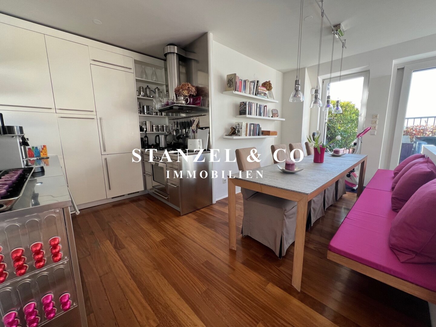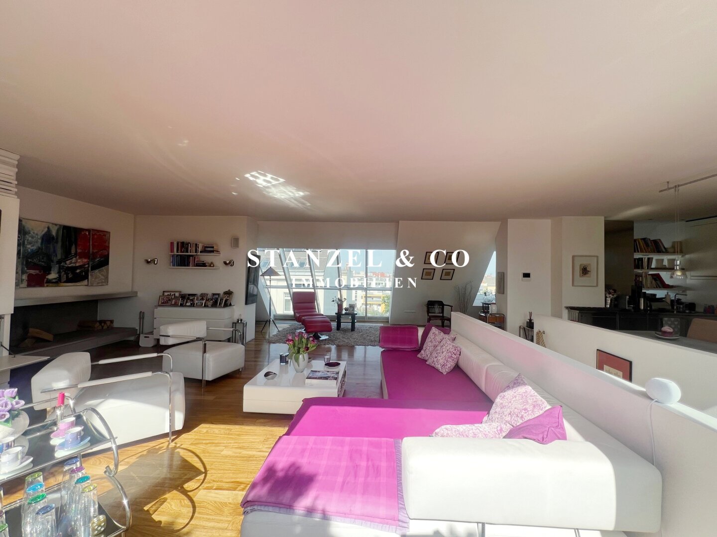 Das 80m² große, sonnige und loftartige Wohnesszimmer ist durch Glasschiebetüren mit der 26m² hofseitigen Süd-West-Terrasse verbunden. Der großzügige Wohnsalon verfügt über einen eleganten, offenen Kamin und eine moderne integrierte Alu-Küche, die mit einem Gas-Herd, Backrohr, großer Kühlgefrierkombination und Geschirrspüler ausgestattet ist.