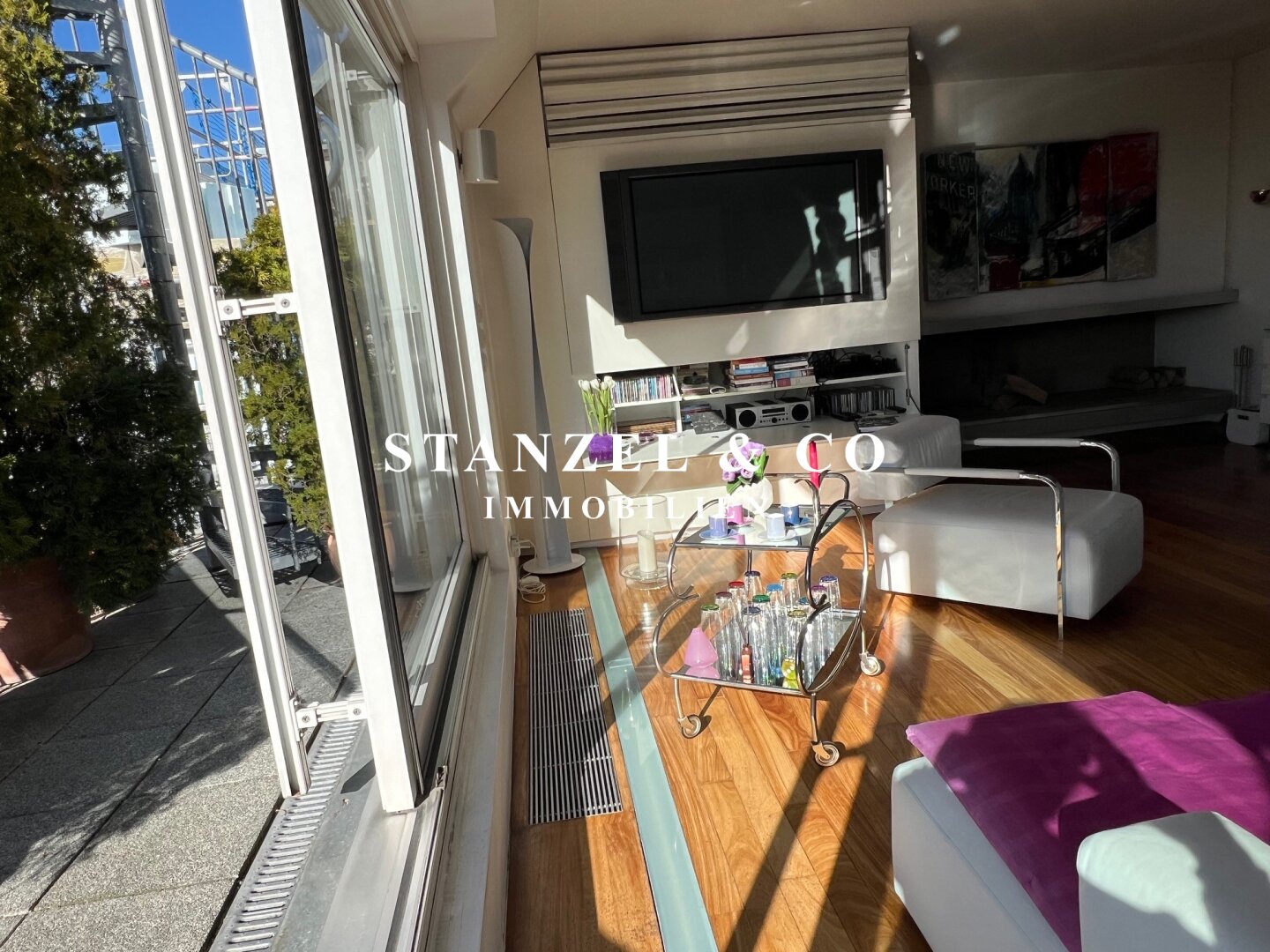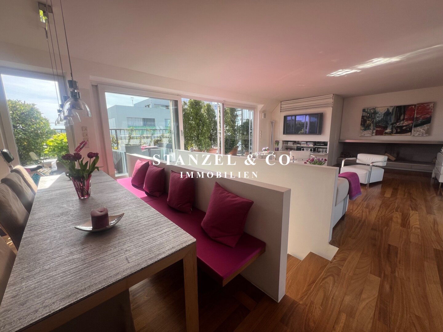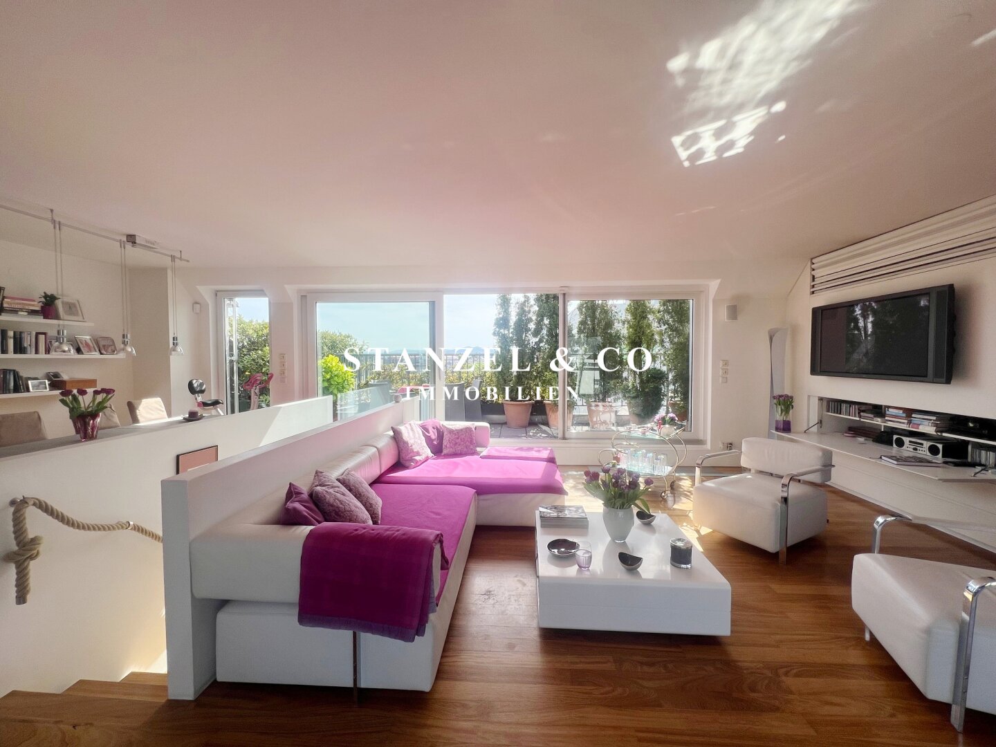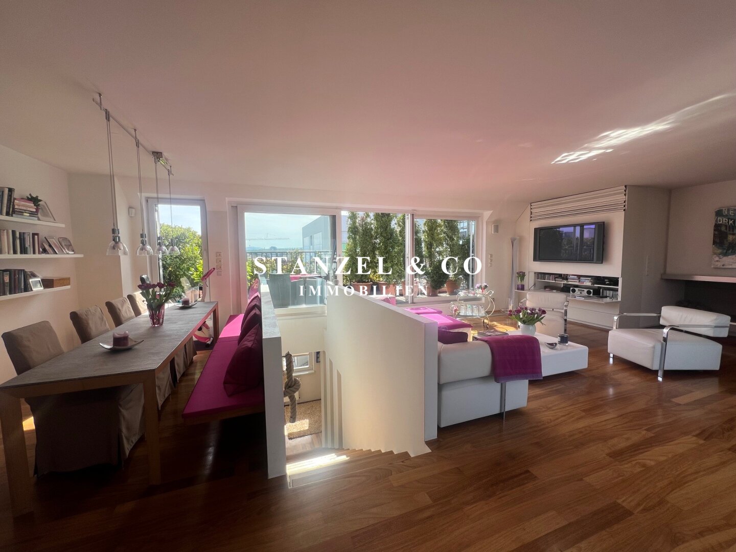 Das 80m² große, sonnige und loftartige Wohnesszimmer ist durch Glasschiebetüren mit der 26m² hofseitigen Süd-West-Terrasse verbunden. Der großzügige Wohnsalon verfügt über einen eleganten, offenen Kamin und eine moderne integrierte Alu-Küche, die mit einem Gas-Herd, Backrohr, großer Kühlgefrierkombination und Geschirrspüler ausgestattet ist.