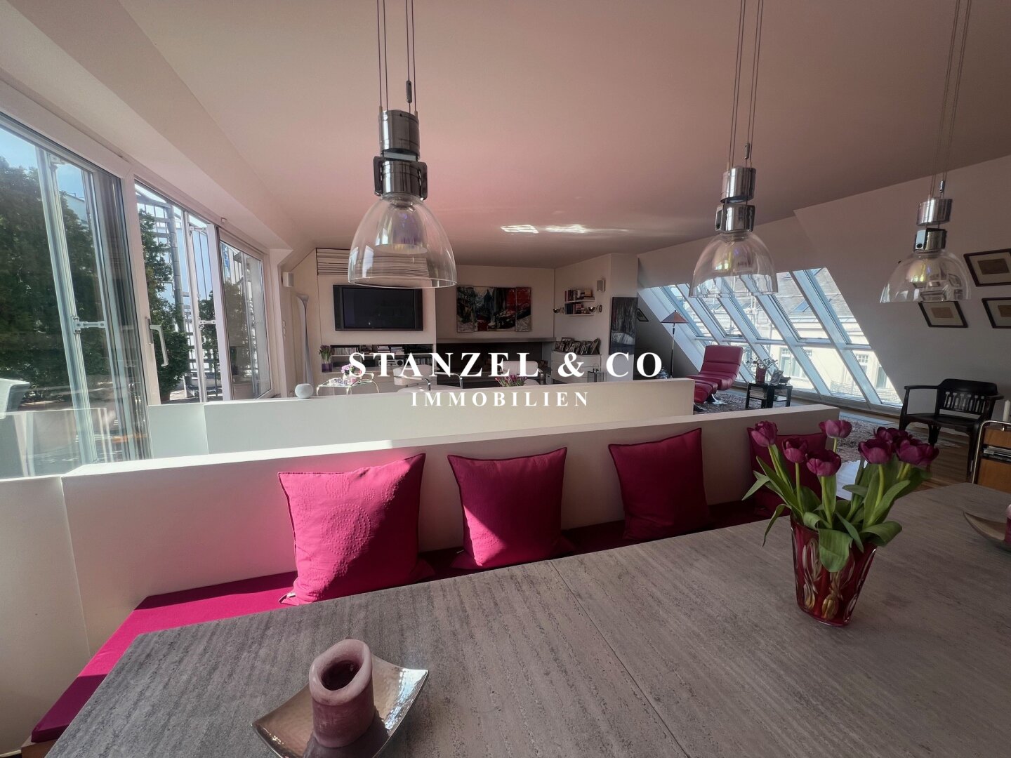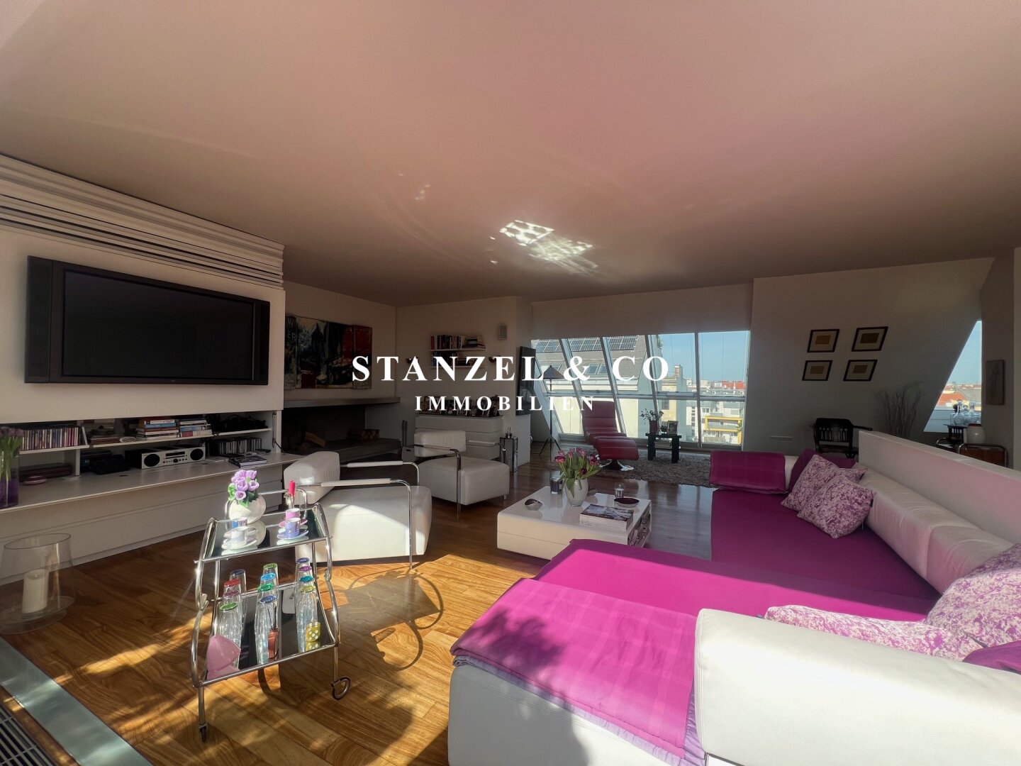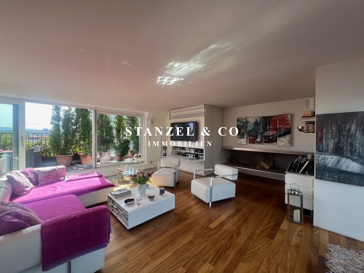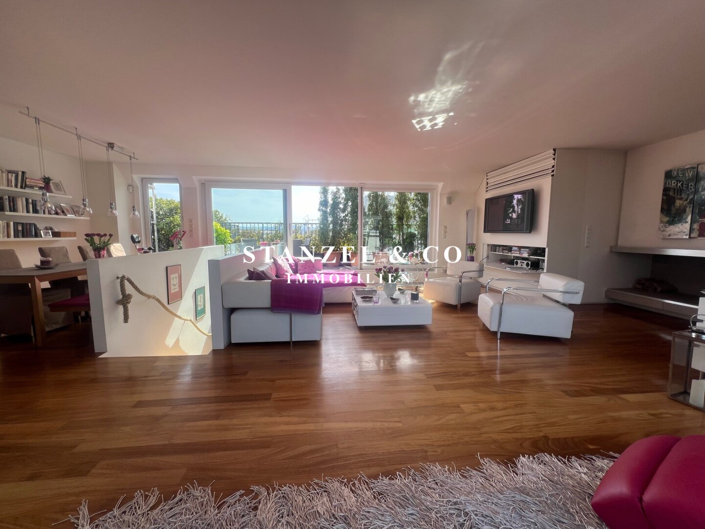Das 80m² große, sonnige und loftartige Wohnesszimmer ist durch Glasschiebetüren mit der 26m² hofseitigen Süd-West-Terrasse verbunden. Der großzügige Wohnsalon verfügt über einen eleganten, offenen Kamin und eine moderne integrierte Alu-Küche, die mit einem Gas-Herd, Backrohr, großer Kühlgefrierkombination und Geschirrspüler ausgestattet ist.
