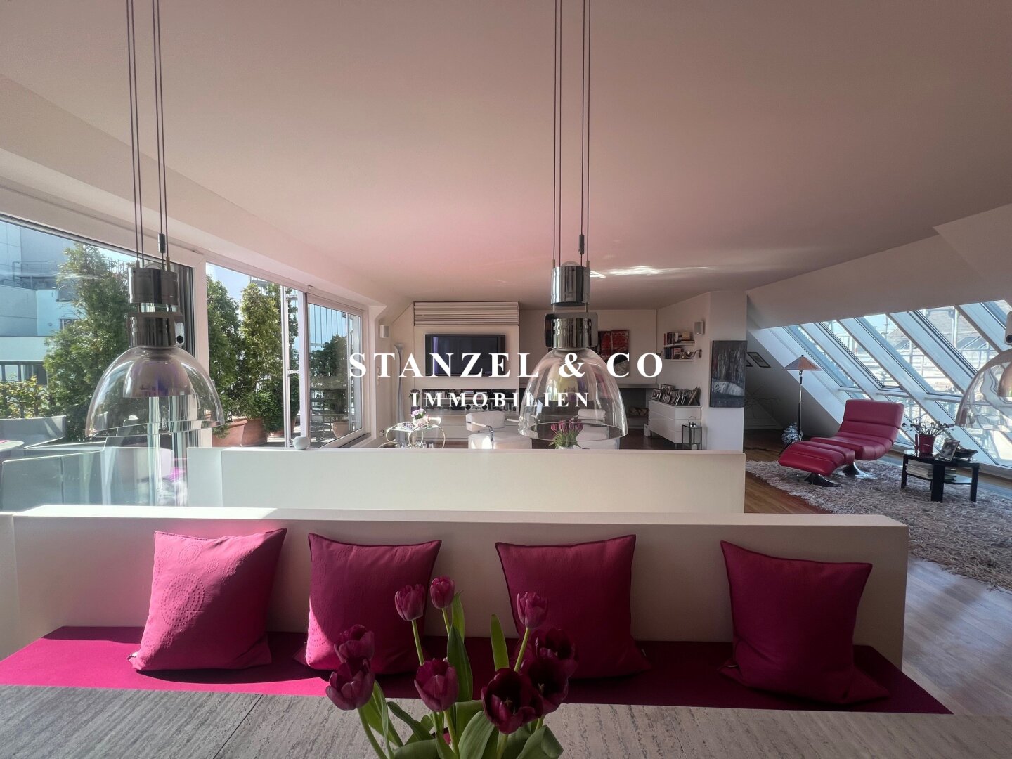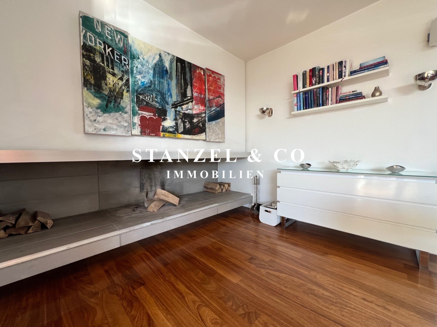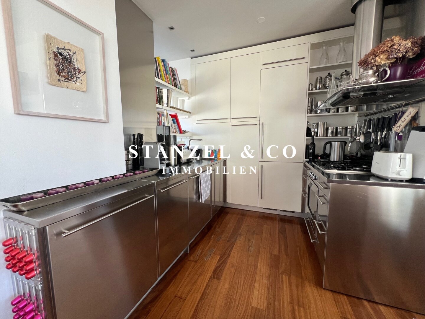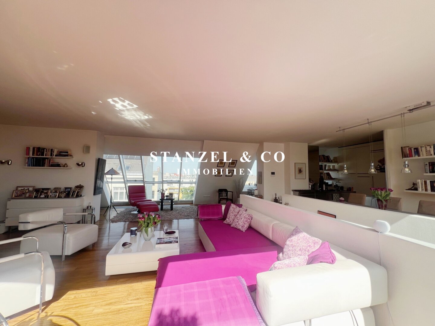 Das 80m² große, sonnige und loftartige Wohnesszimmer ist durch Glasschiebetüren mit der 26m² hofseitigen Süd-West-Terrasse verbunden. Der großzügige Wohnsalon verfügt über einen eleganten, offenen Kamin und eine moderne integrierte Alu-Küche, die mit einem Gas-Herd, Backrohr, großer Kühlgefrierkombination und Geschirrspüler ausgestattet ist.