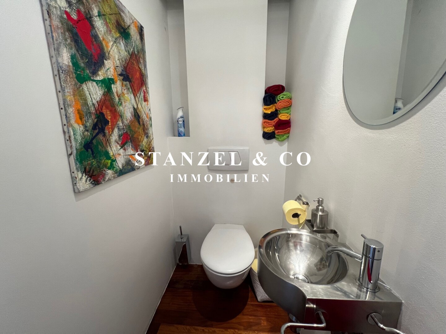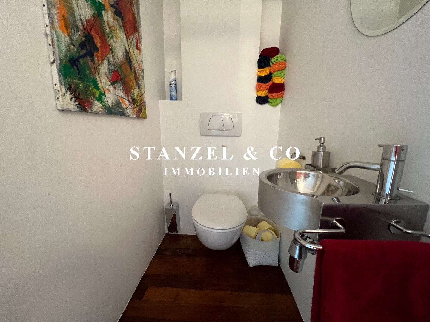 Des Weiteren gibt es einen Abstellraum mit Waschmaschinenanschluss und Wandsafe, sowie ein separates WC mit Handwaschbecken und elektrischer Entlüftung.
