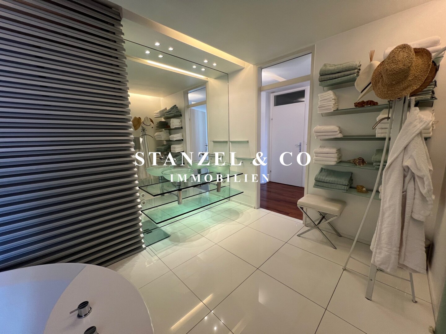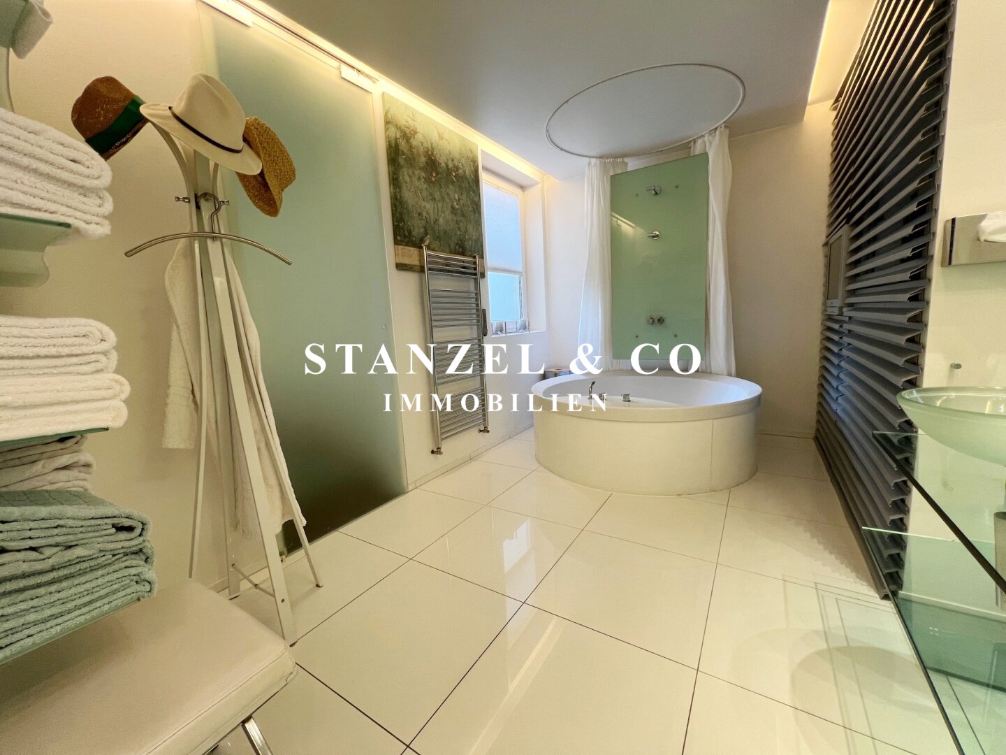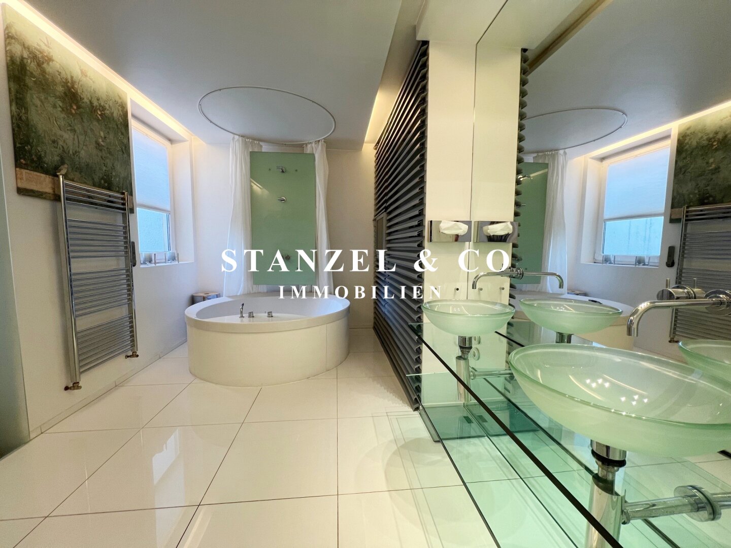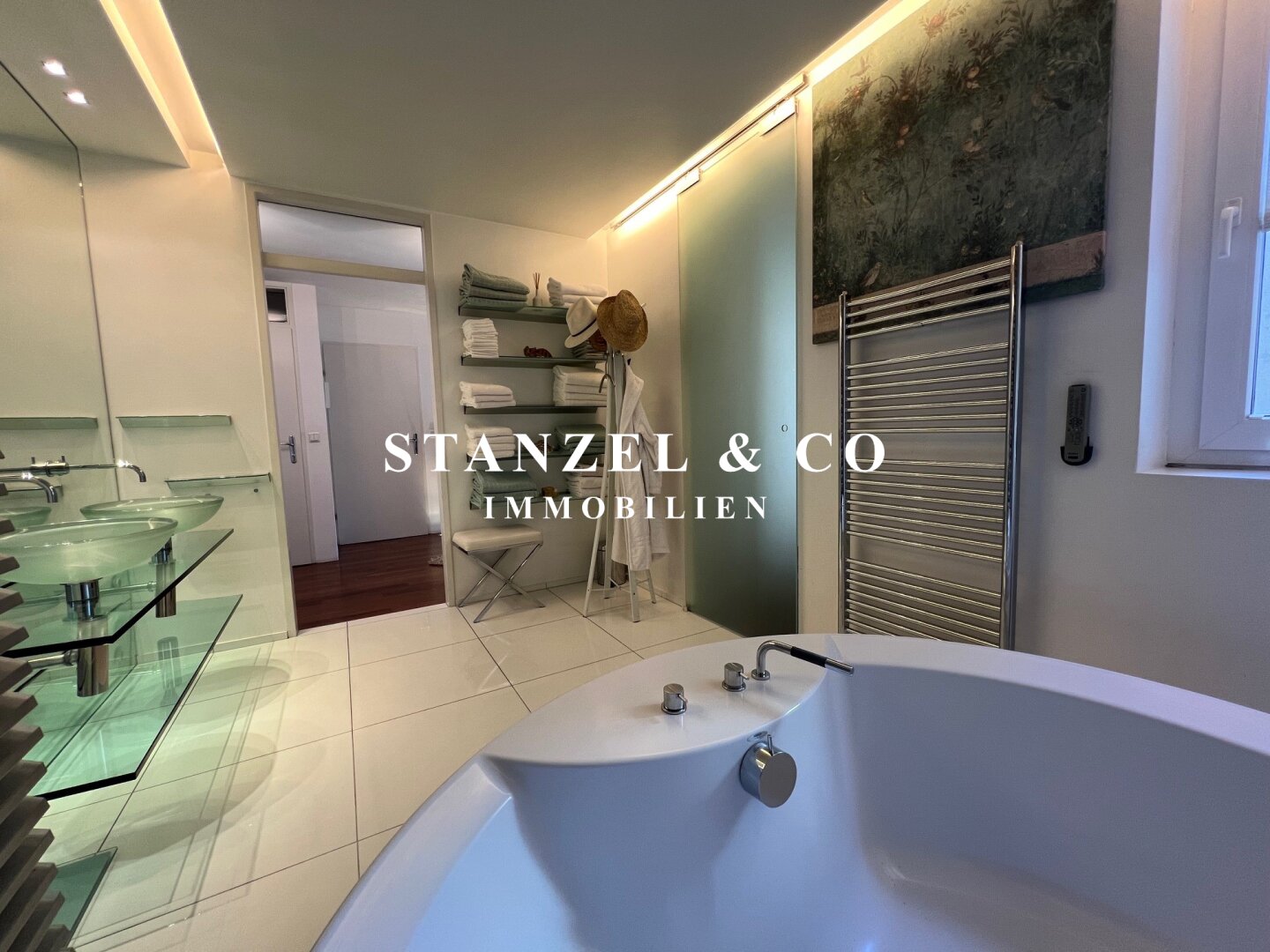 Vom Vorzimmer gelangt man in die beiden Schlafzimmer. Das südwestseitige 18m² Schlafzimmer verfügt über eine anschließende begehbare Garderobe. En-Suite gelangt man in das anschließende große Badezimmer mit Fenster. Es ist mit einer großen runden Designer – Badewanne mit Dusche, einem Fenster, einem Glas-Doppelwaschtisch, großzügigem Spiegel und Handtuchtrockner ausgestattet. Zusätzlich befindet sich im Badezimmer die Haustechnik – die Gas-Etagenheizung sowie ein zusätzlicher Warmwasserspeicher – es gäbe auch die Option ein zusätzliches WC unterzubringen und es gibt eine separat zuschaltbare Fußbodenheizung.