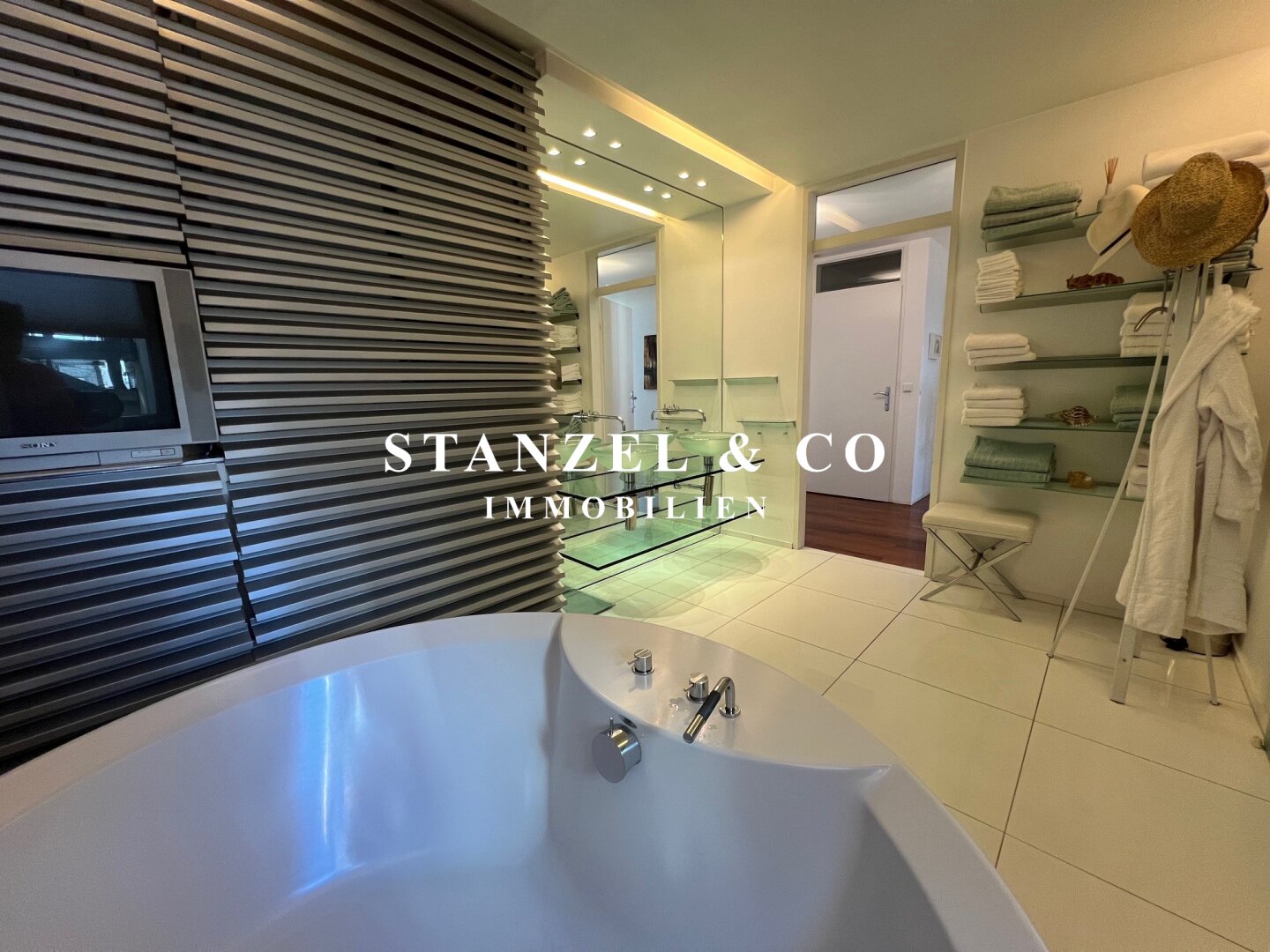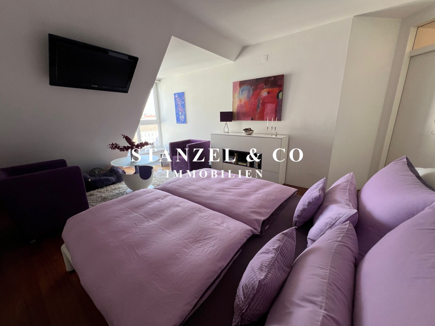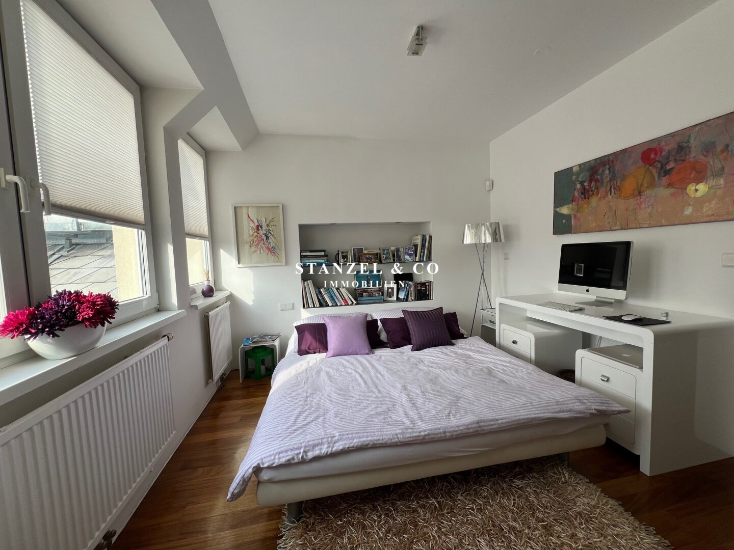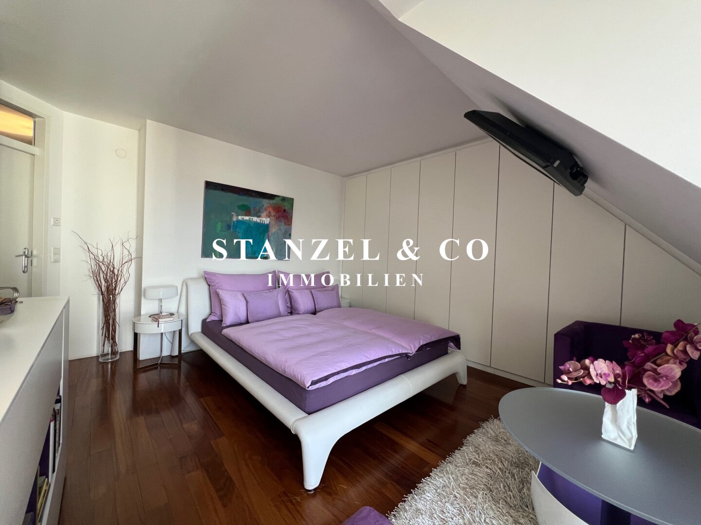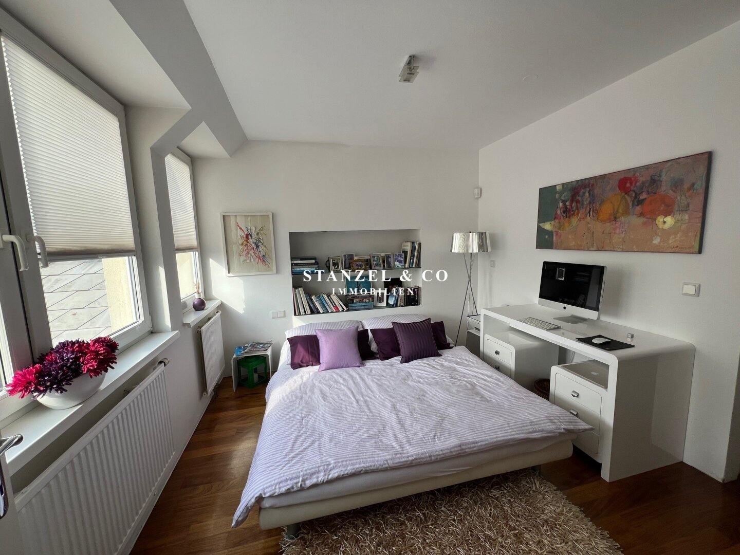 Vom Vorzimmer gelangt man in die beiden Schlafzimmer. Das südwestseitige 18m² Schlafzimmer verfügt über eine anschließende begehbare Garderobe. En-Suite gelangt man in das anschließende große Badezimmer mit Fenster. Es ist mit einer großen runden Designer – Badewanne mit Dusche, einem Fenster, einem Glas-Doppelwaschtisch, großzügigem Spiegel und Handtuchtrockner ausgestattet. Zusätzlich befindet sich im Badezimmer die Haustechnik – die Gas-Etagenheizung sowie ein zusätzlicher Warmwasserspeicher – es gäbe auch die Option ein zusätzliches WC unterzubringen und es gibt eine separat zuschaltbare Fußbodenheizung.