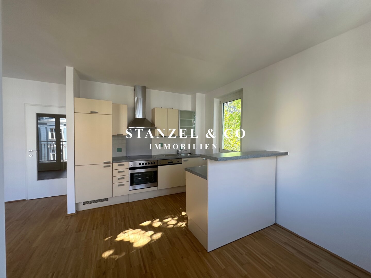 ( Vorzimmer, Westbalkon, 2 Räume, offene Küche, Badezimmer, WC, Abstellraum & Kellerabteil )