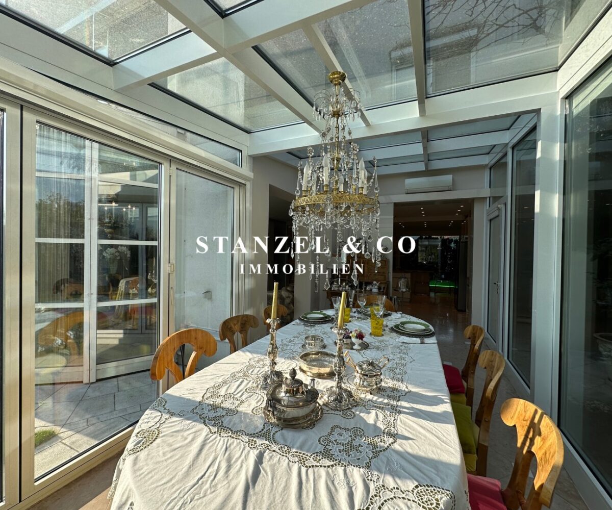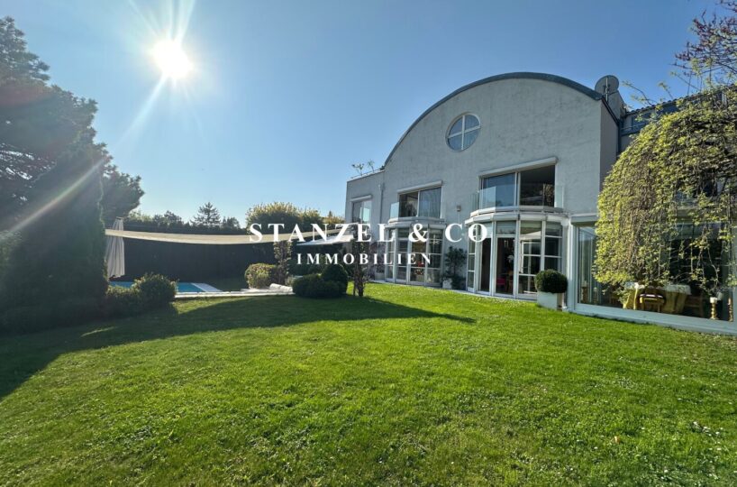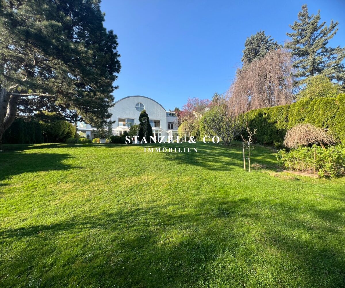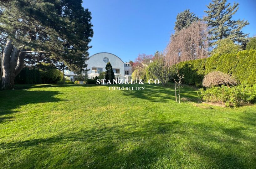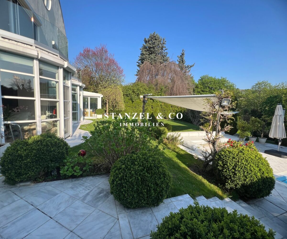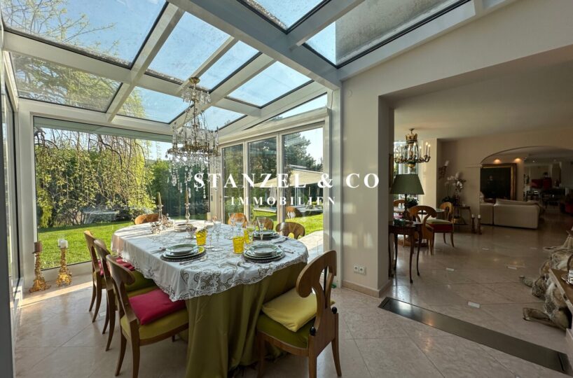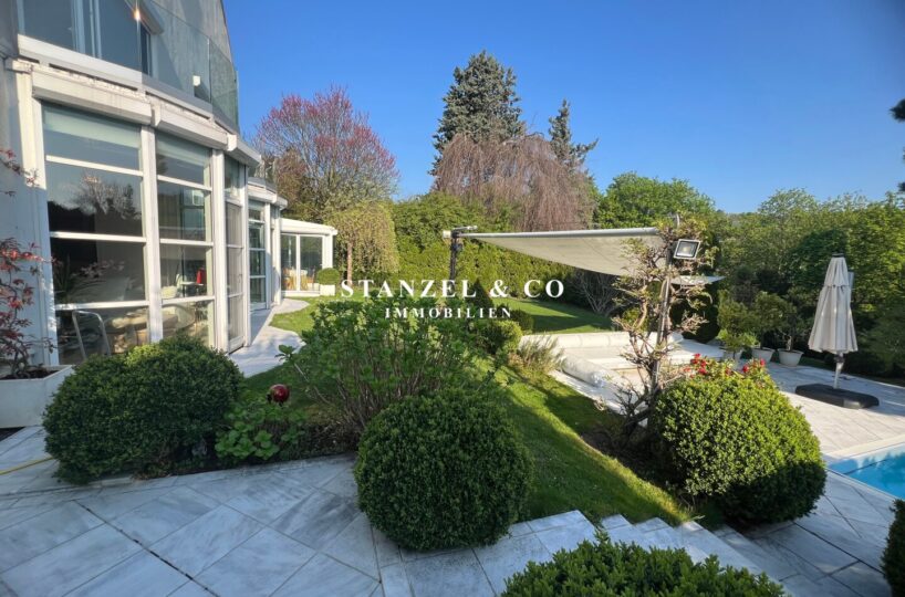 ( herricher Garten, 3 Terrassen, Wohnsalon, Wohnküche, Wintergarten, 2 – 3 Schlafzimmer, 2 Bäder, Weinkeller, Fitnessraum, Sauna, 5 WCs, 2 Hobbyräumen & 4 Garagenstellplätzen )