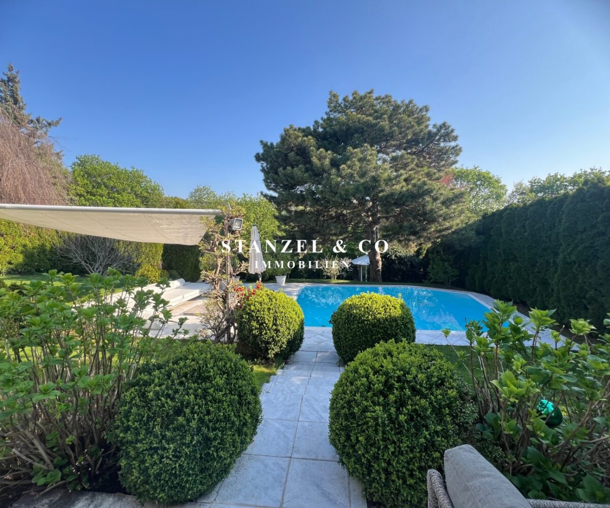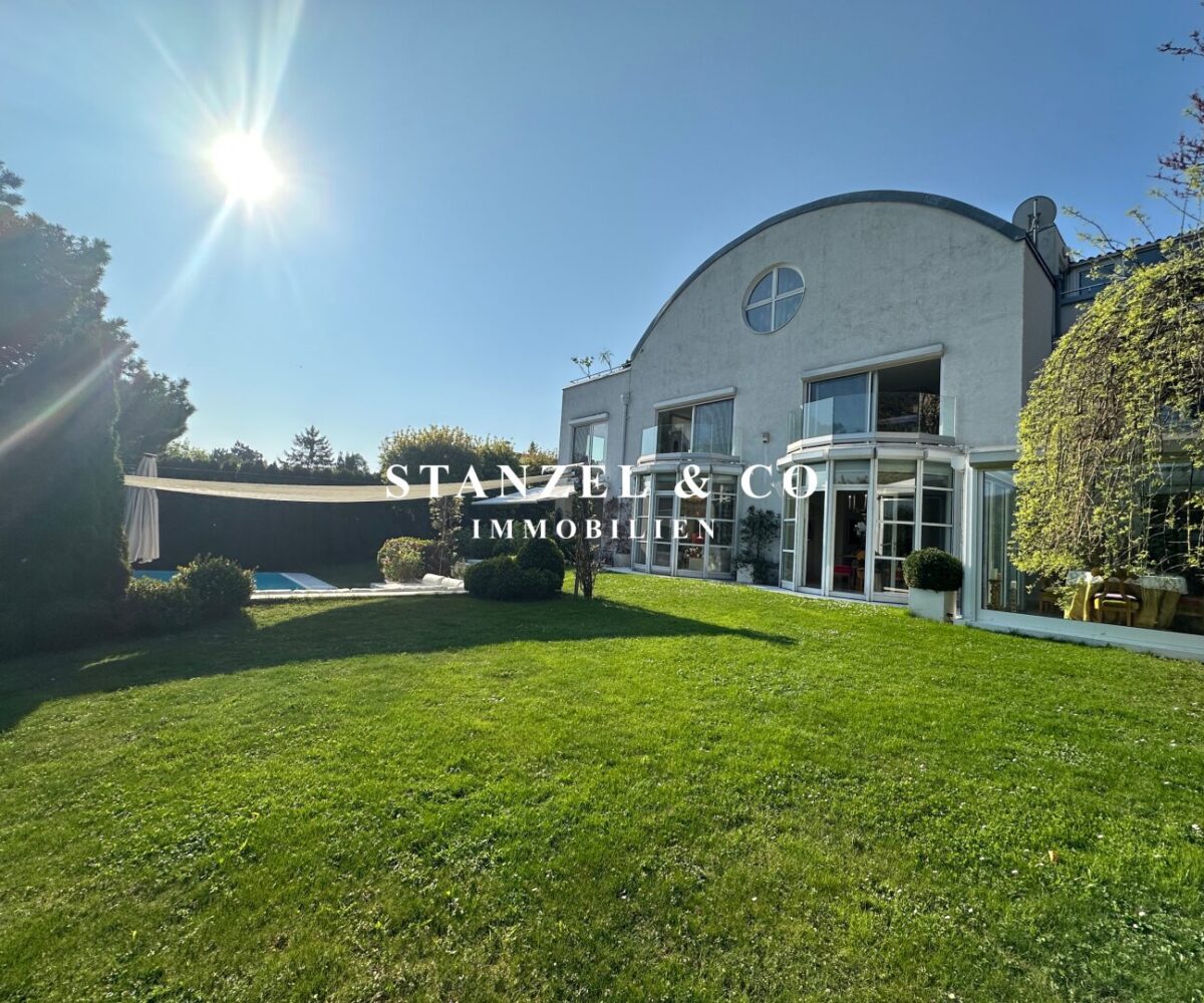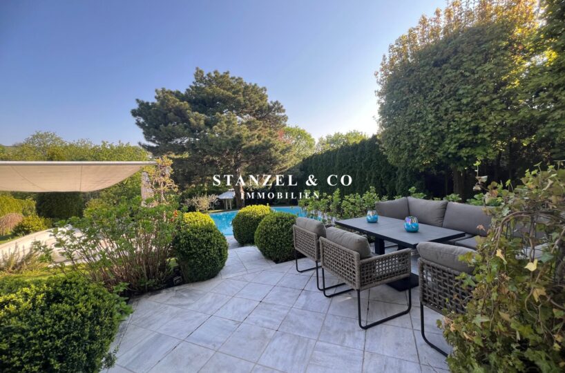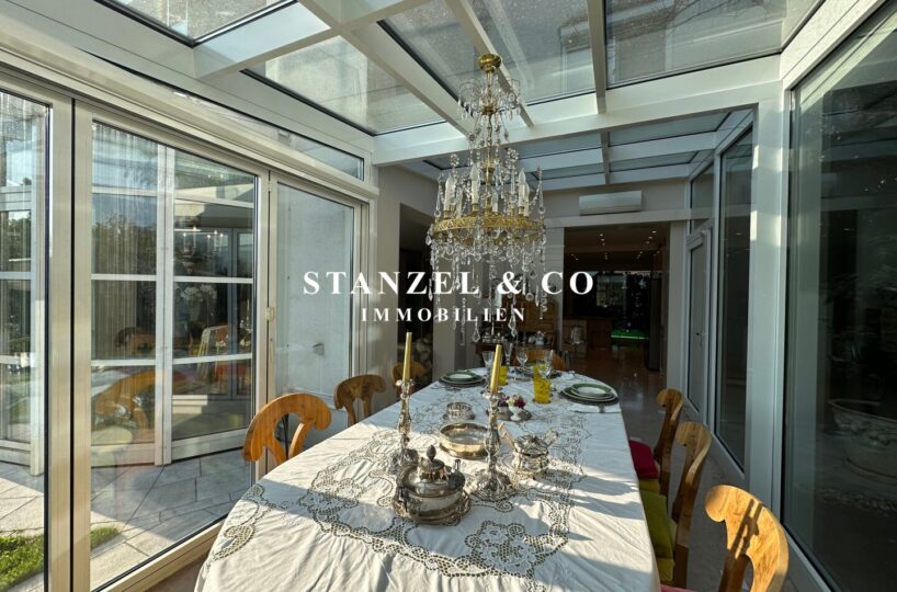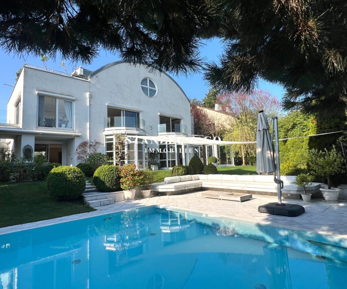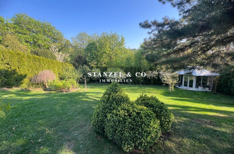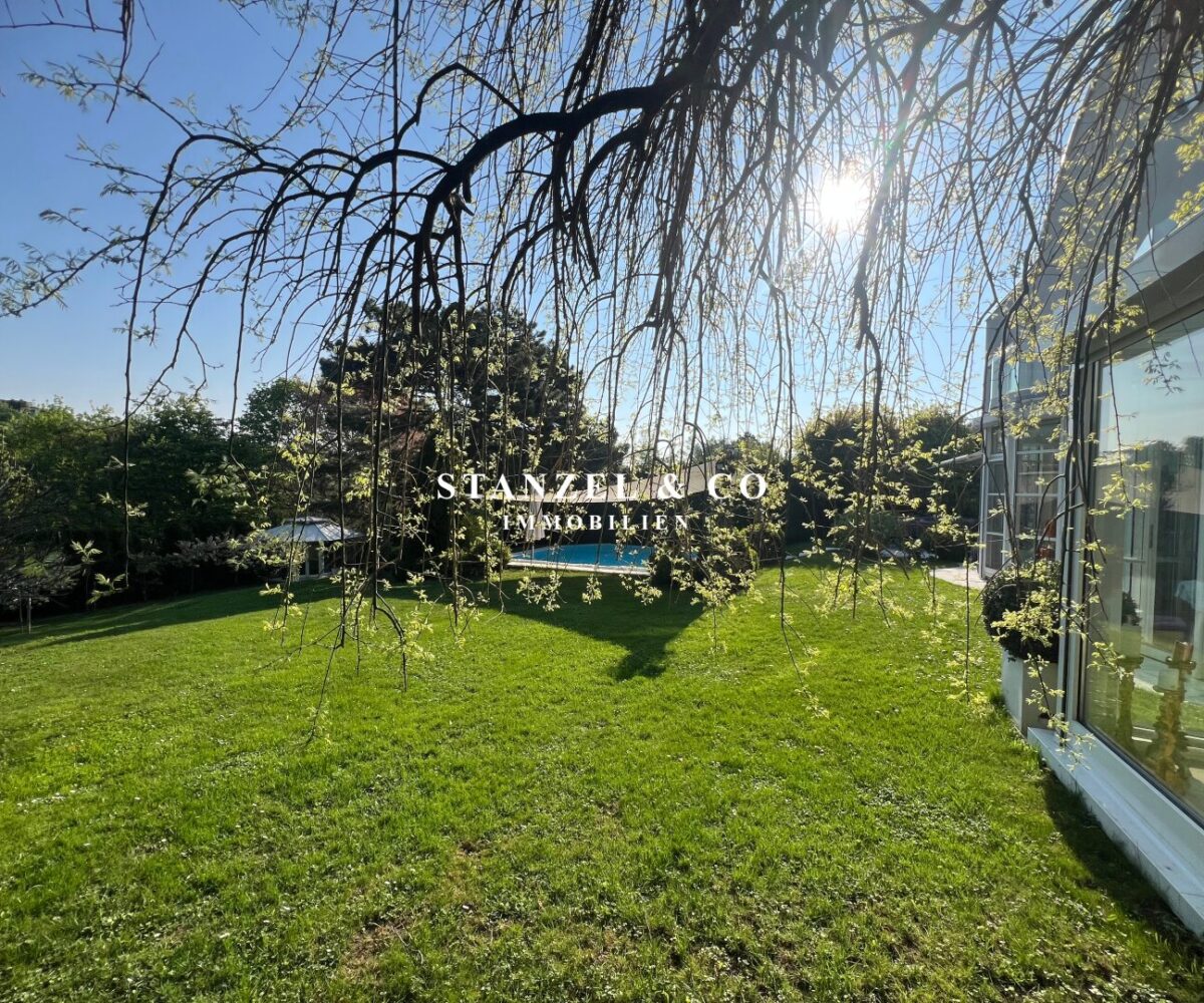 ( herricher Garten, 3 Terrassen, Wohnsalon, Wohnküche, Wintergarten, 2 – 3 Schlafzimmer, 2 Bäder, Weinkeller, Fitnessraum, Sauna, 5 WCs, 2 Hobbyräumen & 4 Garagenstellplätzen )