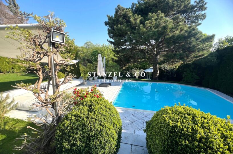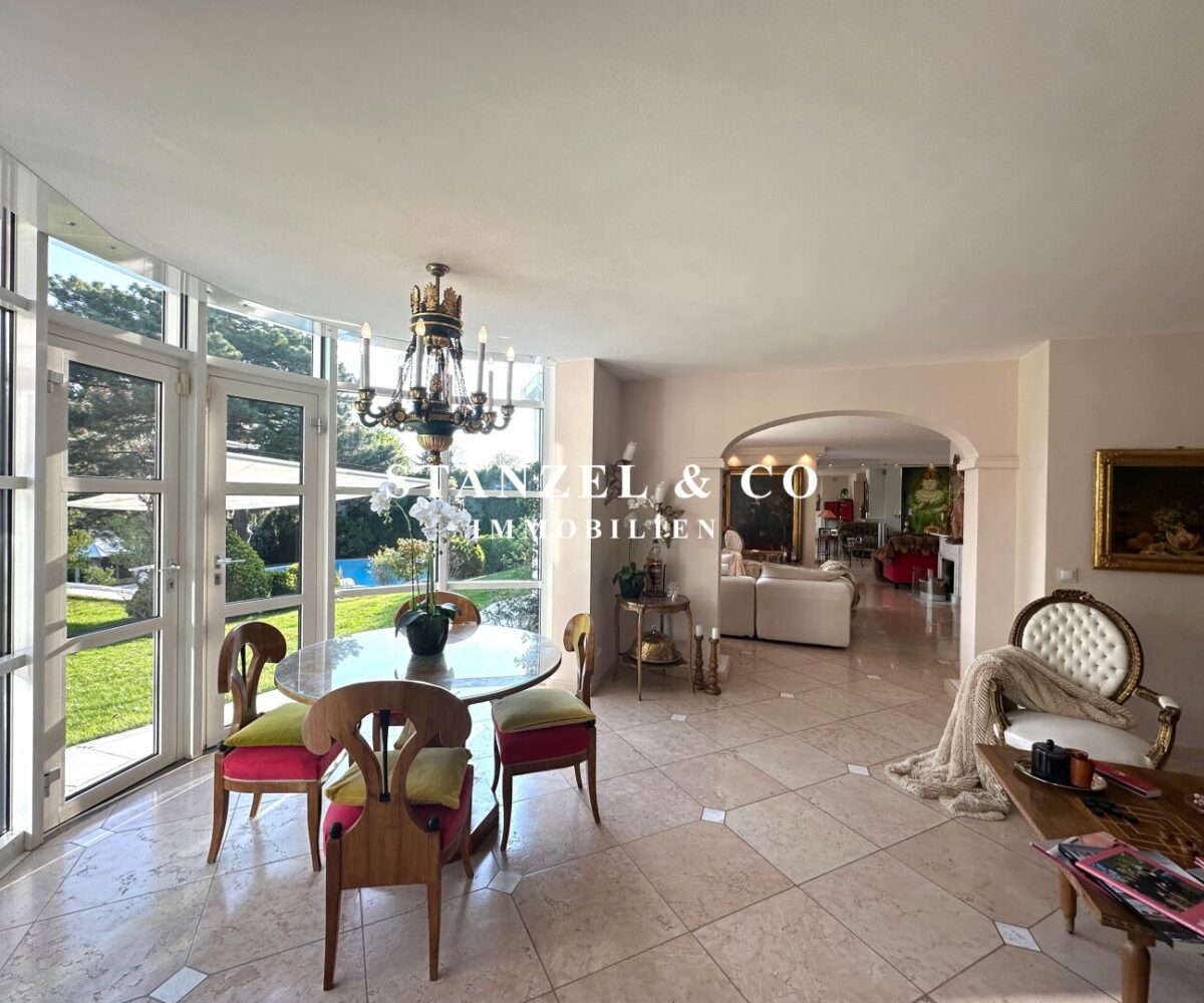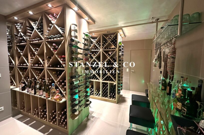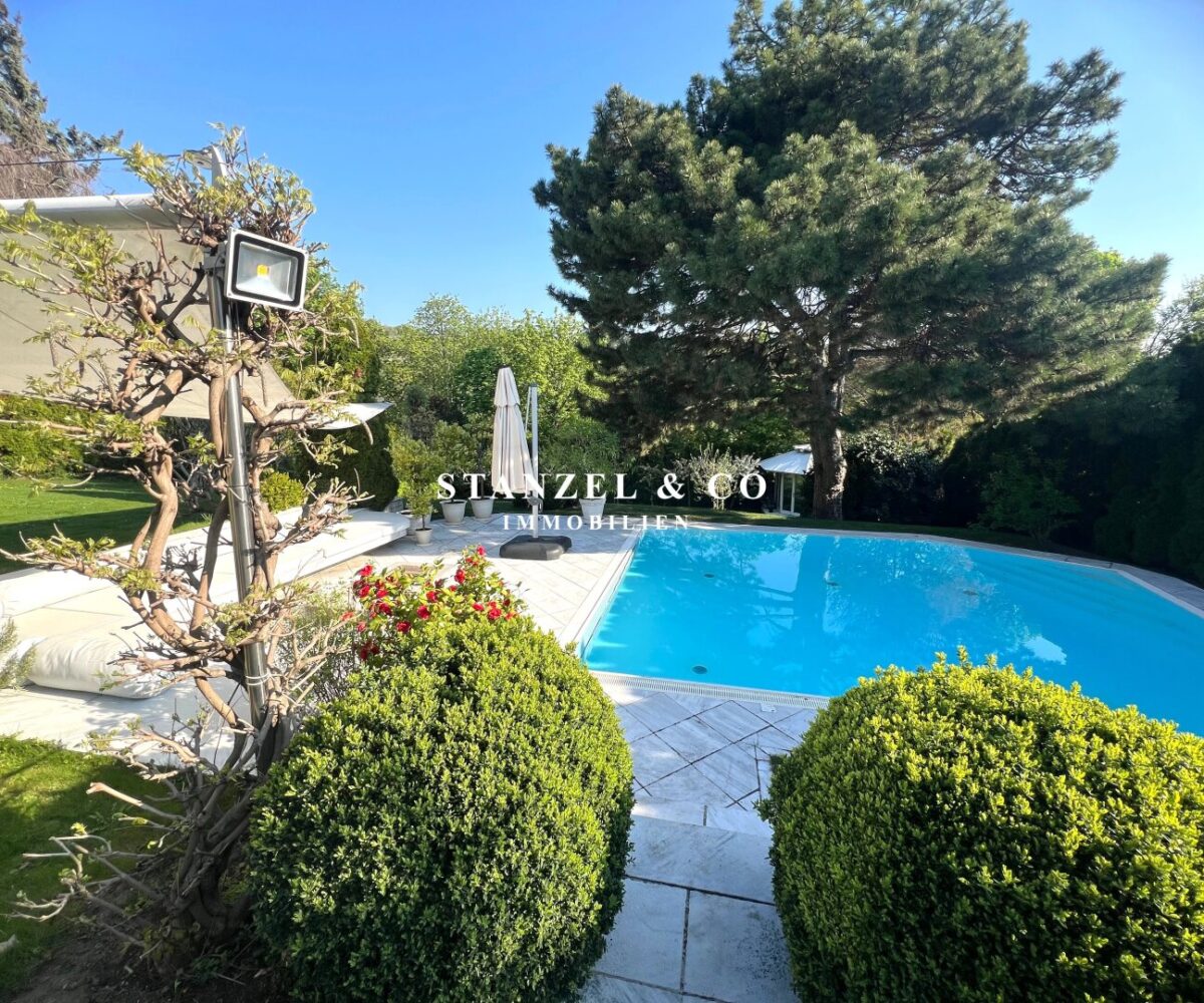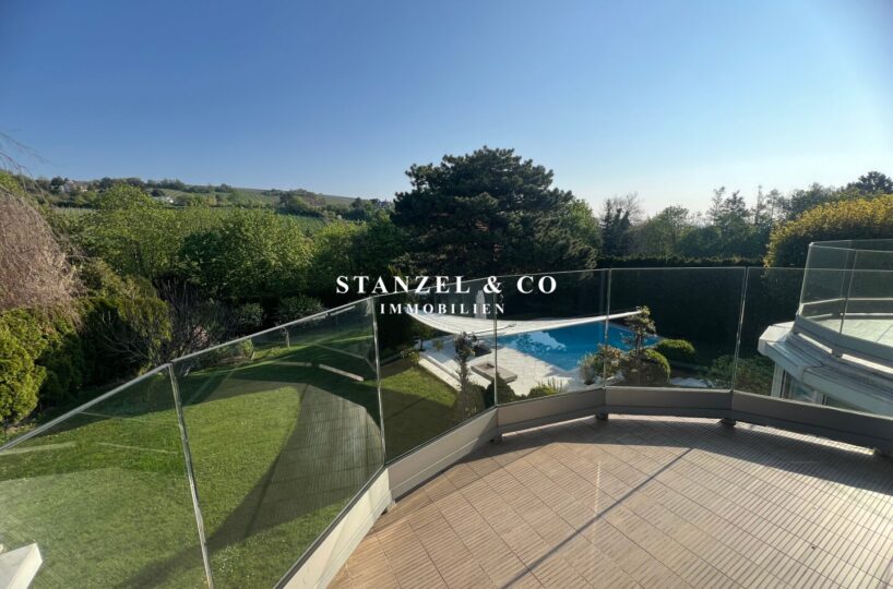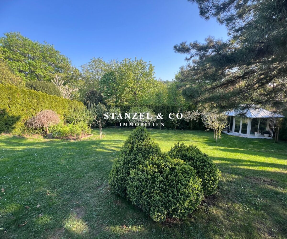 ( herricher Garten, 3 Terrassen, Wohnsalon, Wohnküche, Wintergarten, 2 – 3 Schlafzimmer, 2 Bäder, Weinkeller, Fitnessraum, Sauna, 5 WCs, 2 Hobbyräumen & 4 Garagenstellplätzen )