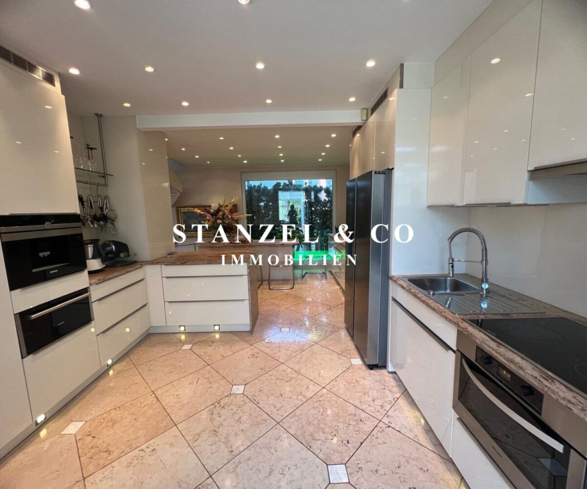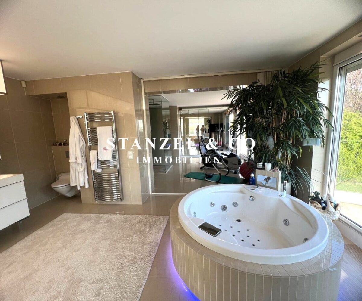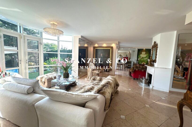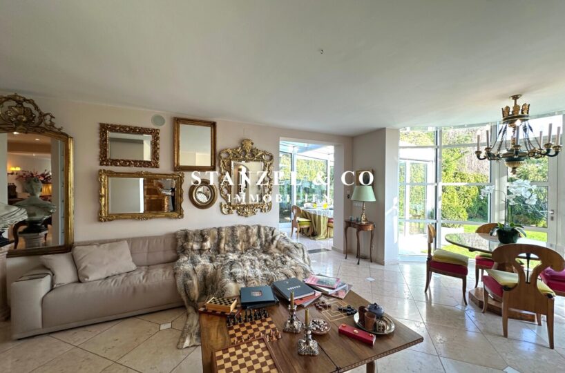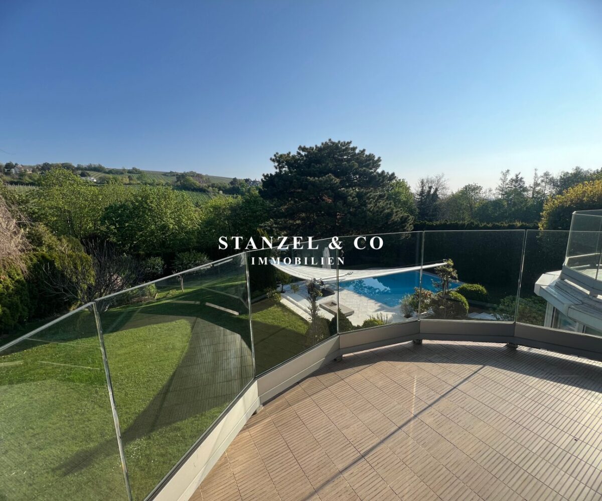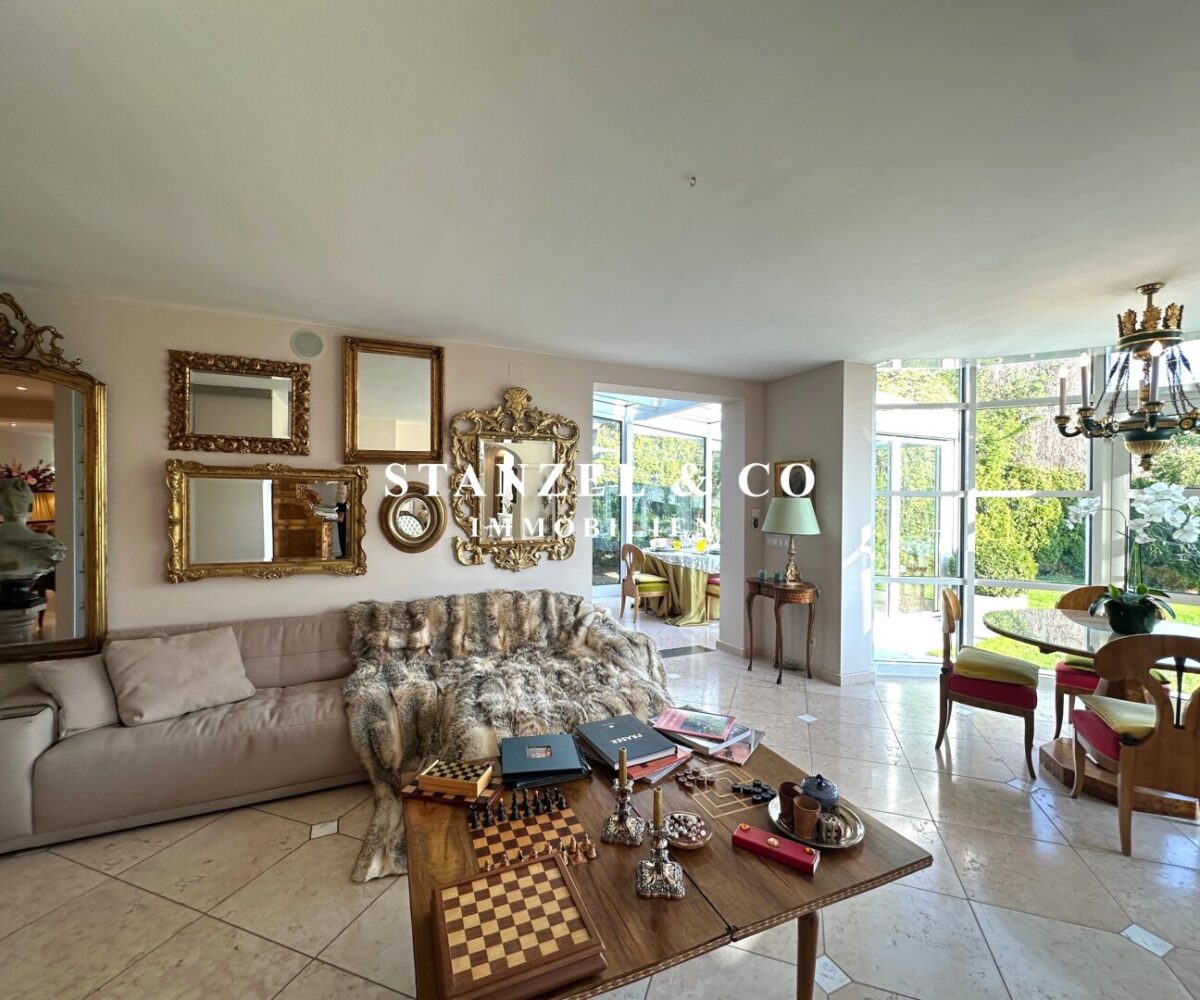 ( herricher Garten, 3 Terrassen, Wohnsalon, Wohnküche, Wintergarten, 2 – 3 Schlafzimmer, 2 Bäder, Weinkeller, Fitnessraum, Sauna, 5 WCs, 2 Hobbyräumen & 4 Garagenstellplätzen )