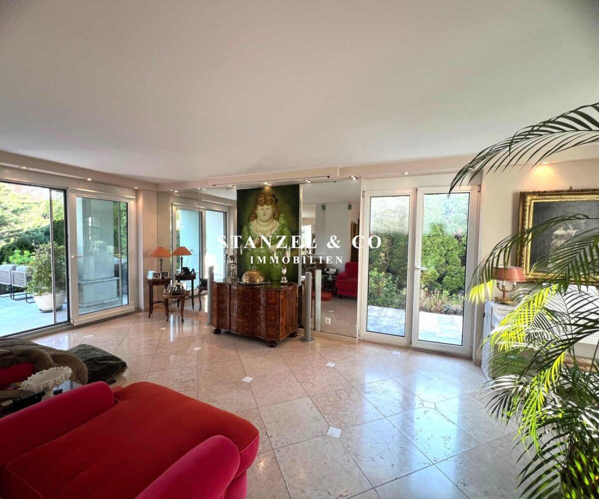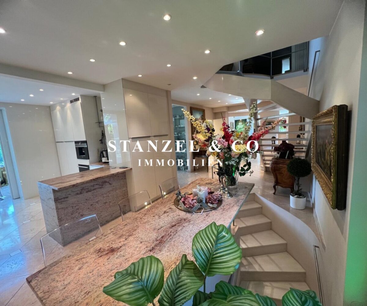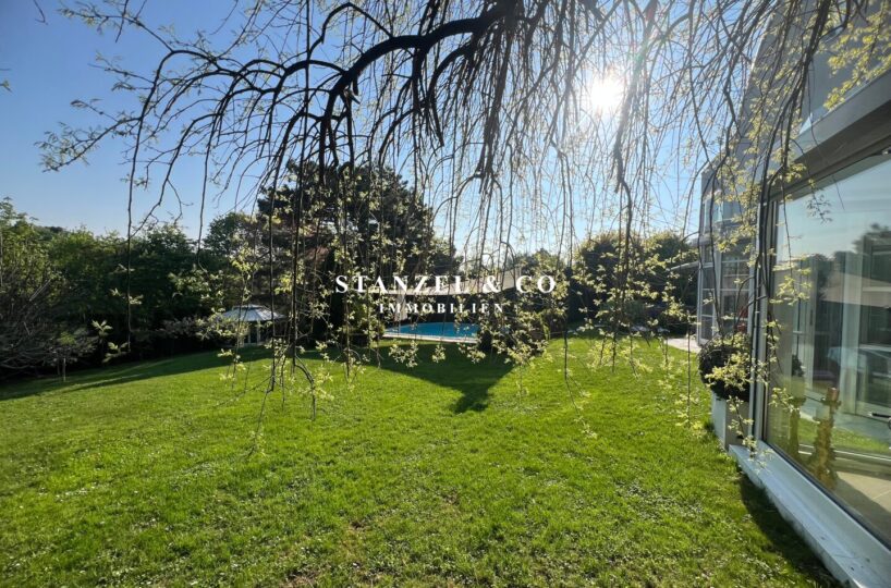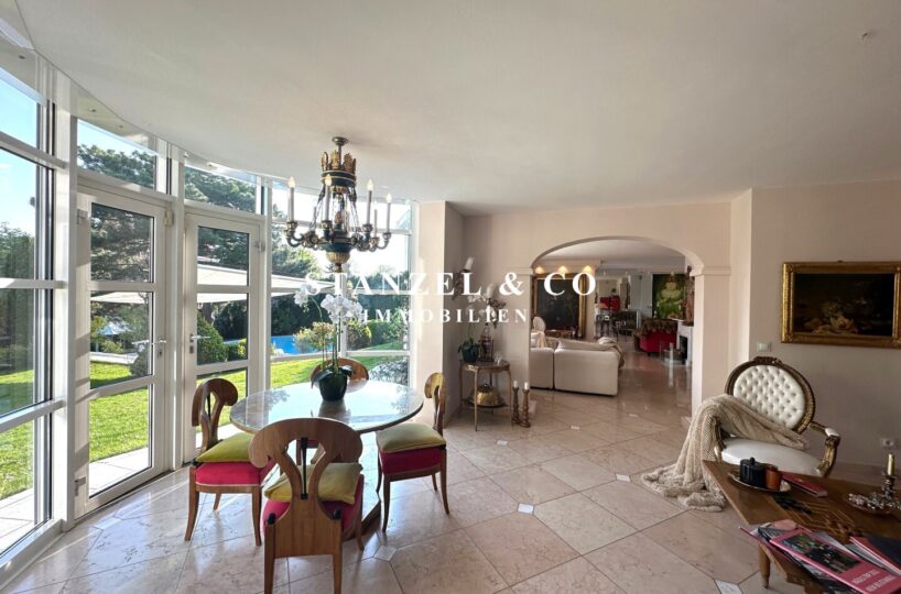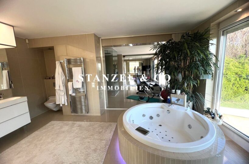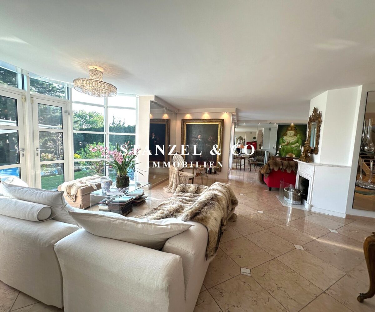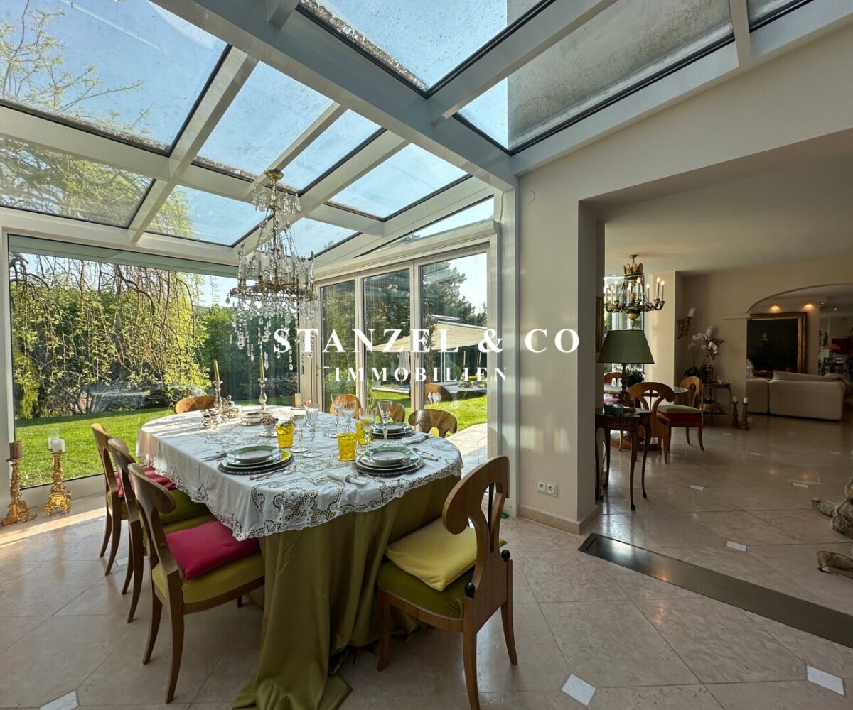 ( herricher Garten, 3 Terrassen, Wohnsalon, Wohnküche, Wintergarten, 2 – 3 Schlafzimmer, 2 Bäder, Weinkeller, Fitnessraum, Sauna, 5 WCs, 2 Hobbyräumen & 4 Garagenstellplätzen )