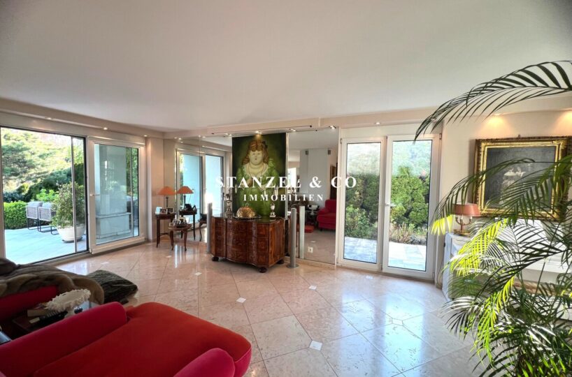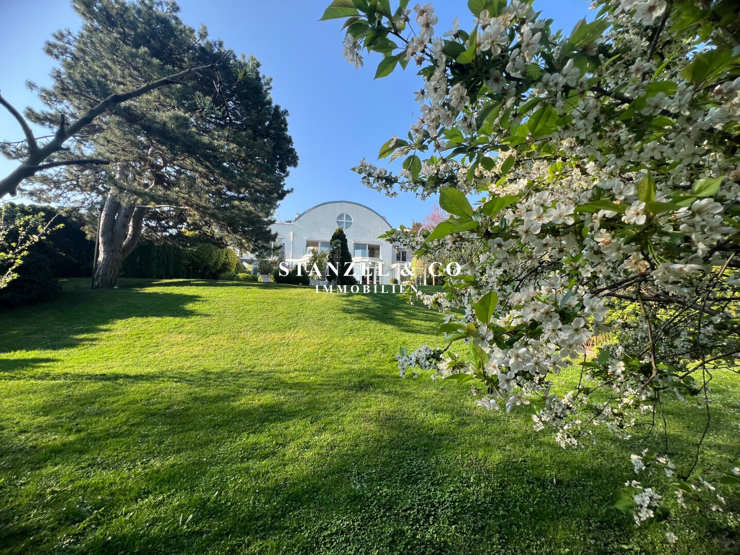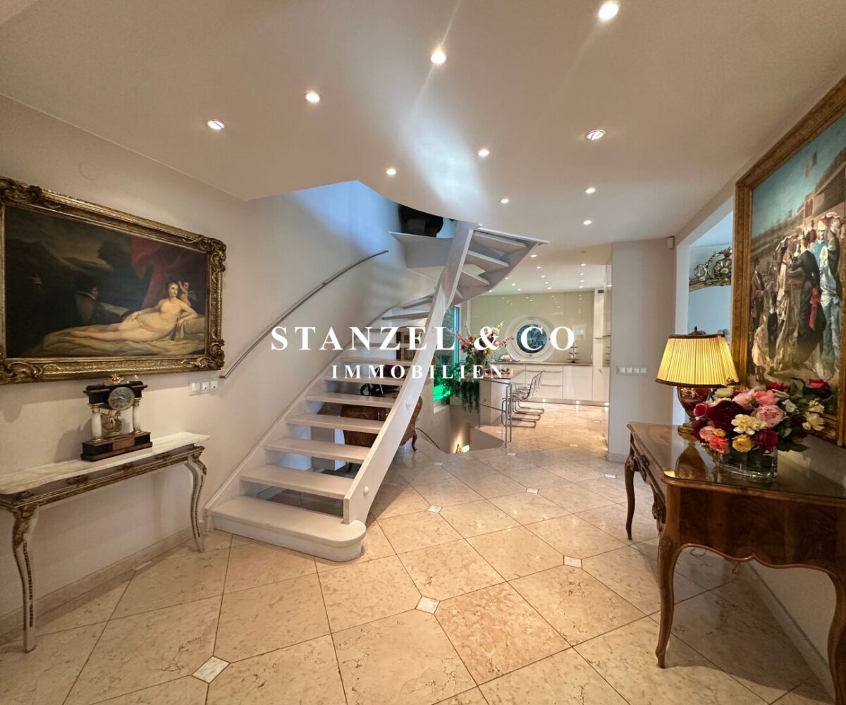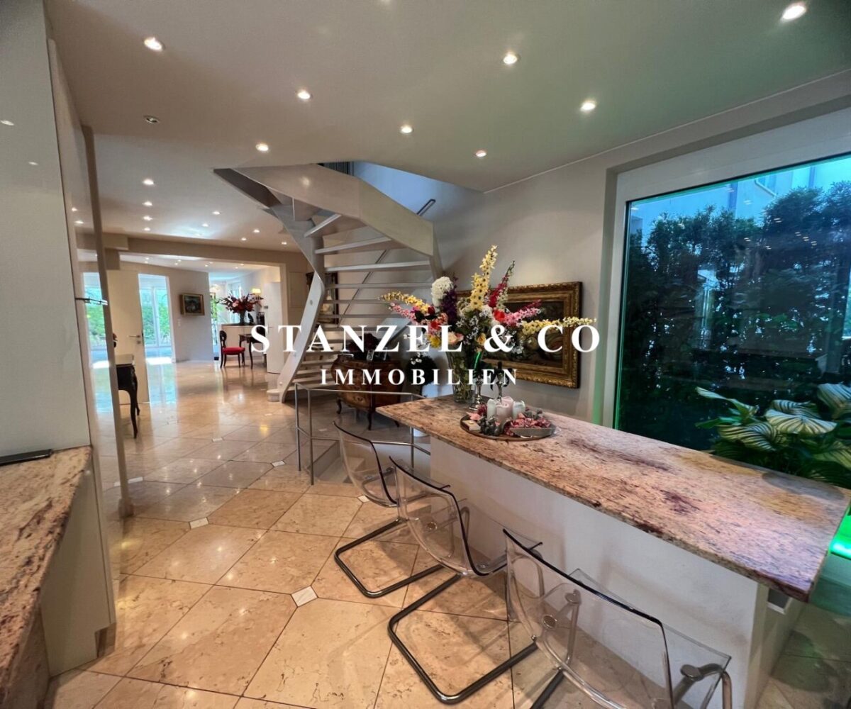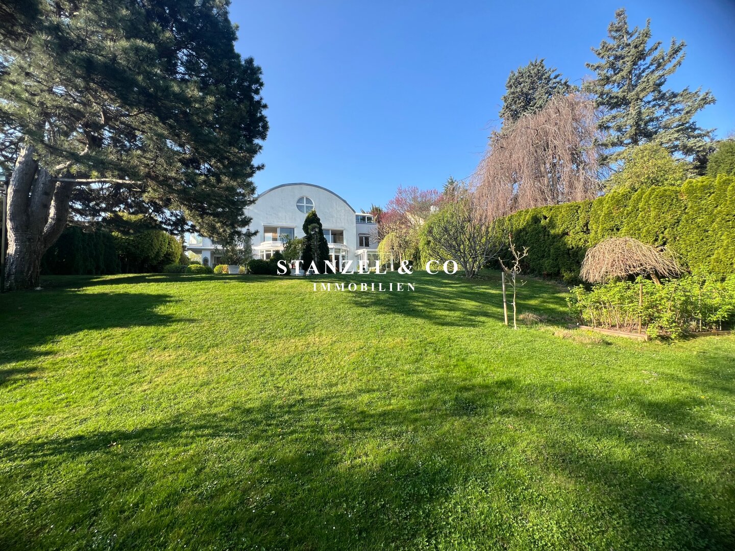 ( herricher Garten, 3 Terrassen, Wohnsalon, Wohnküche, Wintergarten, 2 – 3 Schlafzimmer, 2 Bäder, Weinkeller, Fitnessraum, Sauna, 5 WCs, 2 Hobbyräumen & 4 Garagenstellplätzen )