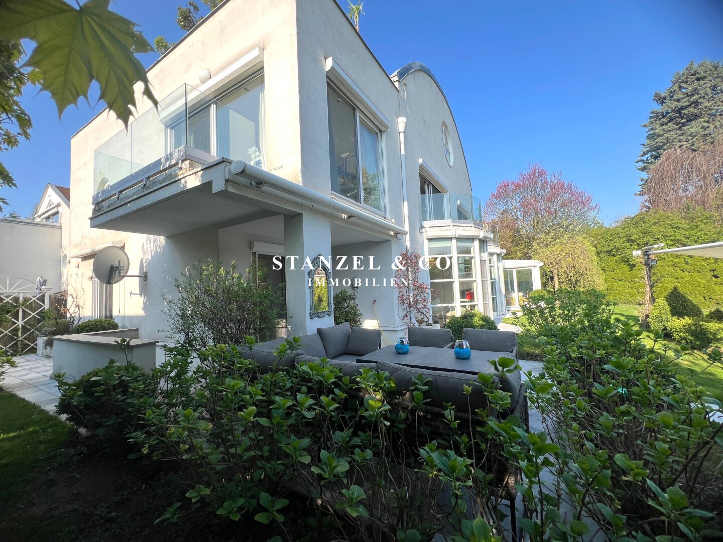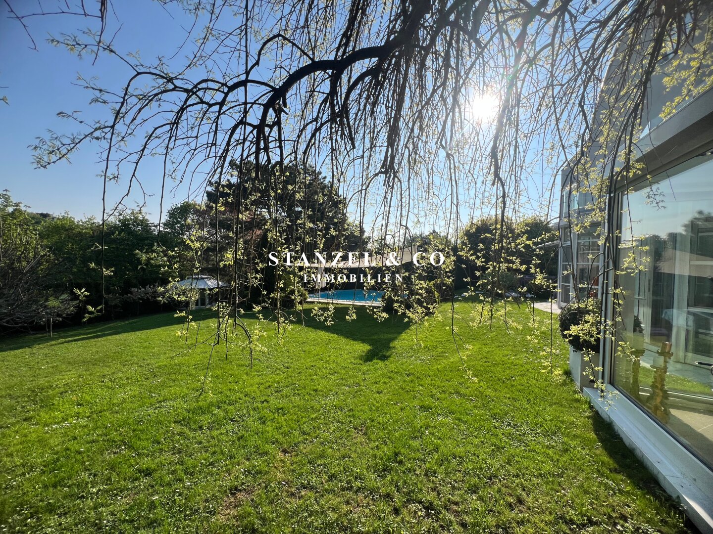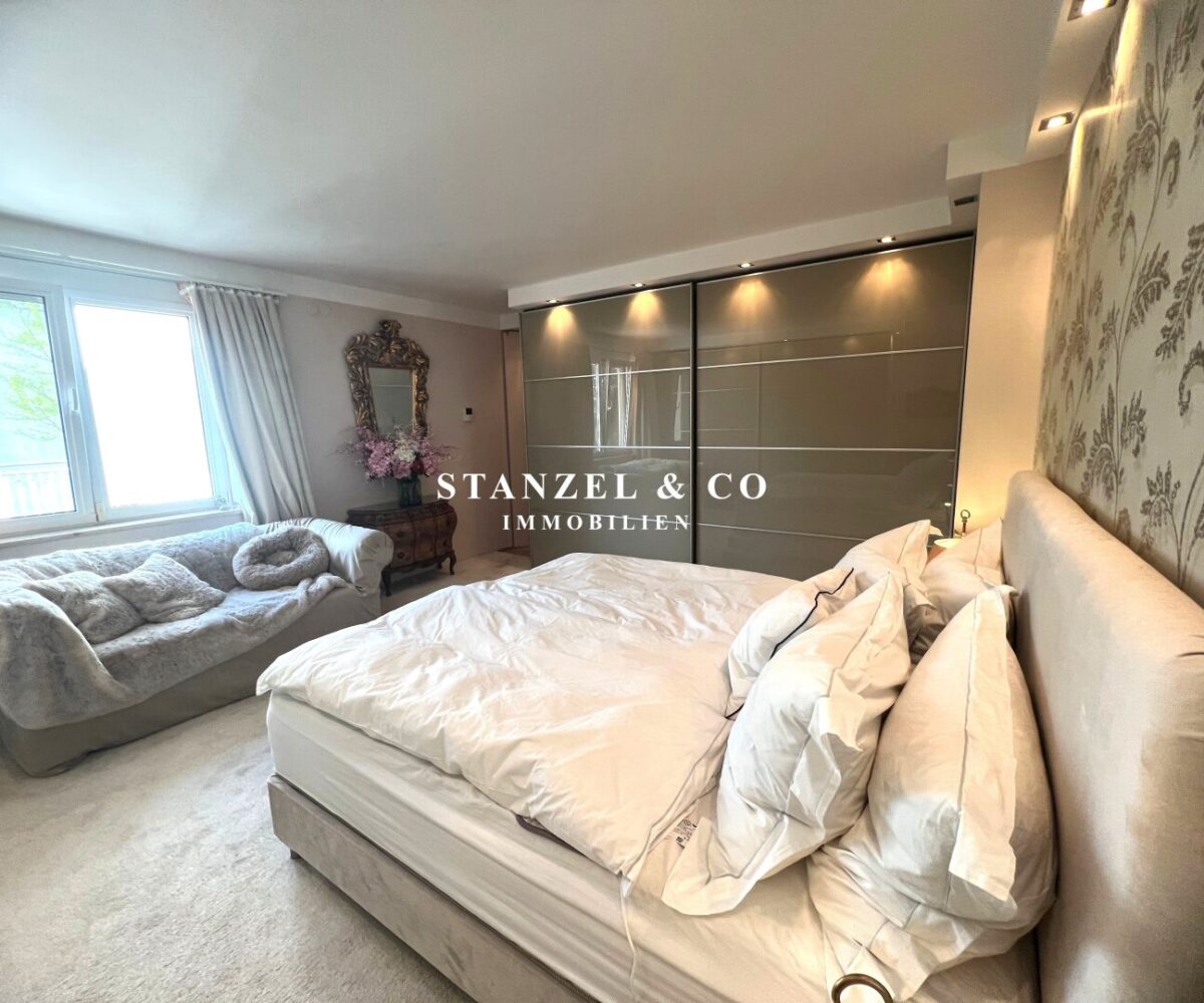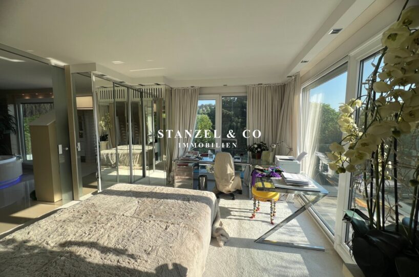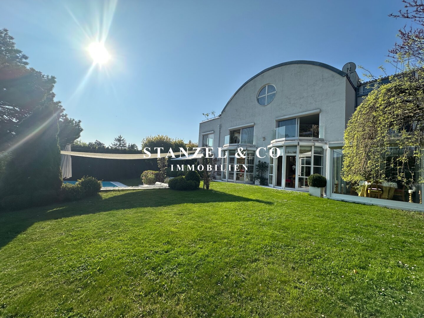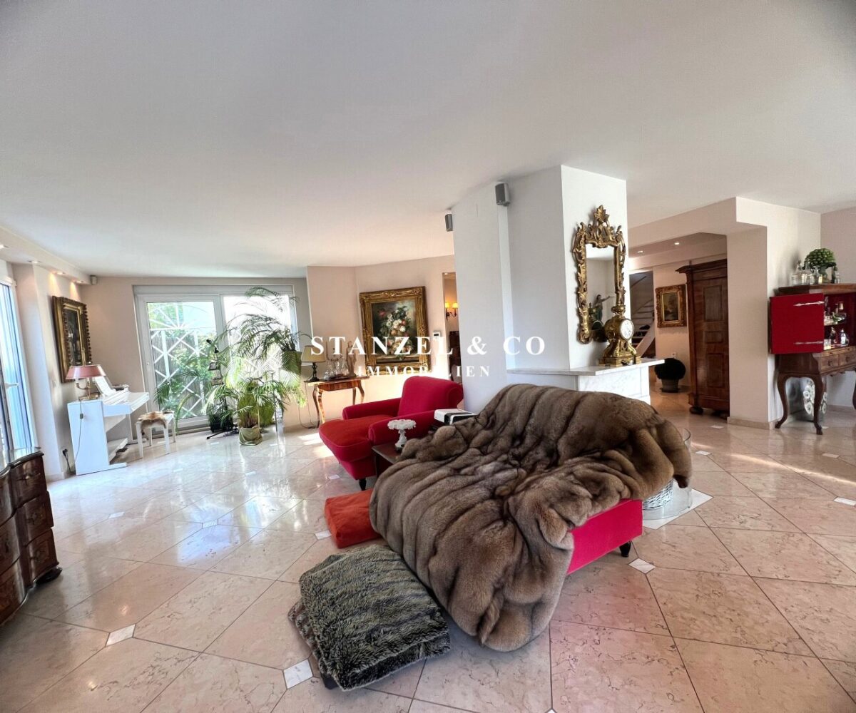 ( herricher Garten, 3 Terrassen, Wohnsalon, Wohnküche, Wintergarten, 2 – 3 Schlafzimmer, 2 Bäder, Weinkeller, Fitnessraum, Sauna, 5 WCs, 2 Hobbyräumen & 4 Garagenstellplätzen )