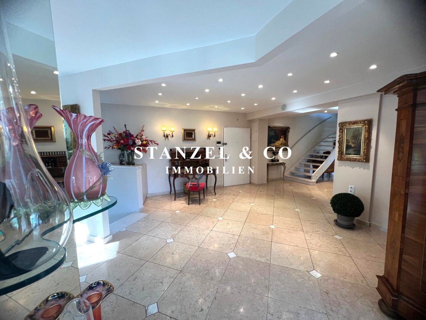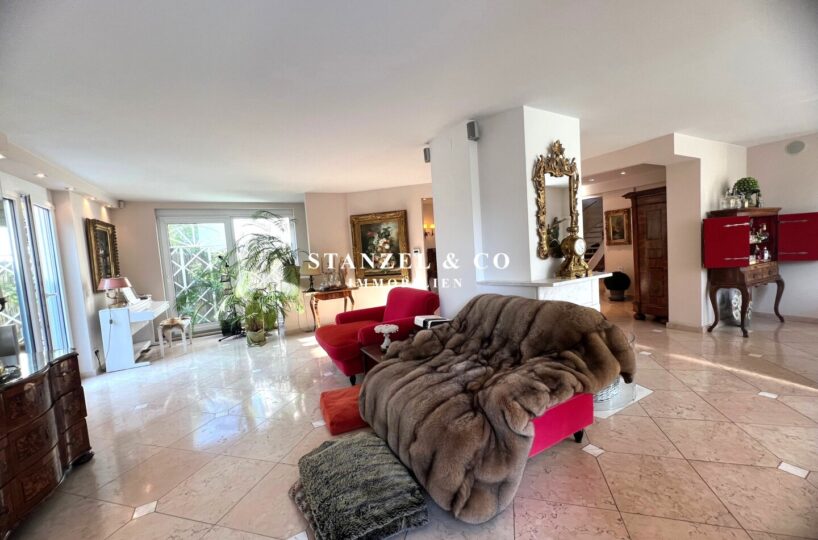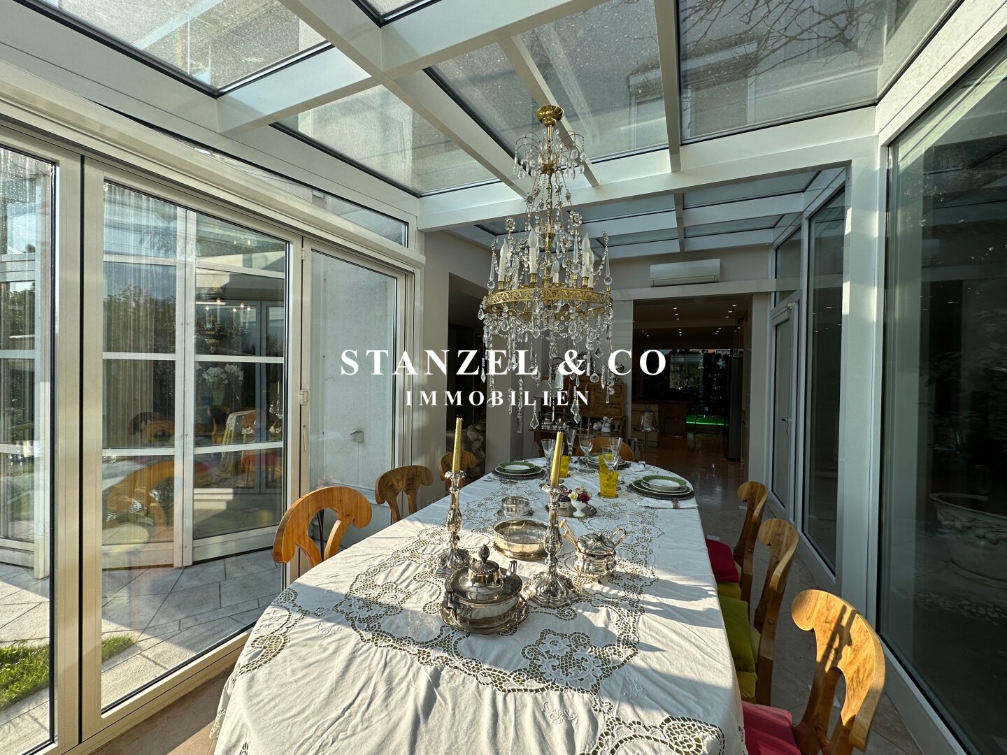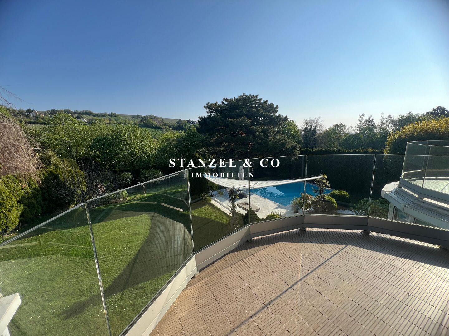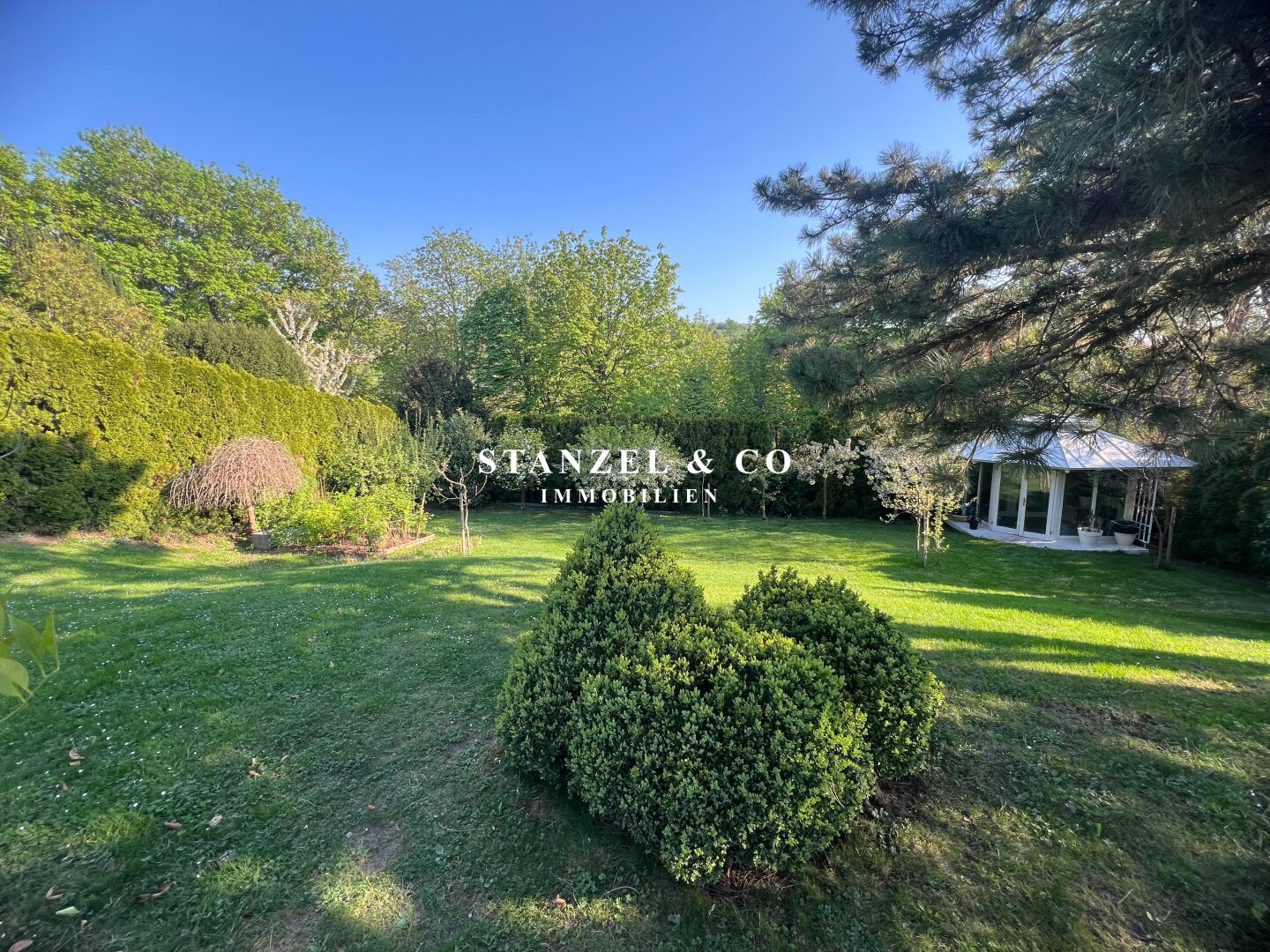 ( herricher Garten, 3 Terrassen, Wohnsalon, Wohnküche, Wintergarten, 2 – 3 Schlafzimmer, 2 Bäder, Weinkeller, Fitnessraum, Sauna, 5 WCs, 2 Hobbyräumen & 4 Garagenstellplätzen )