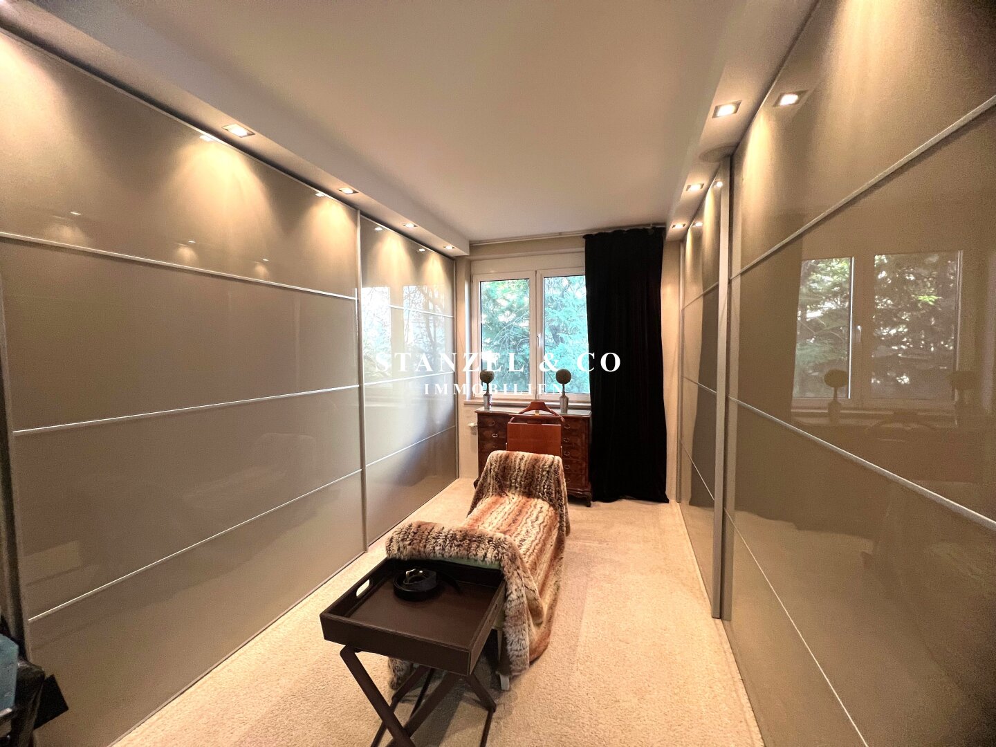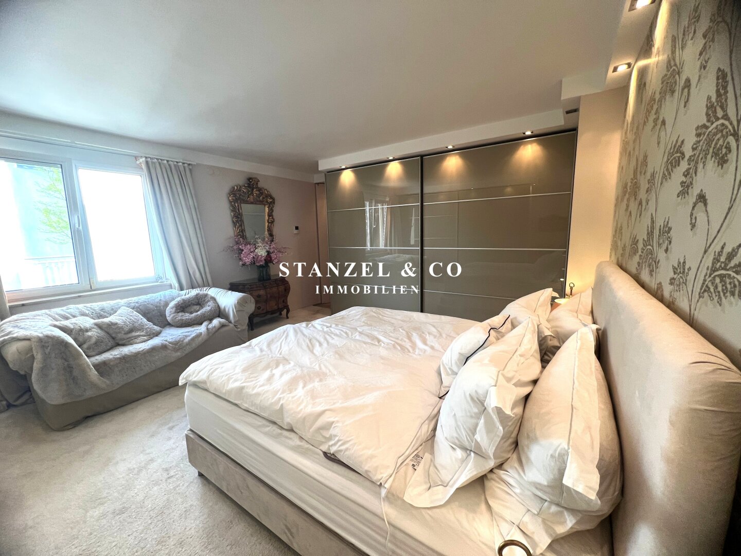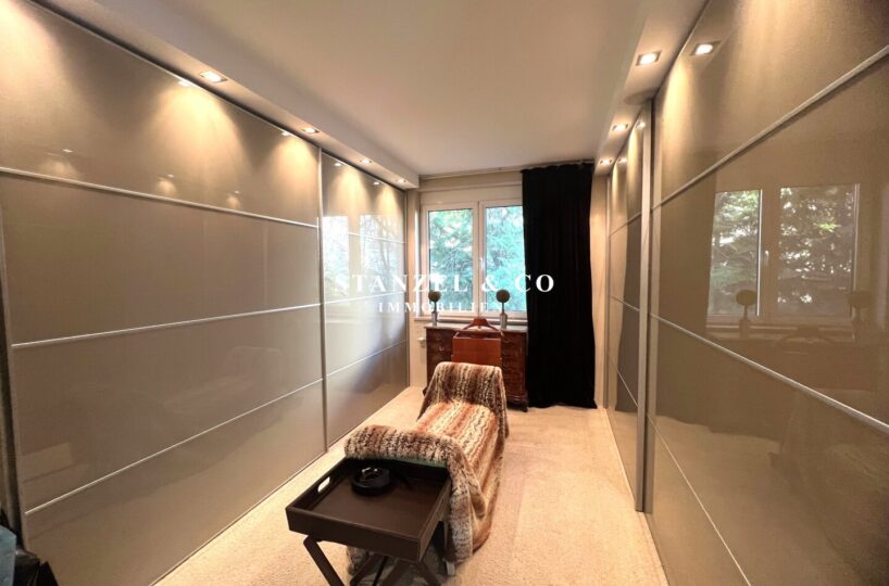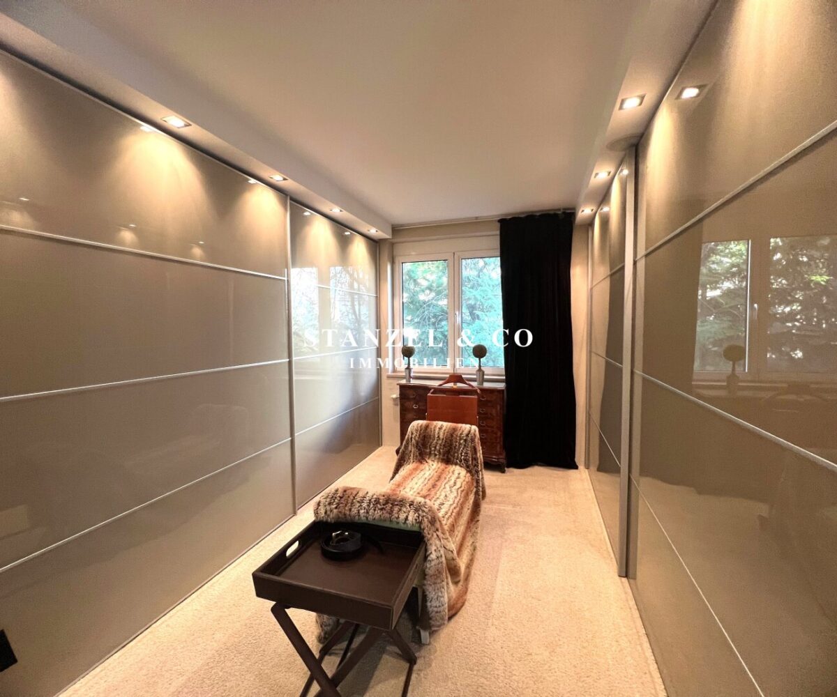 Vom 12m² großen Vorzimmer gelangt, man in das 30m² große Schlafzimmer, welches ost- und gartenseitig orientiert ist – aktuell ist dieses in einen Arbeitsbereich und eine begehbare Garderobe unterteilt.