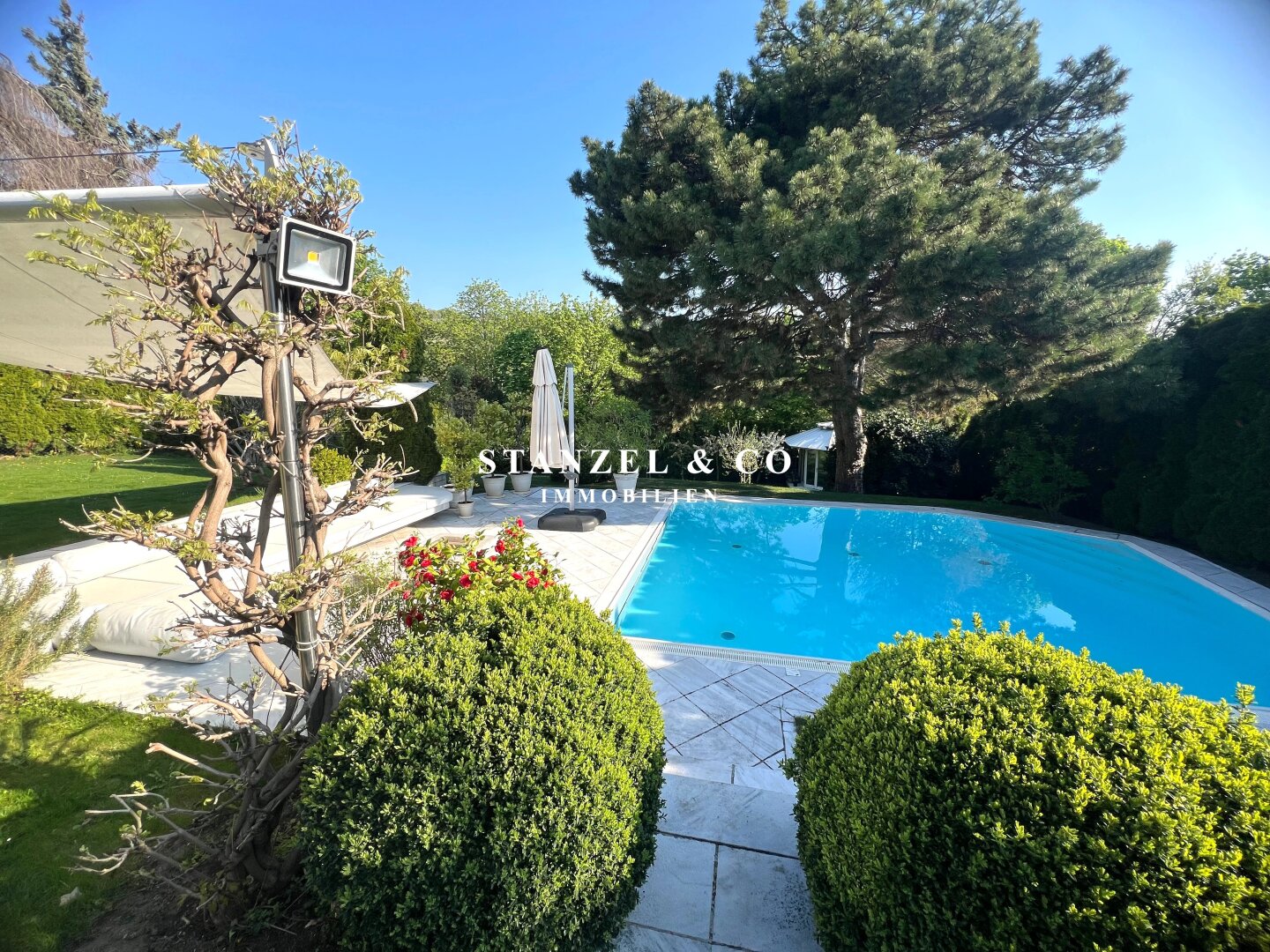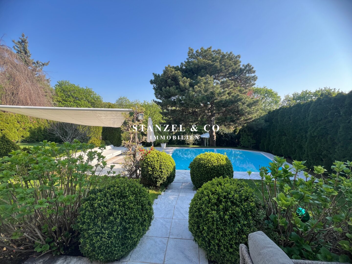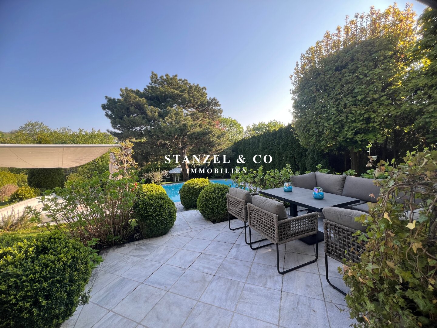 Im 1.050m² großen, uneinsehbaren Garten befindet sich ein großzügiger Pool und eine Terrasse mit Sonnensegel und Loungebereich.