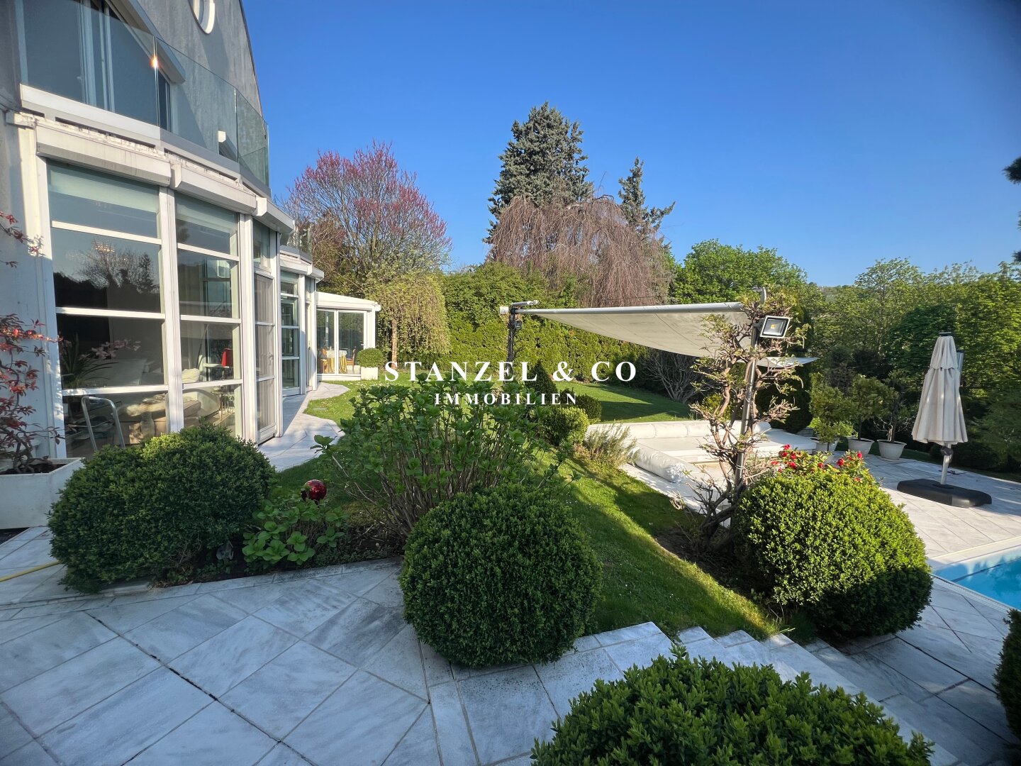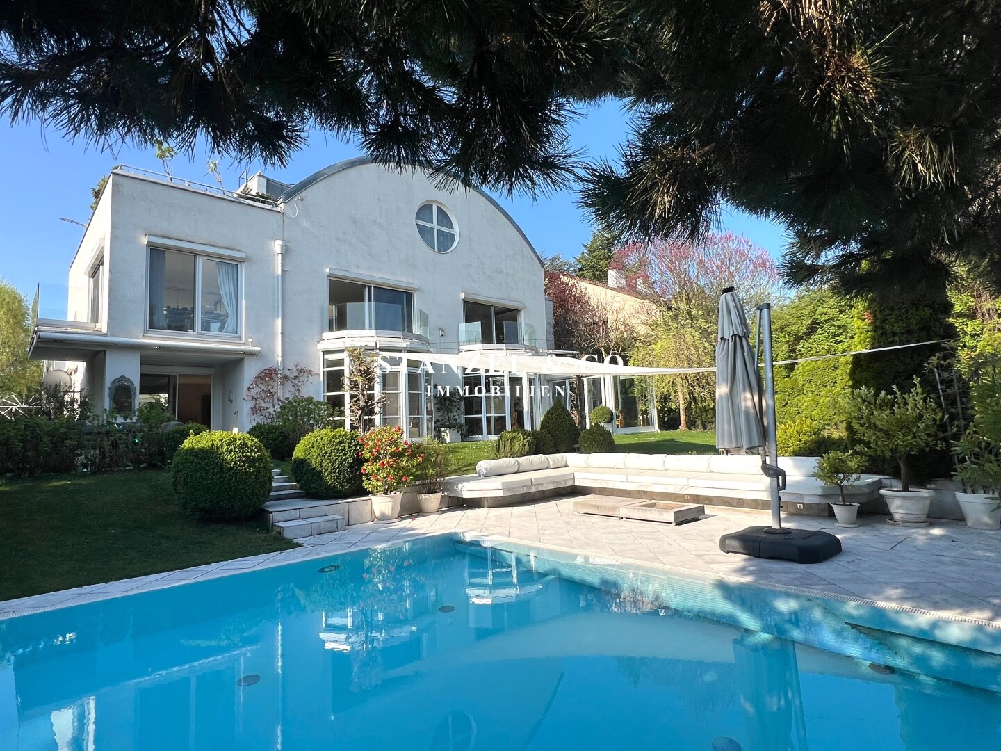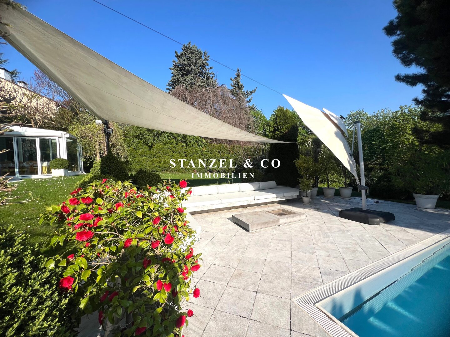 Im 1.050m² großen, uneinsehbaren Garten befindet sich ein großzügiger Pool und eine Terrasse mit Sonnensegel und Loungebereich.
