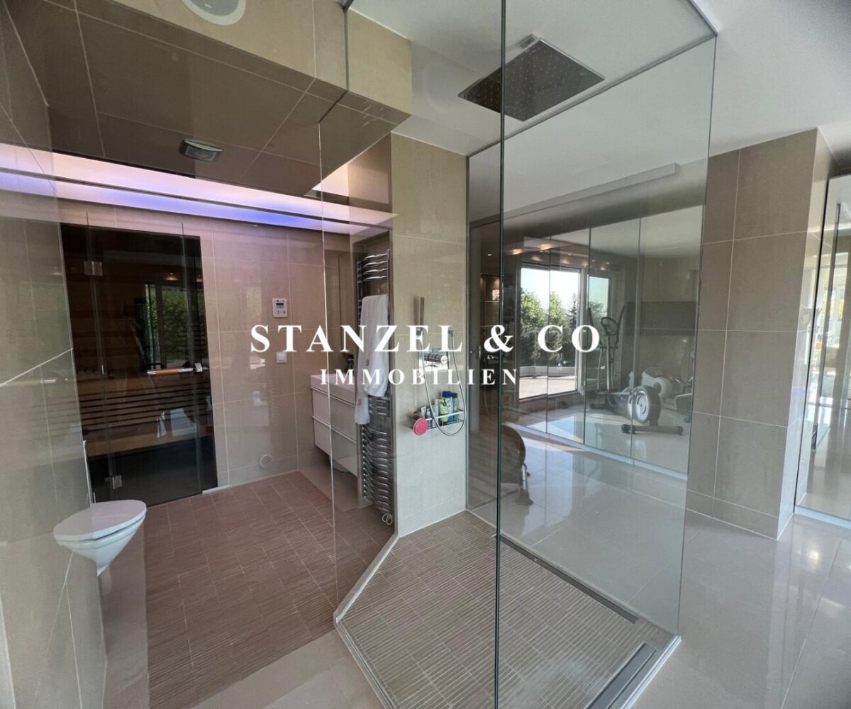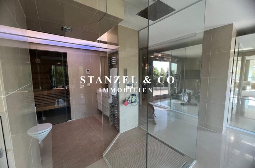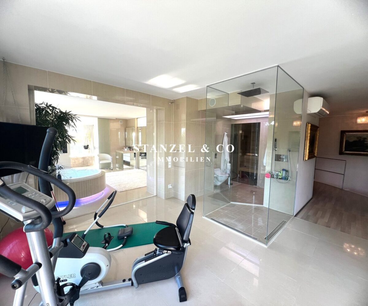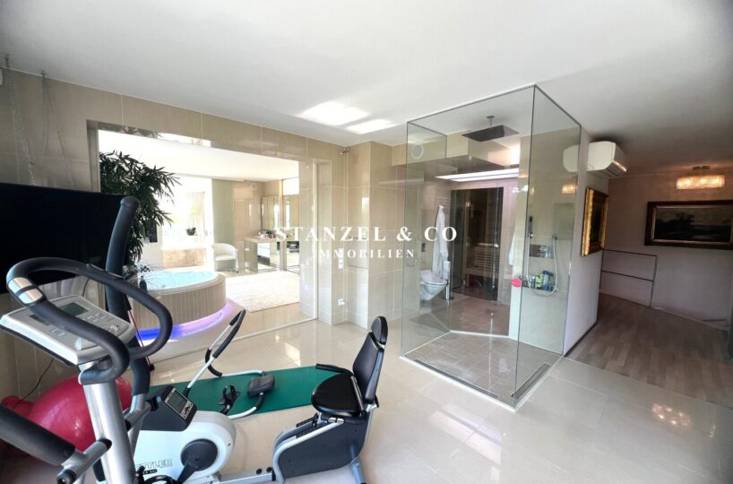 Der 23m² große, gartenseitige Fitnessraum mit 4m² großer Terrasse ist mit dem Badezimmer verbunden – dieser ist mit einer 3m² großen Sauna, einer großen Glasdusche mit Regenduschkopf und einem WC ausgestattet.