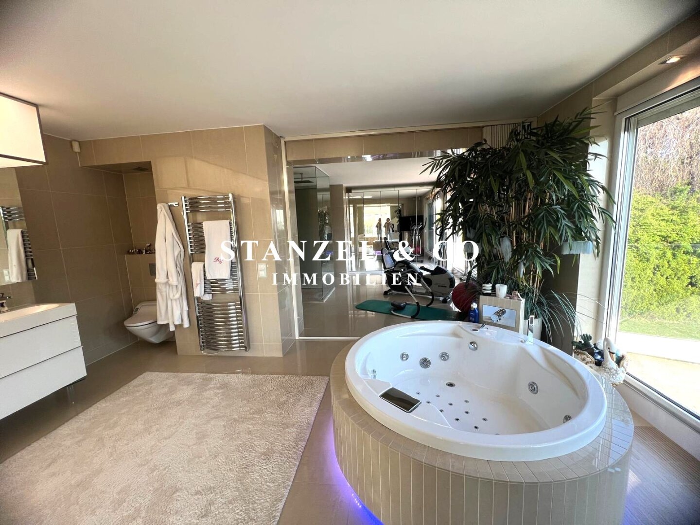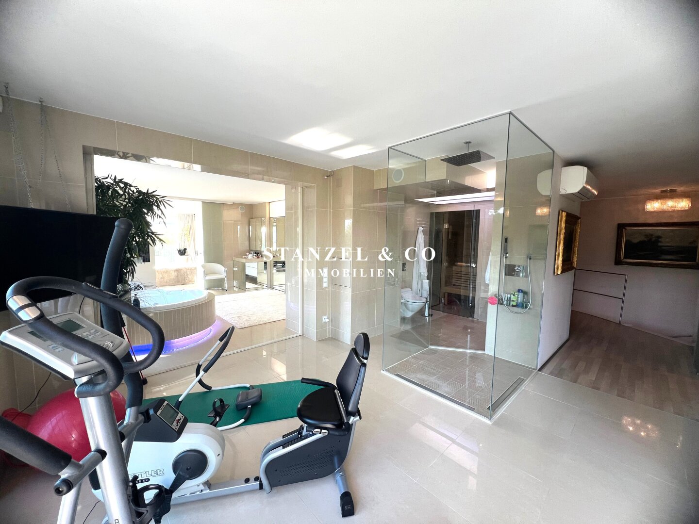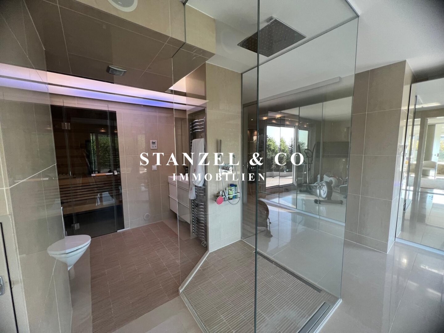 Der 23m² große, gartenseitige Fitnessraum mit 4m² großer Terrasse ist mit dem Badezimmer verbunden – dieser ist mit einer 3m² großen Sauna, einer großen Glasdusche mit Regenduschkopf und einem WC ausgestattet.