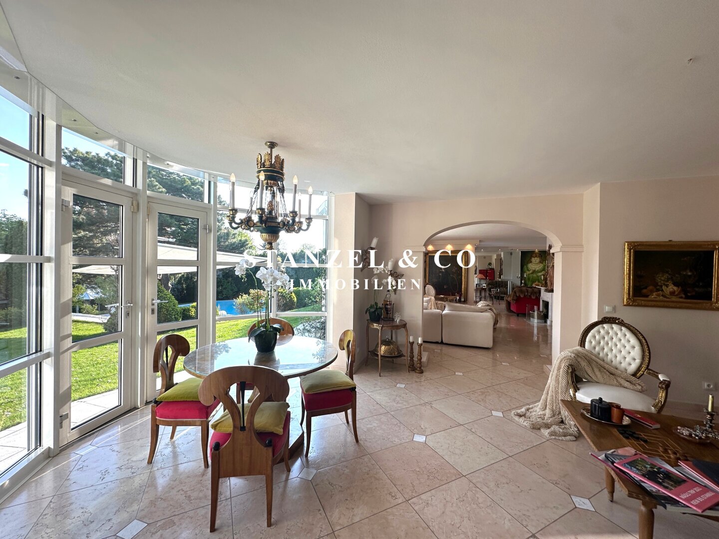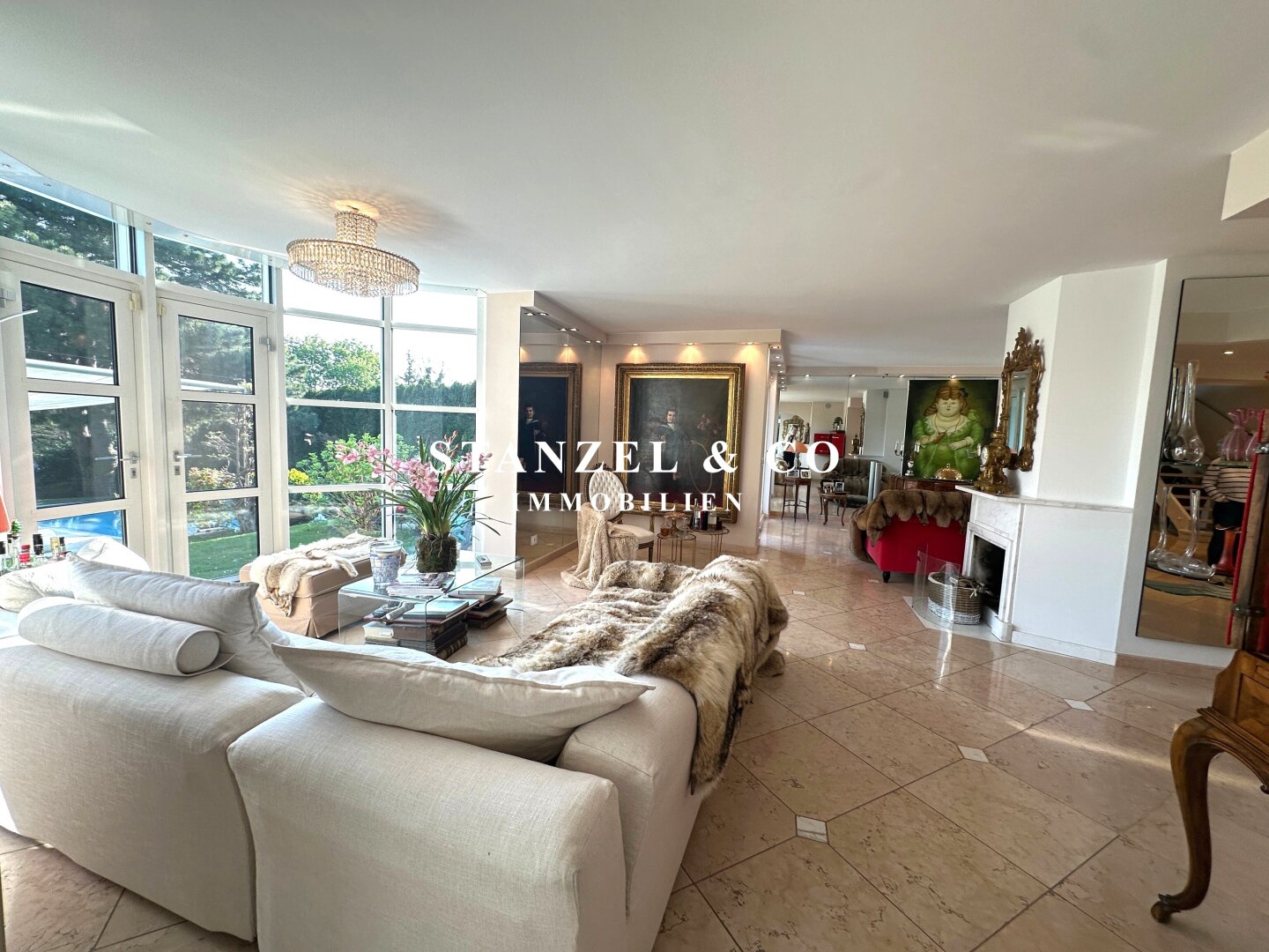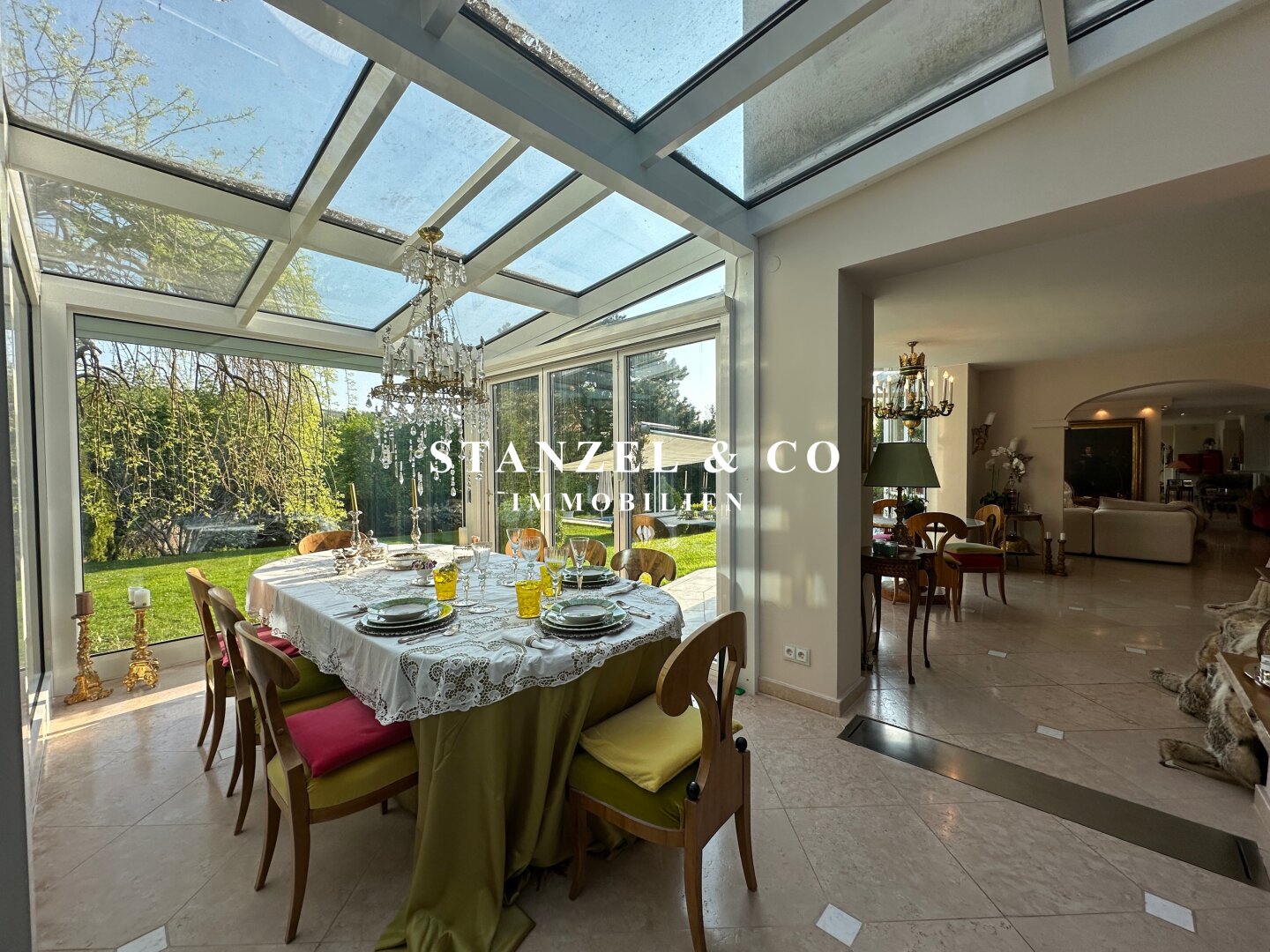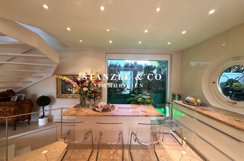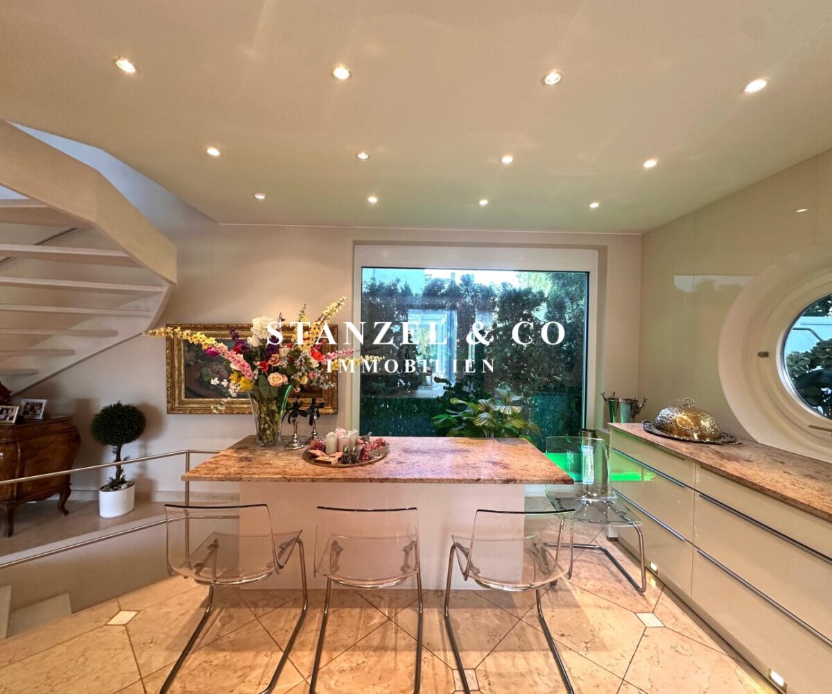 An das 14m² große Vorzimmer schließt die 24m² große moderne Küche an sowie der 105m² große Wohnsalon. Sowohl die Küche, welche mit Backrohr, Ceranfeld, Dampfgarer, Kaffeemaschine, Geschirrspüler, Bar und amerikanischem Kühlschrank ausgestattet ist, als auch der Wohnsalon sind mit dem 17m² großen Wintergarten und dem direkt anschließenden Garten verbunden. Der weitläufige Wohnsalon, welcher über einen offenen Kamin verfügt, ist durch großzügige Panoramaglastüren mit den umliegenden Terrassen verbunden.