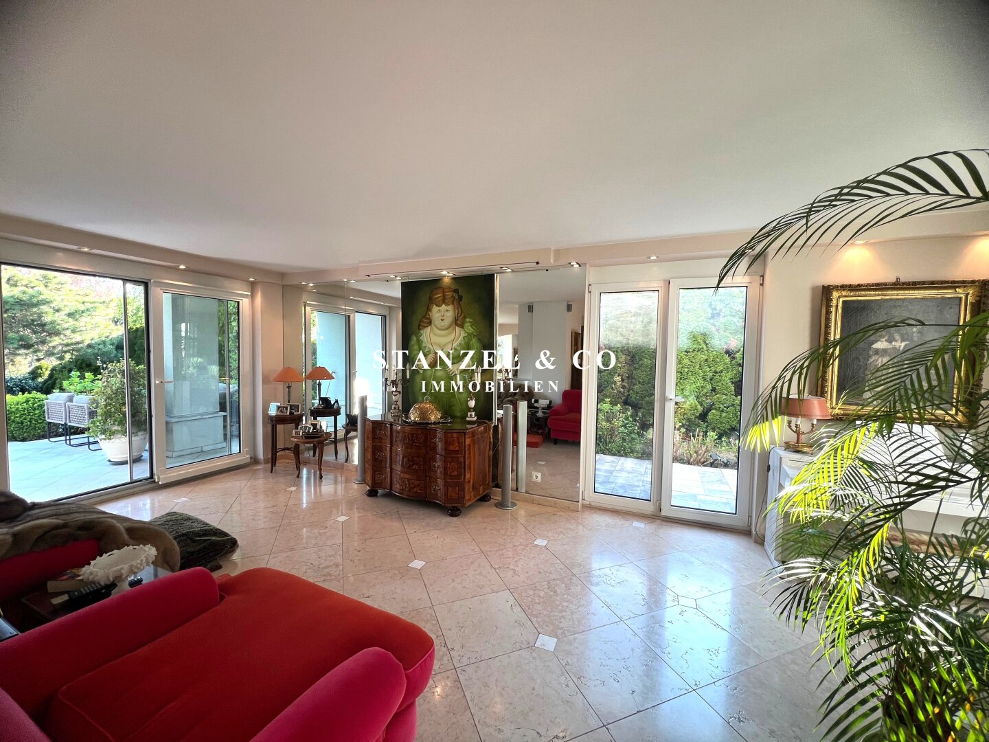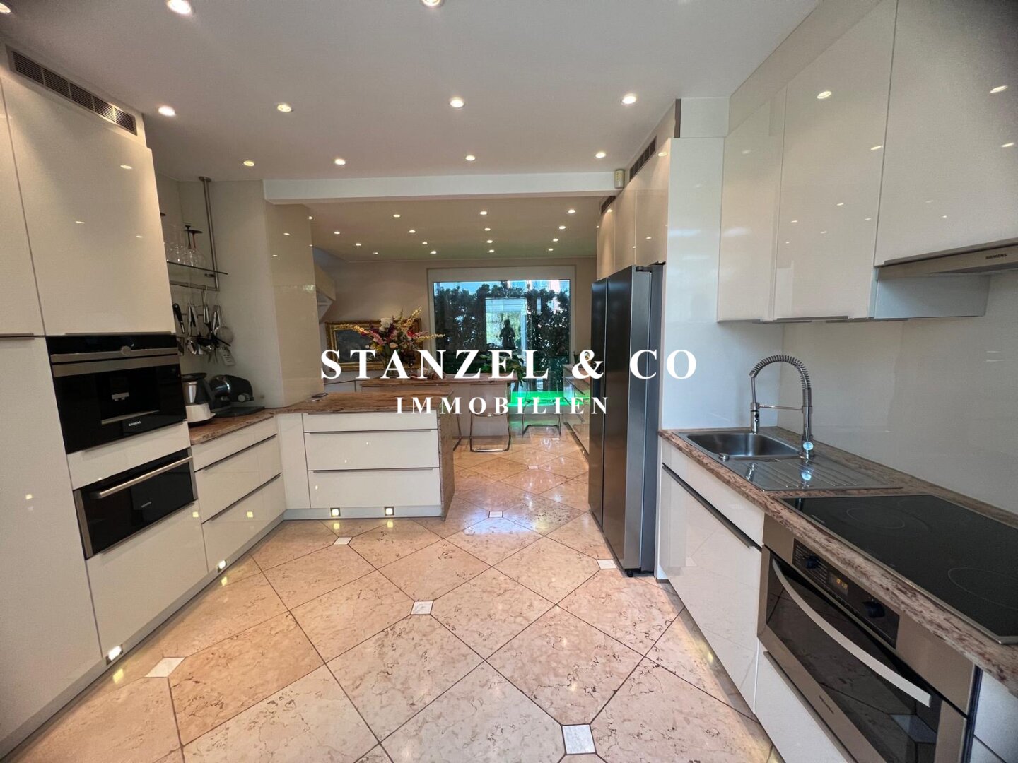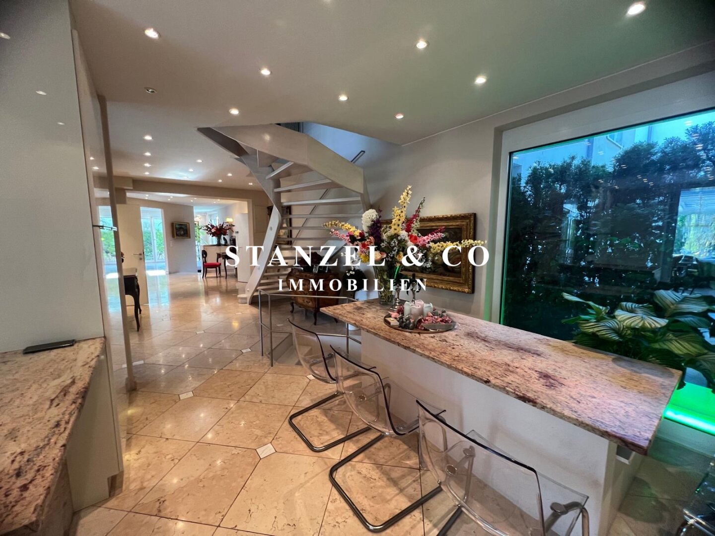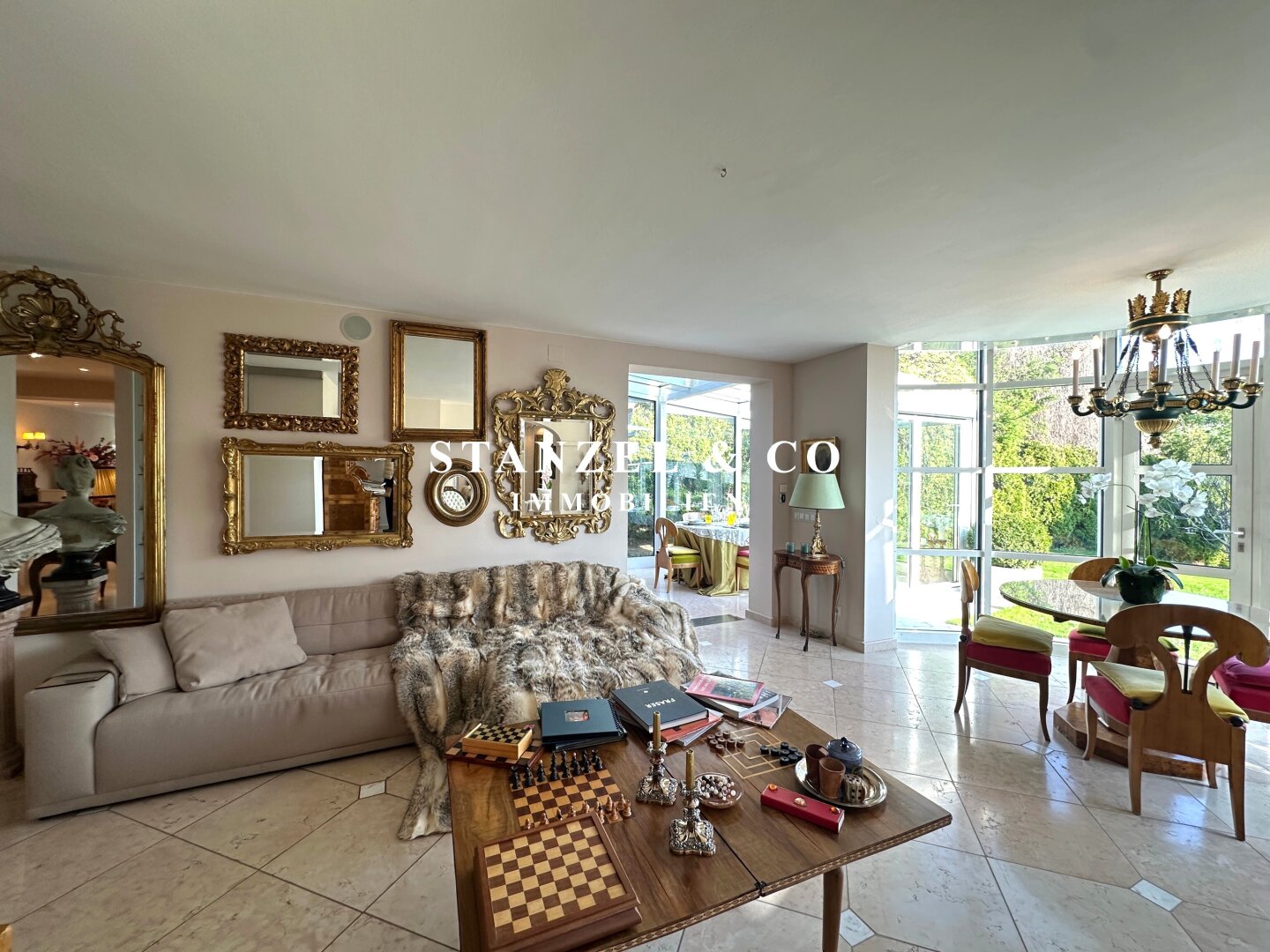 An das 14m² große Vorzimmer schließt die 24m² große moderne Küche an sowie der 105m² große Wohnsalon. Sowohl die Küche, welche mit Backrohr, Ceranfeld, Dampfgarer, Kaffeemaschine, Geschirrspüler, Bar und amerikanischem Kühlschrank ausgestattet ist, als auch der Wohnsalon sind mit dem 17m² großen Wintergarten und dem direkt anschließenden Garten verbunden. Der weitläufige Wohnsalon, welcher über einen offenen Kamin verfügt, ist durch großzügige Panoramaglastüren mit den umliegenden Terrassen verbunden.