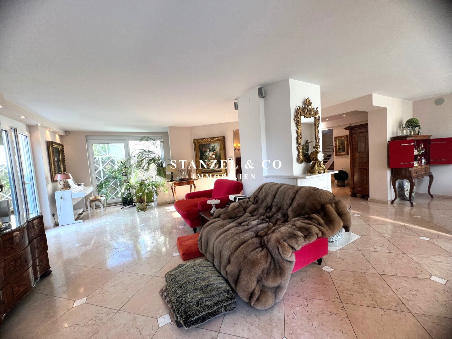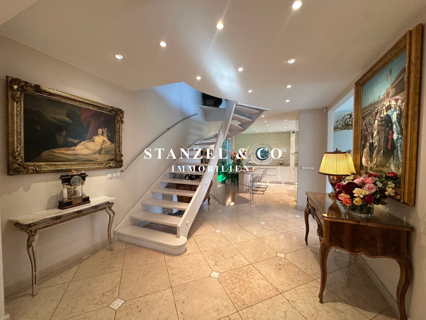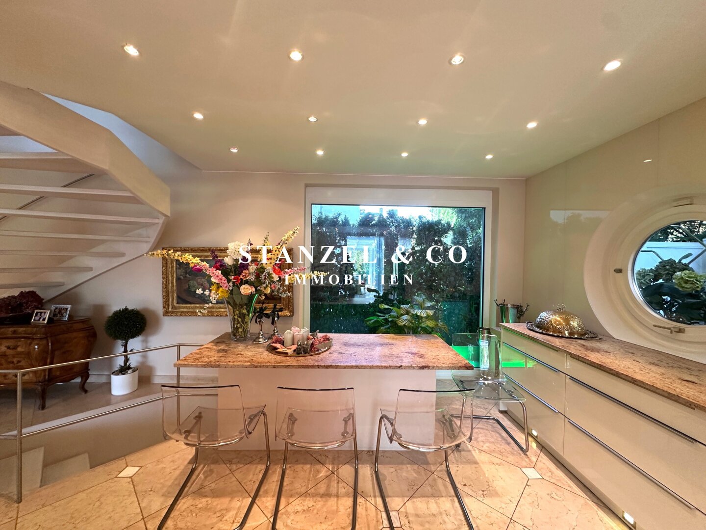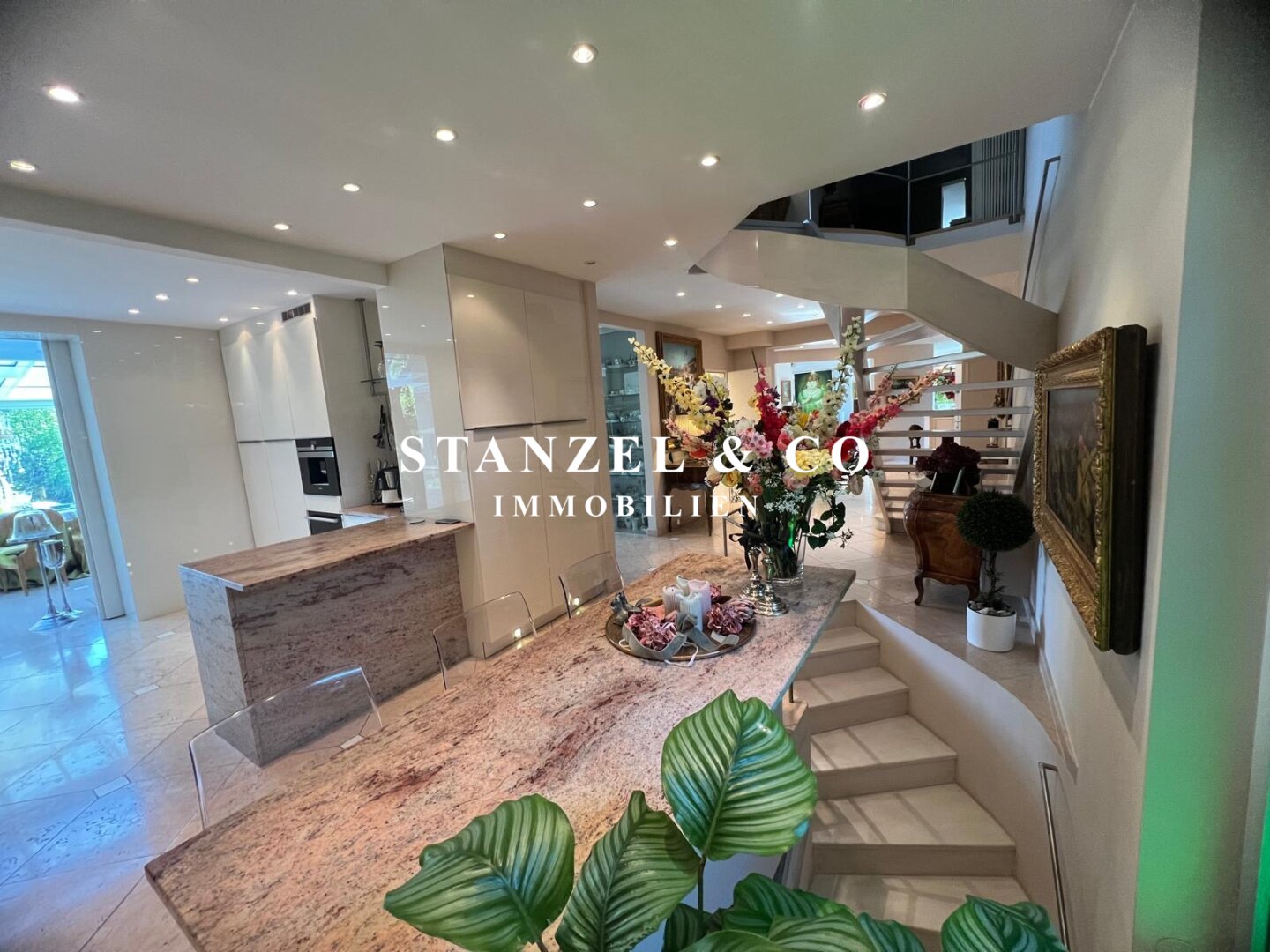 An das 14m² große Vorzimmer schließt die 24m² große moderne Küche an sowie der 105m² große Wohnsalon. Sowohl die Küche, welche mit Backrohr, Ceranfeld, Dampfgarer, Kaffeemaschine, Geschirrspüler, Bar und amerikanischem Kühlschrank ausgestattet ist, als auch der Wohnsalon sind mit dem 17m² großen Wintergarten und dem direkt anschließenden Garten verbunden. Der weitläufige Wohnsalon, welcher über einen offenen Kamin verfügt, ist durch großzügige Panoramaglastüren mit den umliegenden Terrassen verbunden.