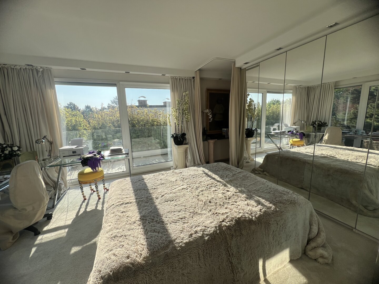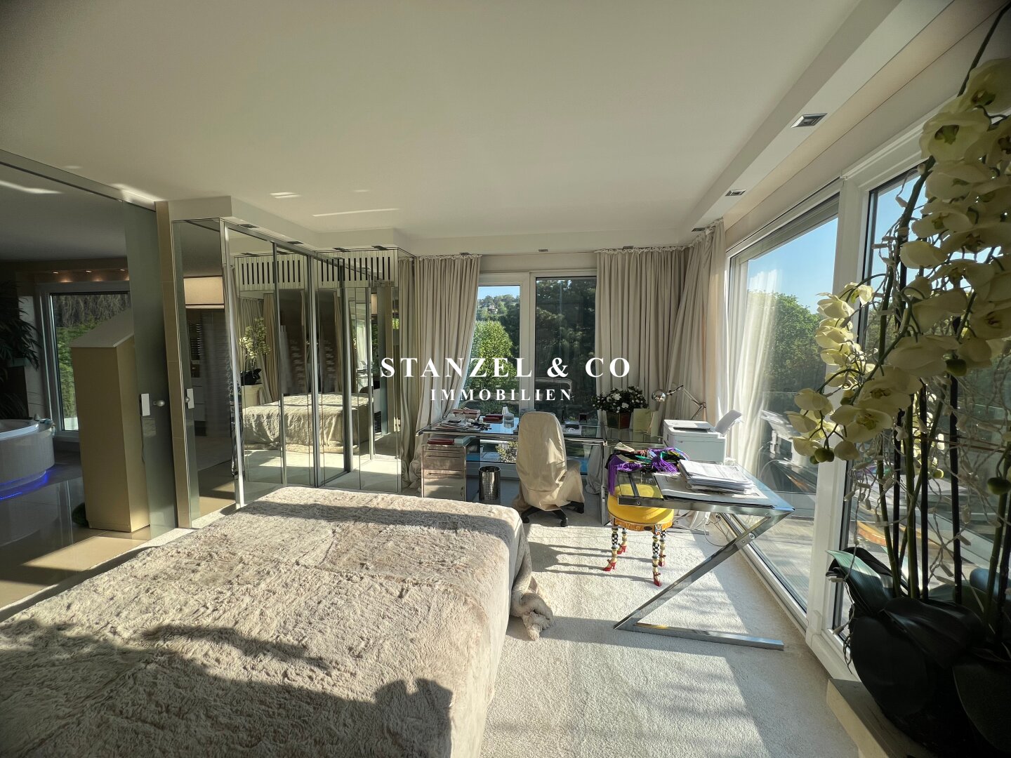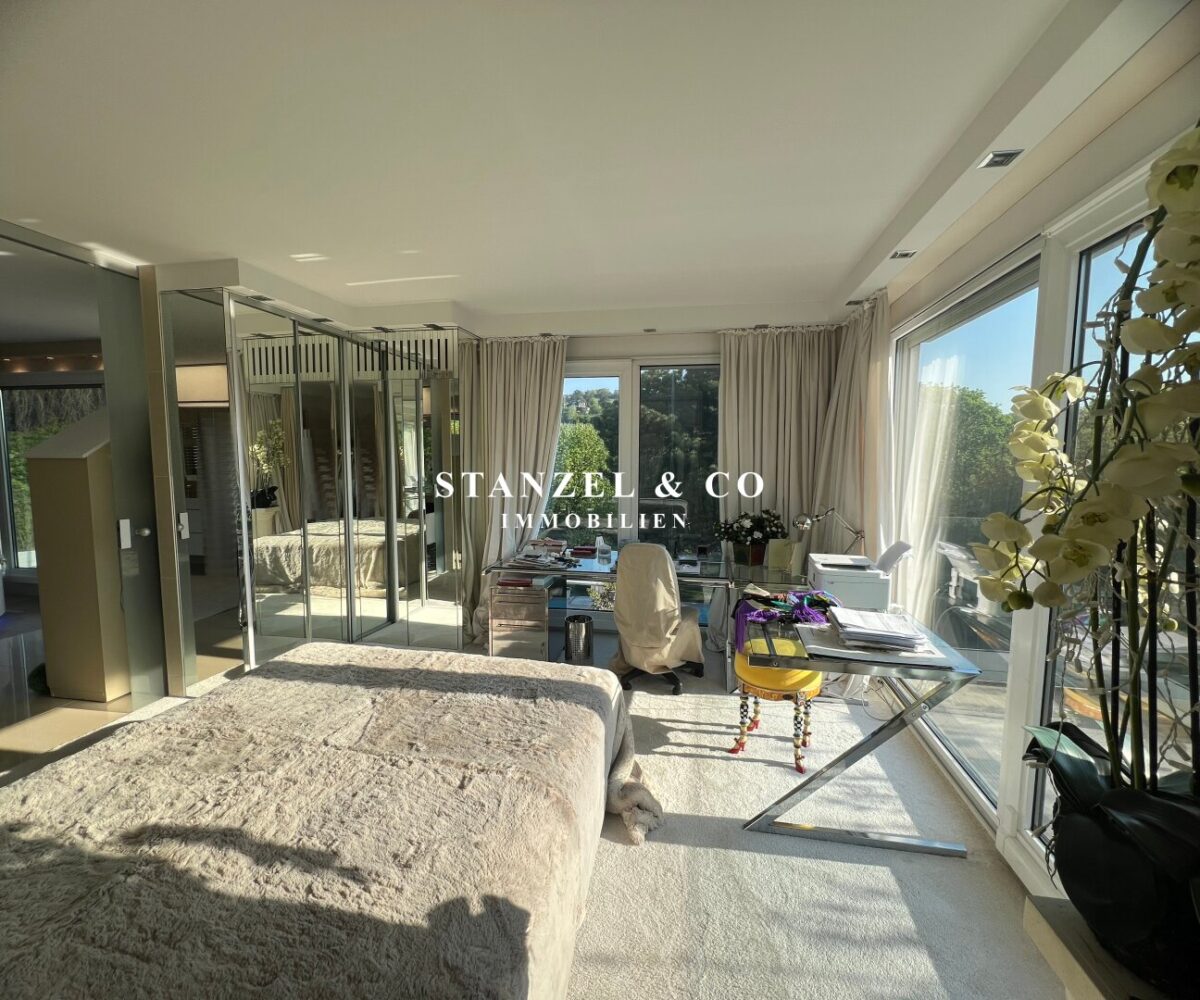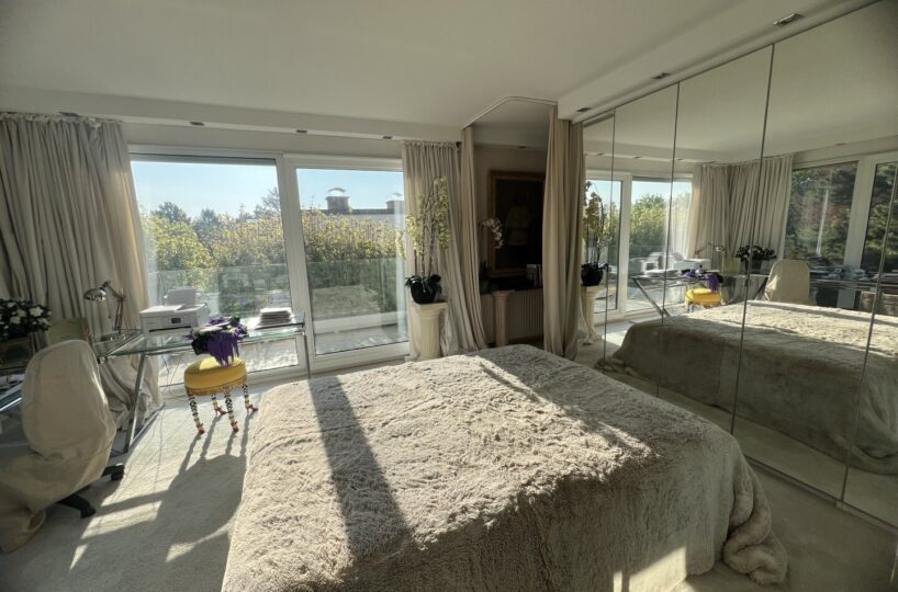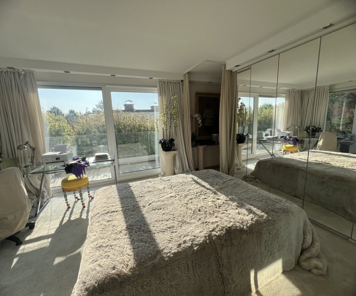 Durch die 18m² Galerie, welche als Schlafzimmer genutzt wird, gelangt man in das 38m² große Schlafzimmer mit anschließenem Ostbalkon – dieses teilt sich ebenfalls in ein Schlafzimmer und ein Arbeitszimmer. Das 25m² große Badezimmer ist durch Glasschiebetüren mit der 4m² großen Terrasse verbunden und verfügt über einen Doppelwaschtisch mit Unterschrank, Handtuchtrockner, WC sowie ein freistehendes Jacuzzi.