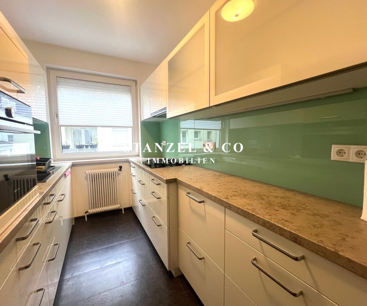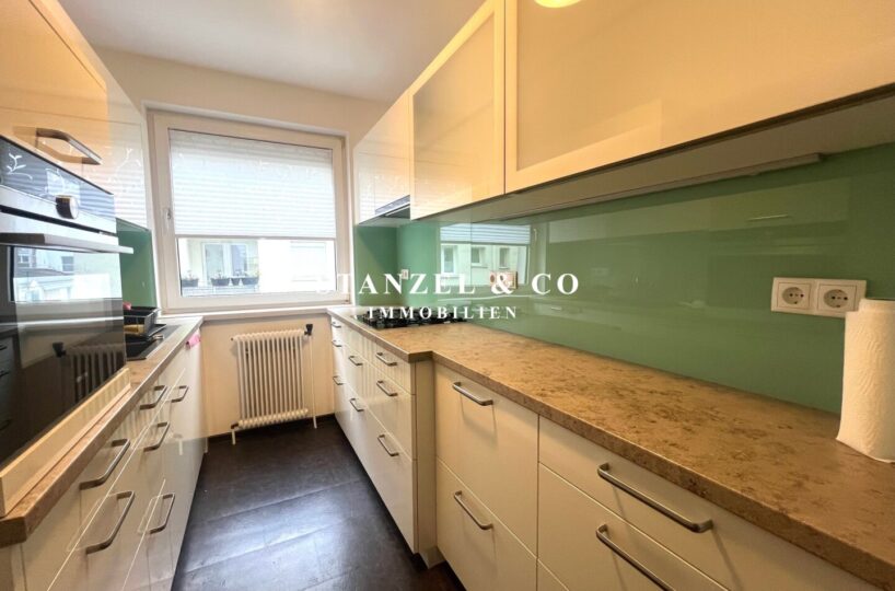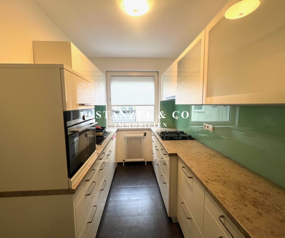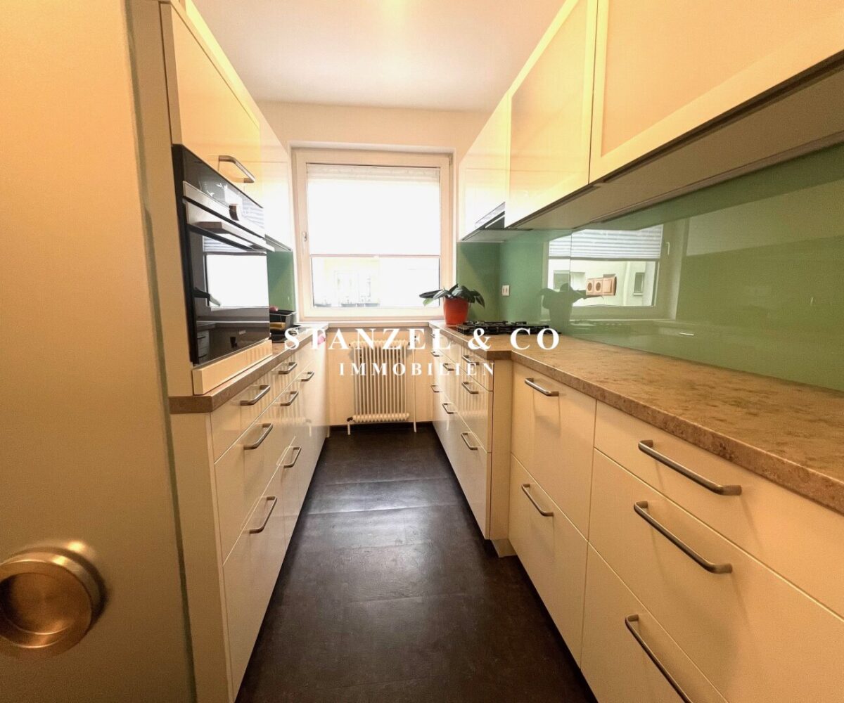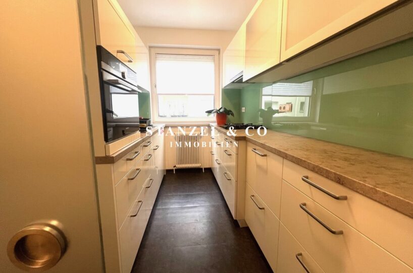 Die 6m² große ebenso neuwertige Küche, mit Fenster, ist ausgestattet ( Ceranfeld, Backrohr, Dunstabzug, Geschirrspüler – hier könnte man auch eine Waschmaschine anschließen, an Stelle eines Küchenkästchens ).