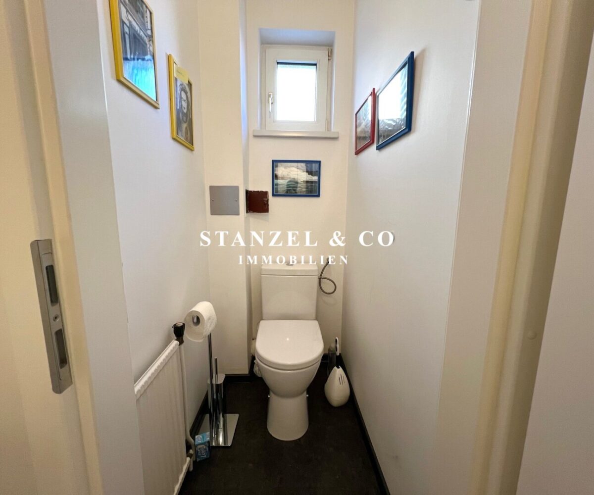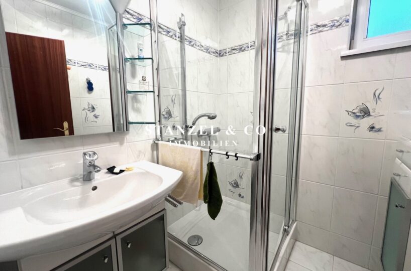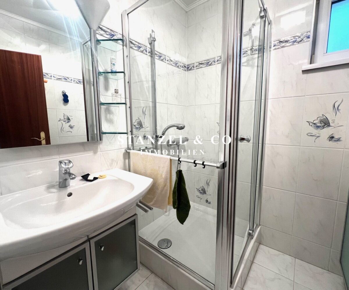 Das Badezimmer ist mit einer Dusche, einem Waschtisch mit Unterschrank, Spiegelschrank und Fenster ausgestattet. Des Weiteren gibt es ein separates WC mit einem Fenster.