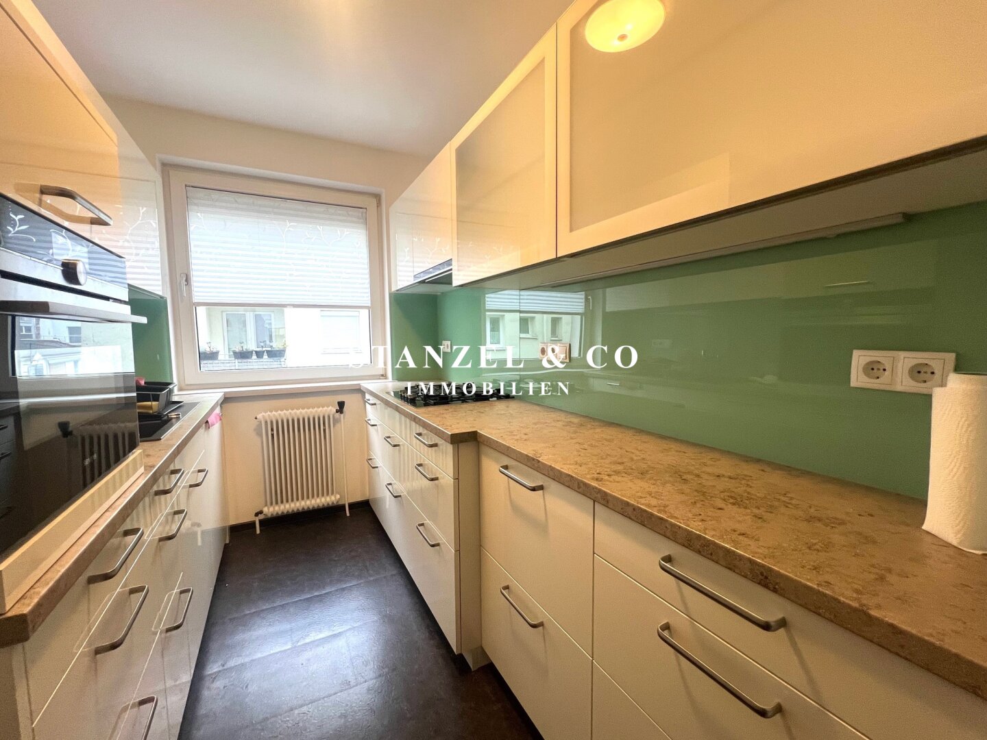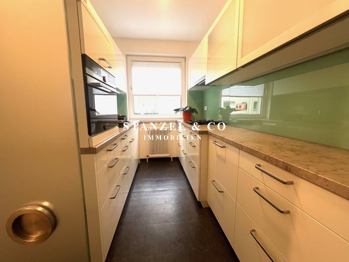 Die 6m² große ebenso neuwertige Küche, mit Fenster, ist ausgestattet ( Ceranfeld, Backrohr, Dunstabzug, Geschirrspüler – hier könnte man auch eine Waschmaschine anschließen, an Stelle eines Küchenkästchens ).