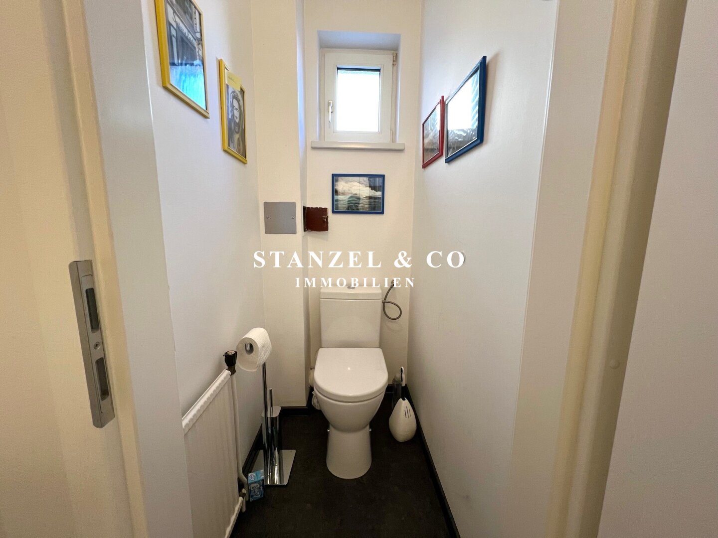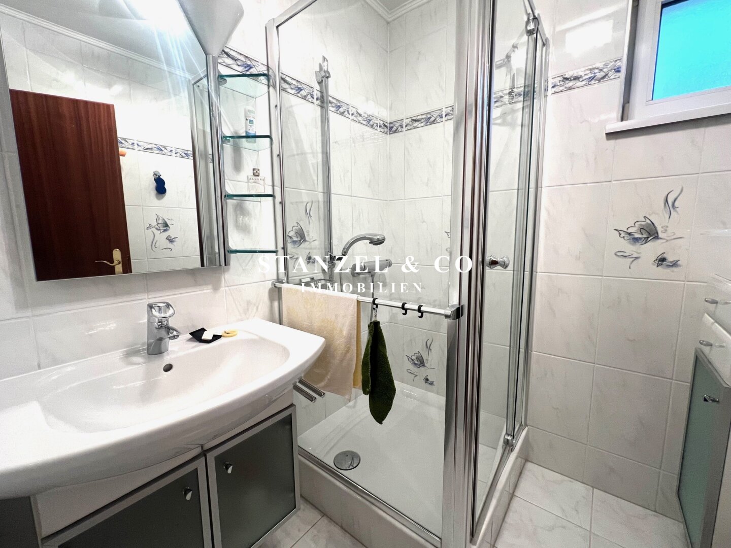Das Badezimmer ist mit einer Dusche, einem Waschtisch mit Unterschrank, Spiegelschrank und Fenster ausgestattet. Des Weiteren gibt es ein separates WC mit einem Fenster.