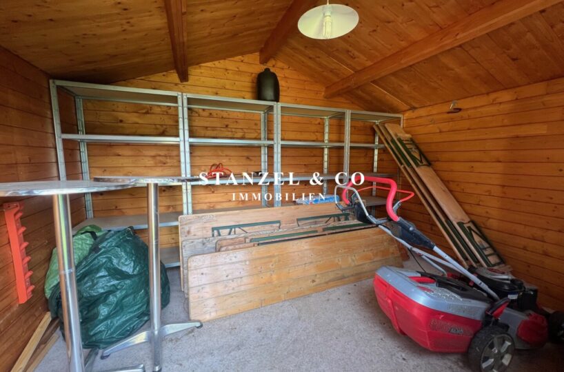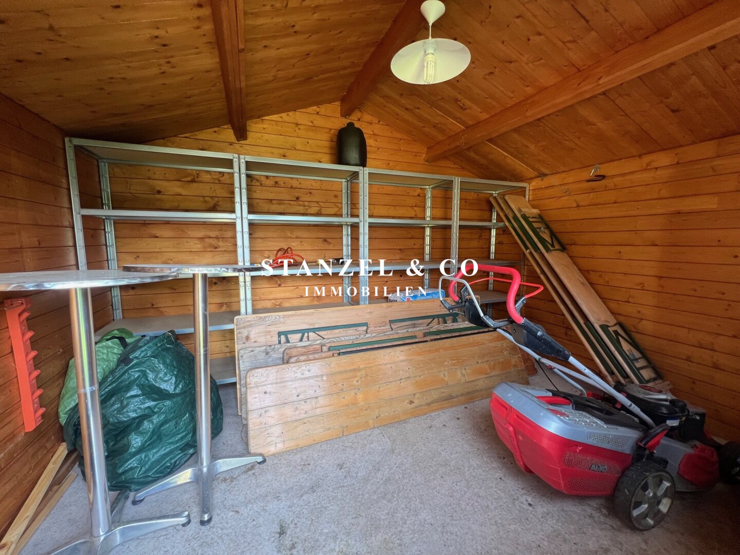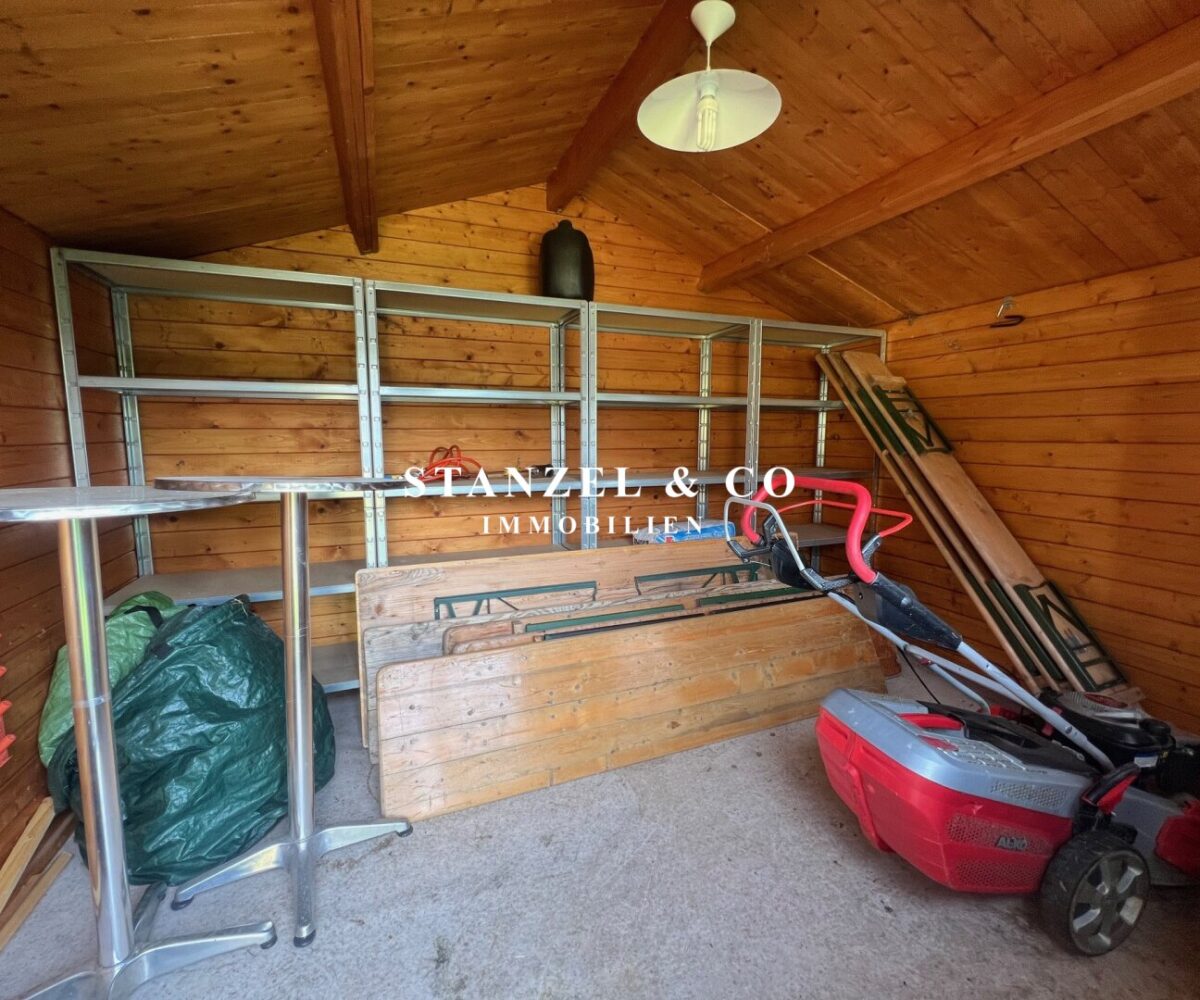Im Garten befindet sich ein kleines Gartenhäuschen, dass Platz für Geräte bietet.
