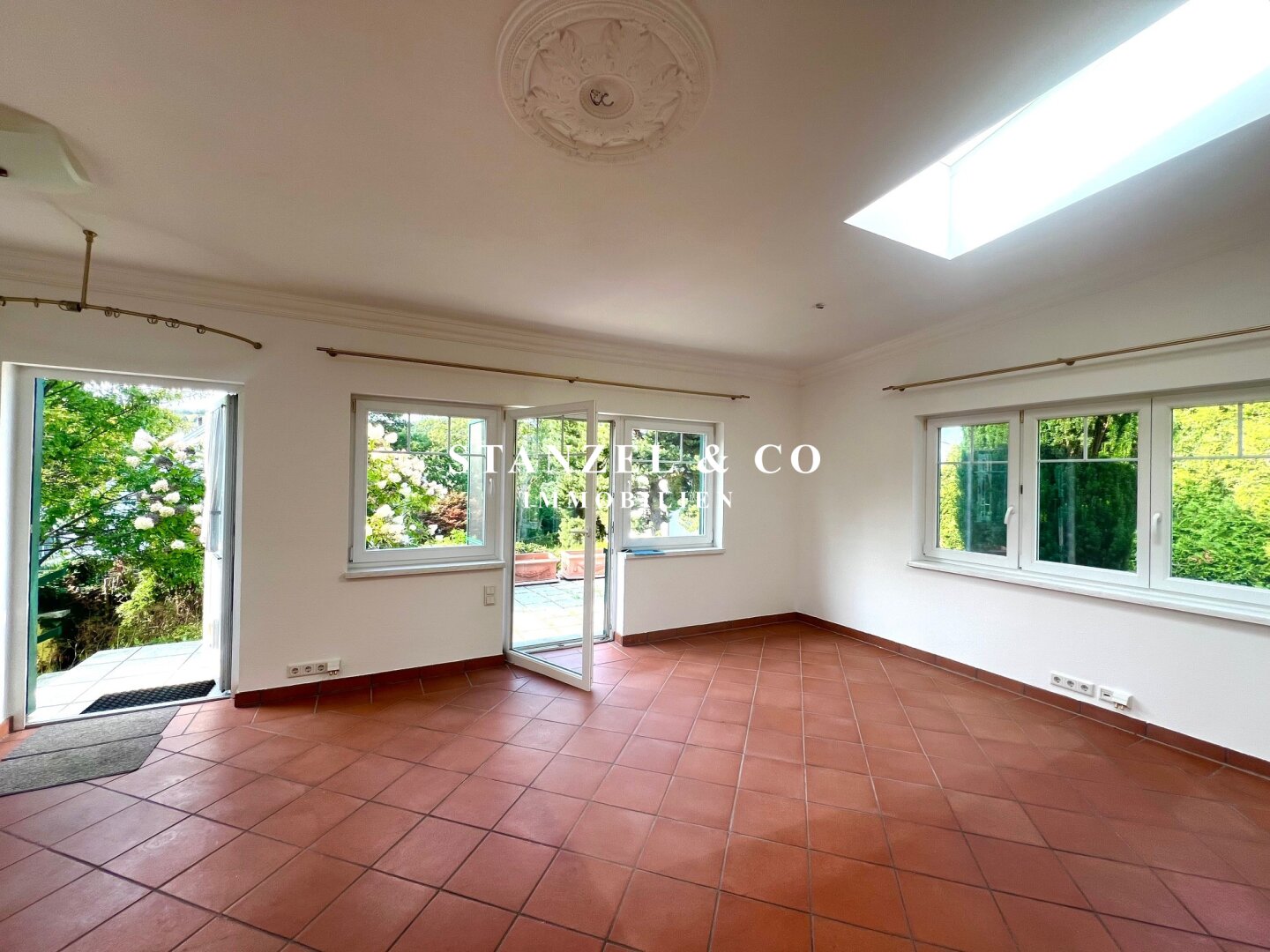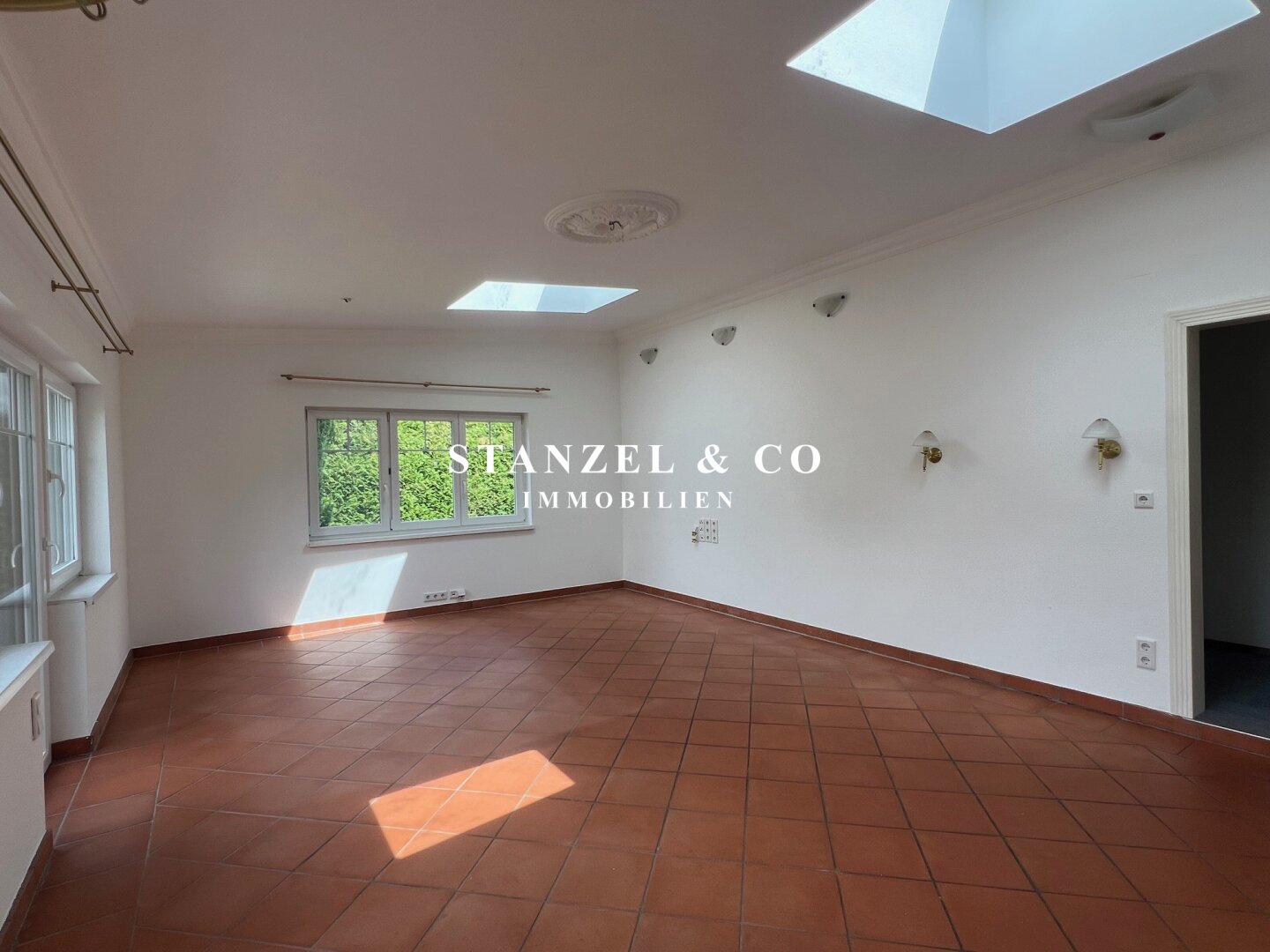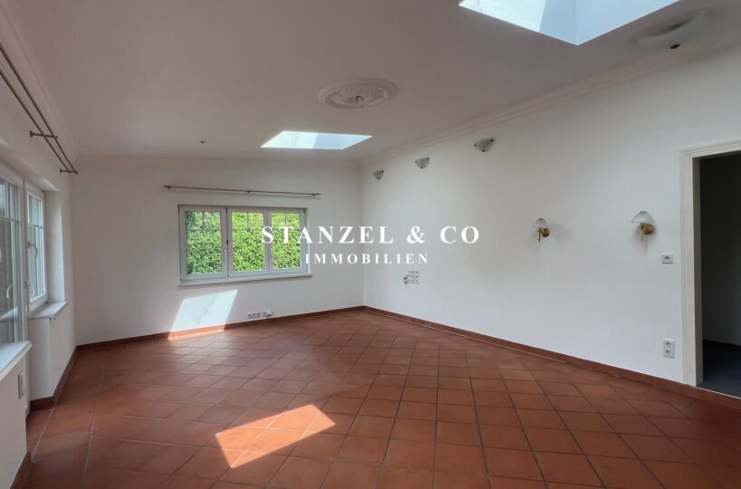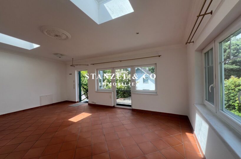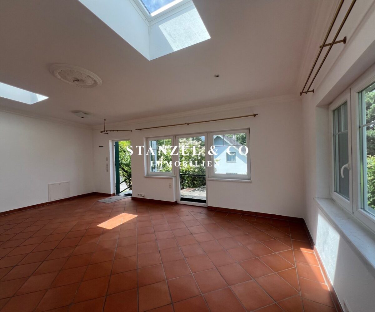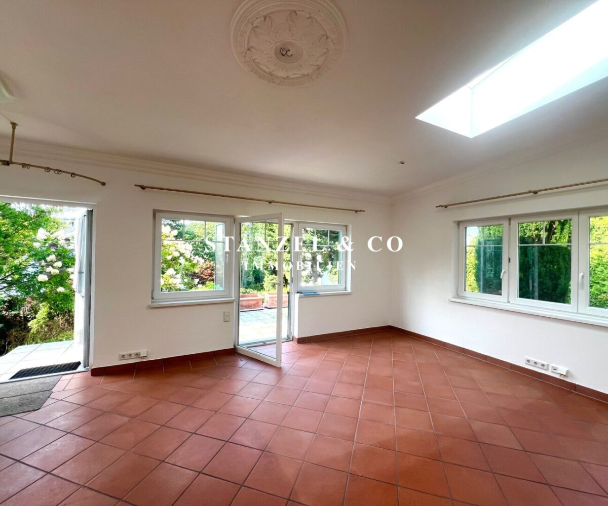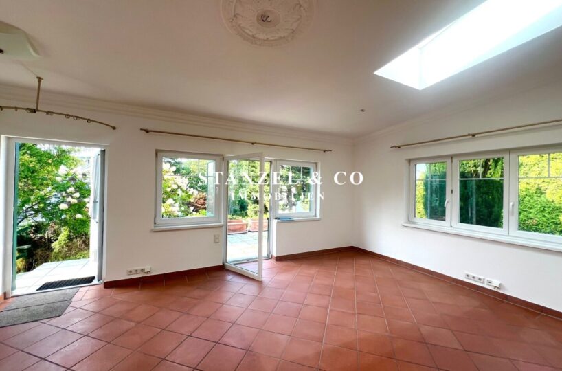 Von der 31m² großen Nordterrasse gelangt man in das 32m² großen sonnige Wohnesszimmer mit großen gartenseitigen Fenstern in Richtung Terrasse und einem Dachflächenfenster.