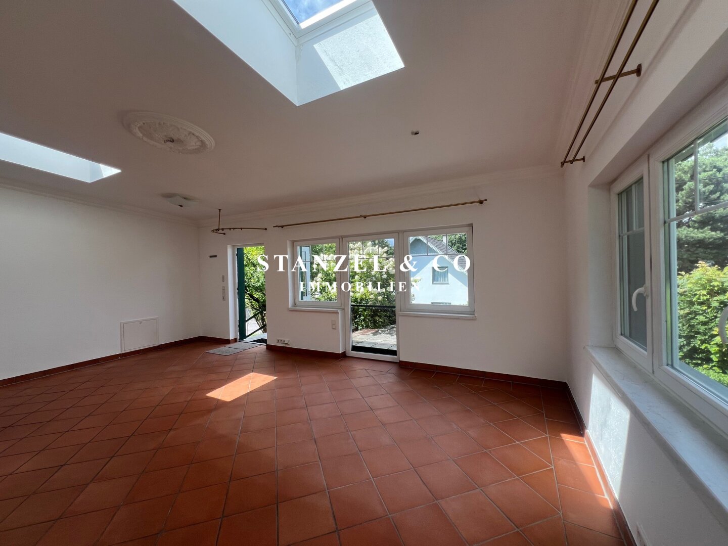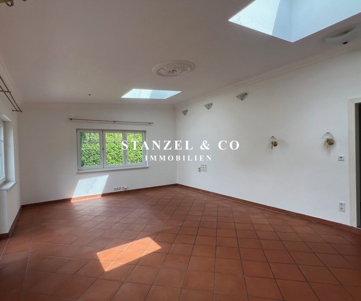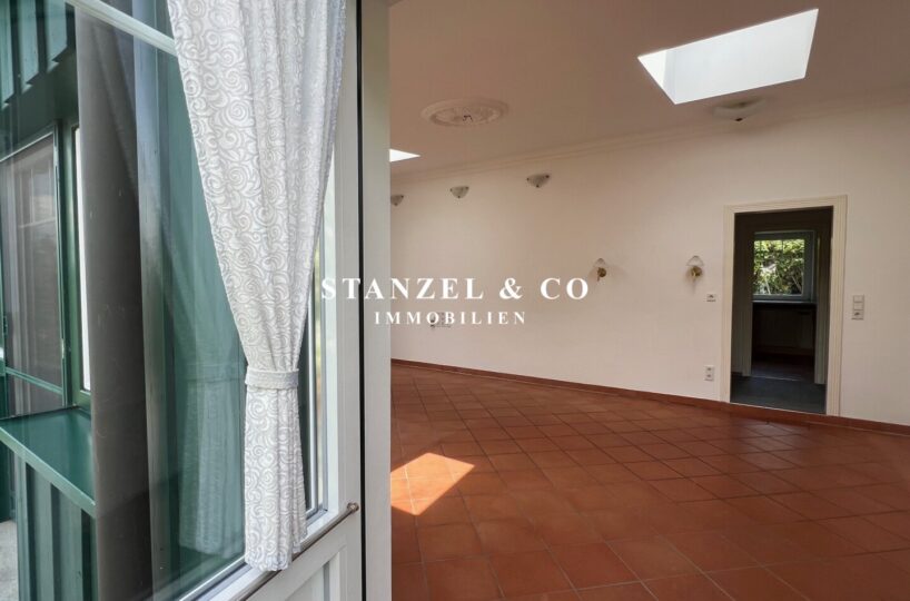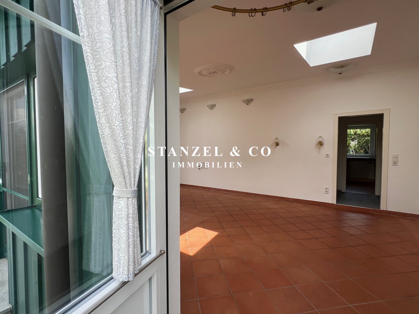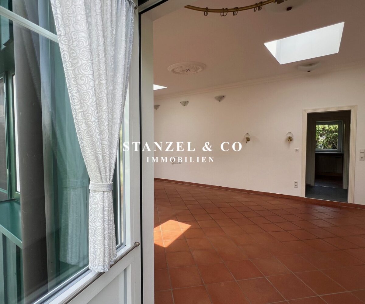 Von der 31m² großen Nordterrasse gelangt man in das 32m² großen sonnige Wohnesszimmer mit großen gartenseitigen Fenstern in Richtung Terrasse und einem Dachflächenfenster.